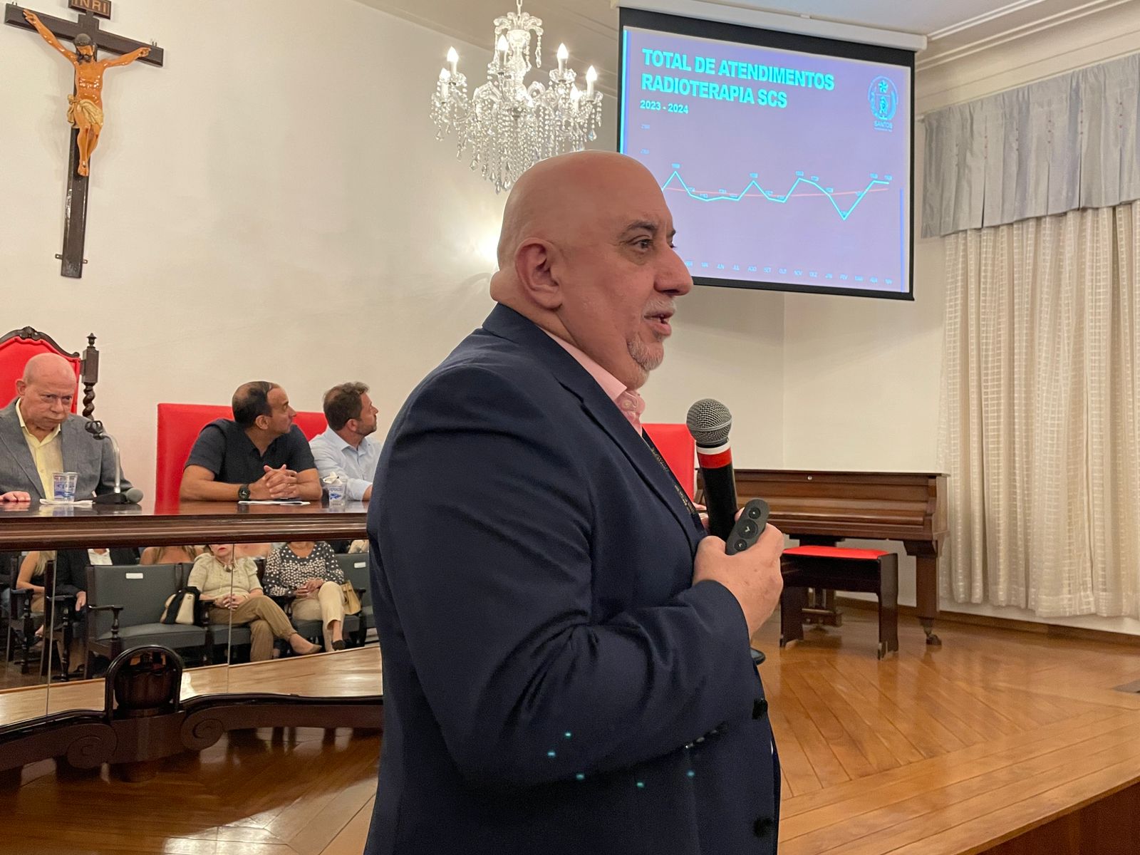 O diretor técnico da Santa Casa, Dr. Alex Macedo, e o diretor comercial, Fábio Isoldi, fizeram uma apresentação mostrando os números de casos de câncer, que aumentam anualmente, e também explicaram sobre a tecnologia do novo acelerador linear, que conta com os recursos mais avançados da atualidade (IRGT 3D), podendo tratar diversos tipos de tumores.