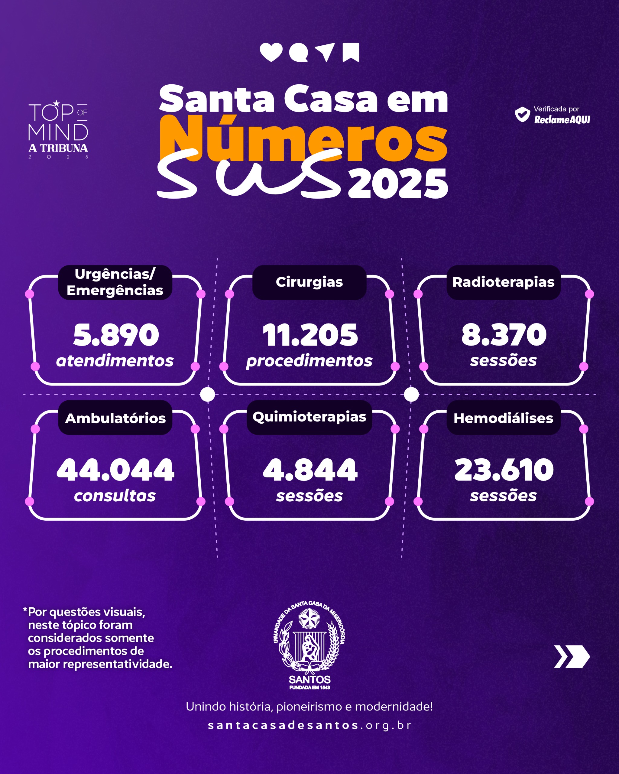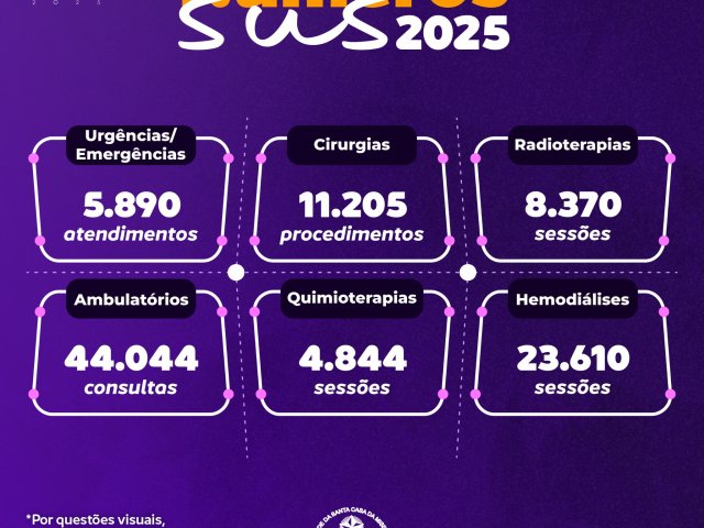 Ao todo, foram 209.286 atendimentos pelo SUS, contemplando consultas, procedimentos, exames, internações, cirurgias e terapias de alta complexidade. Os números evidenciam a relevância da Santa Casa não apenas para Santos, mas para toda a Baixada Santista, Vale do Ribeira e municípios de outras regiões do Estado de São Paulo.