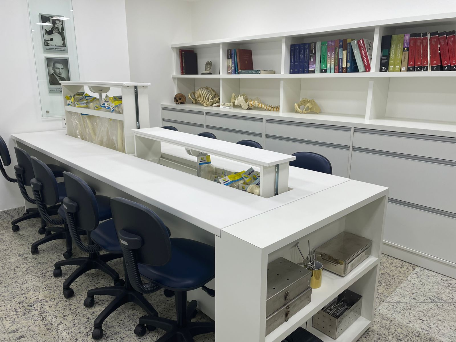 Espaço exclusivo para residentes da especialidade tem mesa de estudos inovadora, com compartimento automatizado, que facilita a prática de técnicas em protótipos e ossos sintéticos.