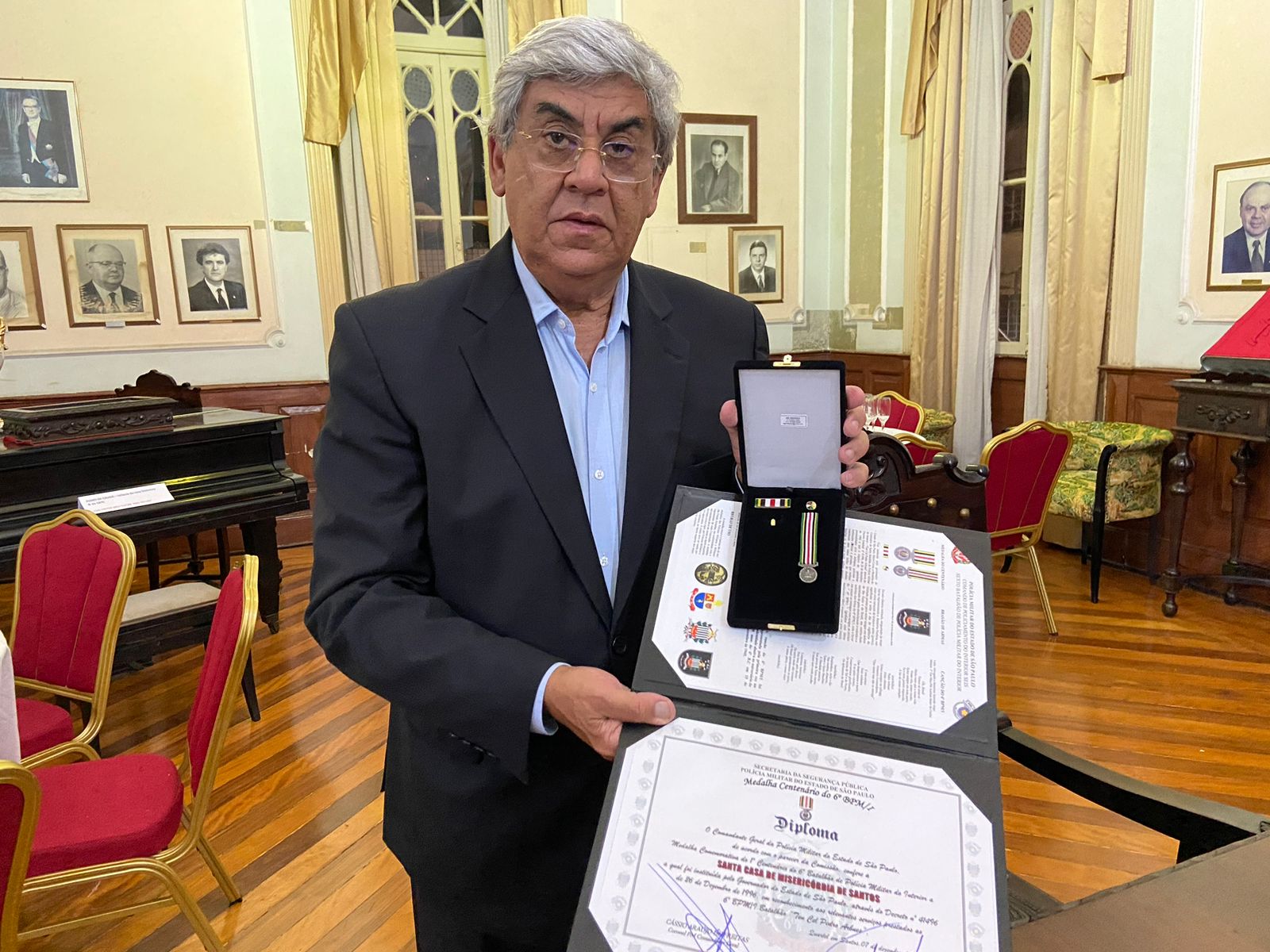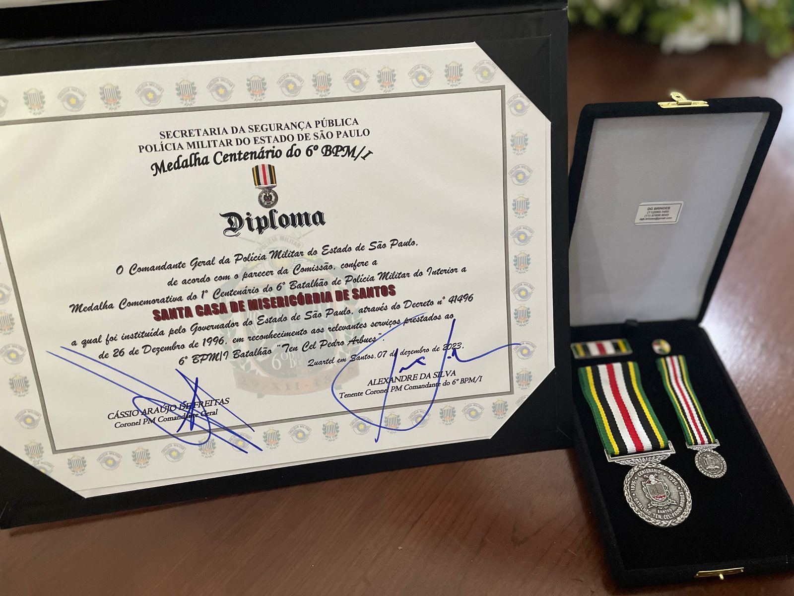 Em evento realizado na noite do dia 7 de dezembro, no Centro Português em Santos, a Santa Casa de Santos recebeu a Medalha Comemorativa do 1º Centenário do 6º Batalhão de Polícia Militar do Interior (6º BPM/I), representado pelo vice-provedor Carlos Teixeira Filho.