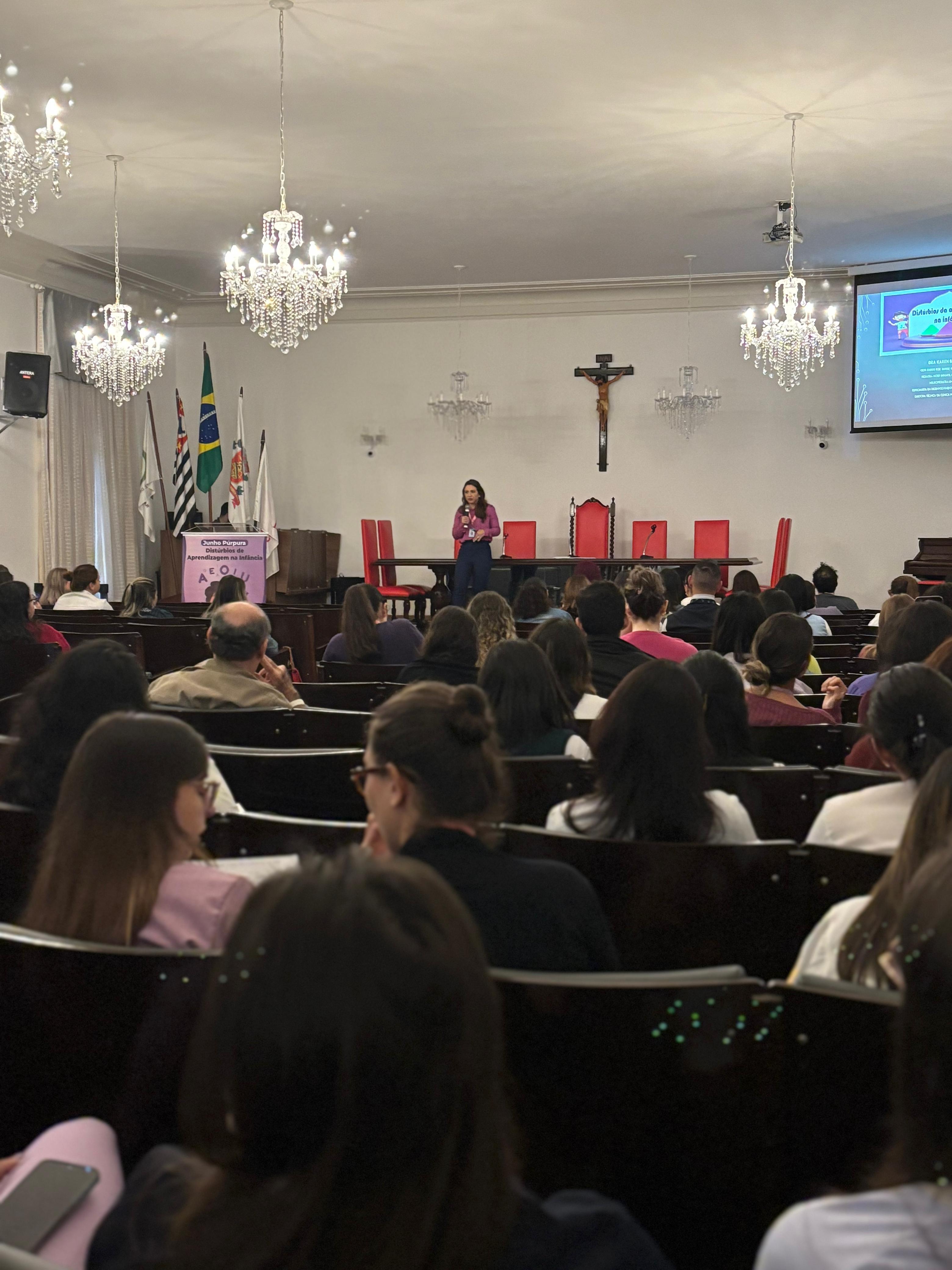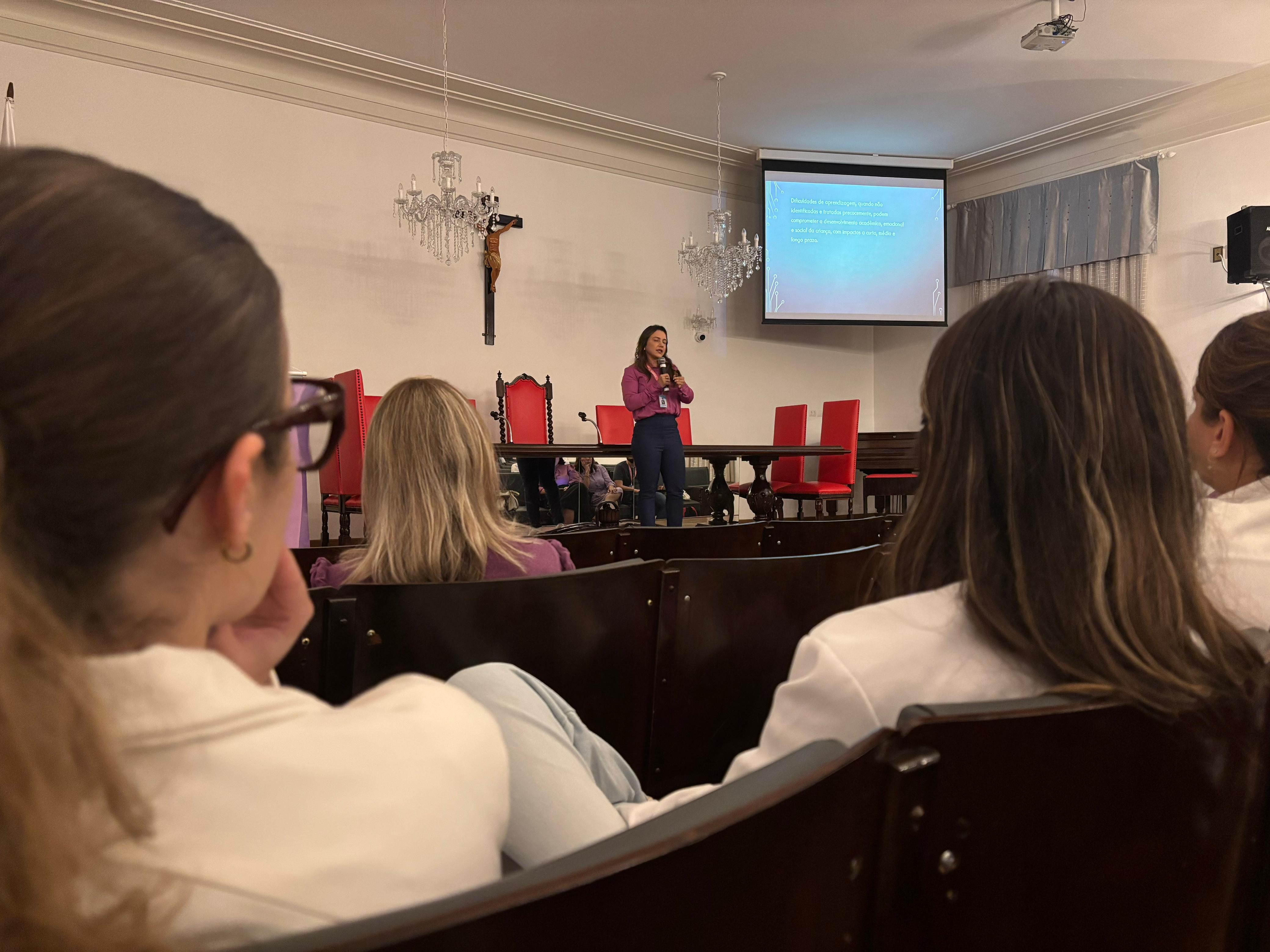 A segunda palestra foi a Neuropediatra Dra. Karen Baldin que explicou sobre os principais distúrbios como dislexia, TDAH e discalculia, seus sinais precoces e impactos emocionais. “Os principais sintomas iniciais incluem: Dislexia: dificuldade com leitura, escrita, soletração e alfabetização. TDAH: desatenção persistente, hiperatividade, impulsividade, presentes por pelo menos seis meses em múltiplos ambientes; causa impacto acadêmico e emocional. E discalculia: dificuldade significativa com operações matemáticas e raciocínio lógico. Além do rendimento escolar prejudicado, essas condições podem gerar frustração, estresse e afetar negativamente a autoestima dos pequenos”.