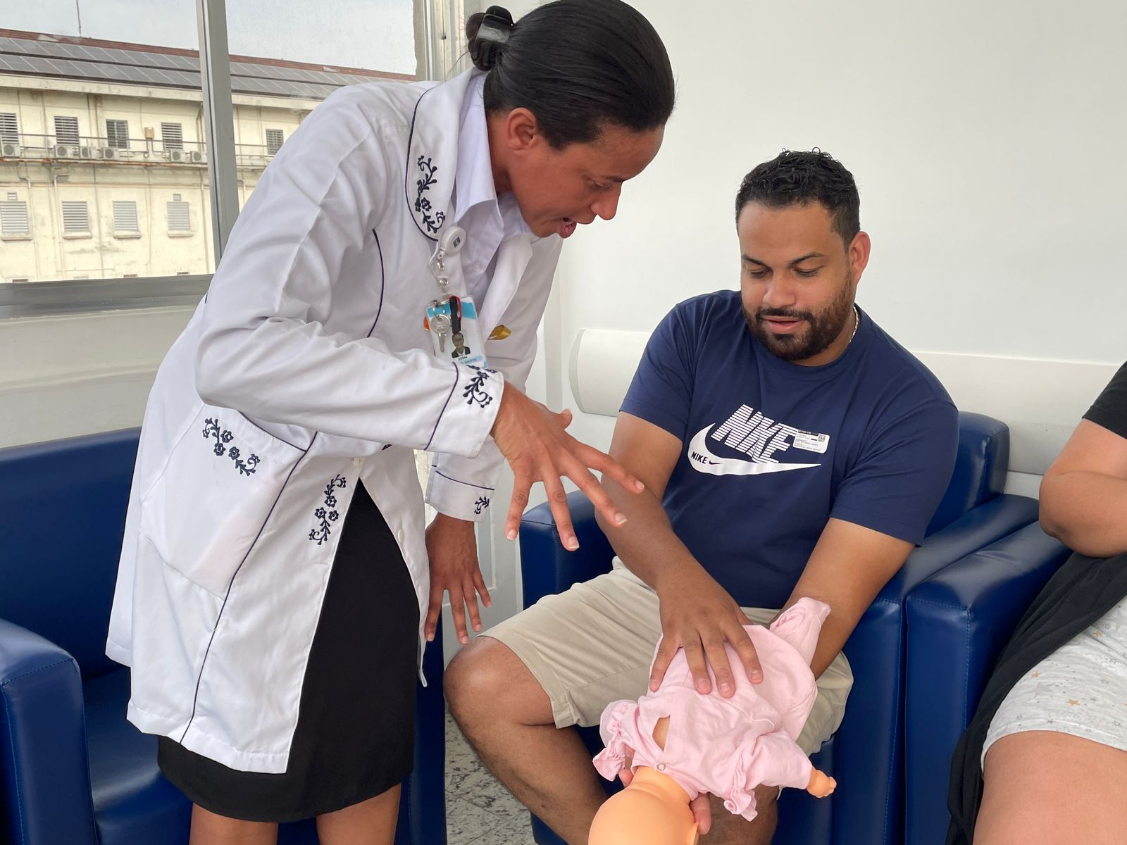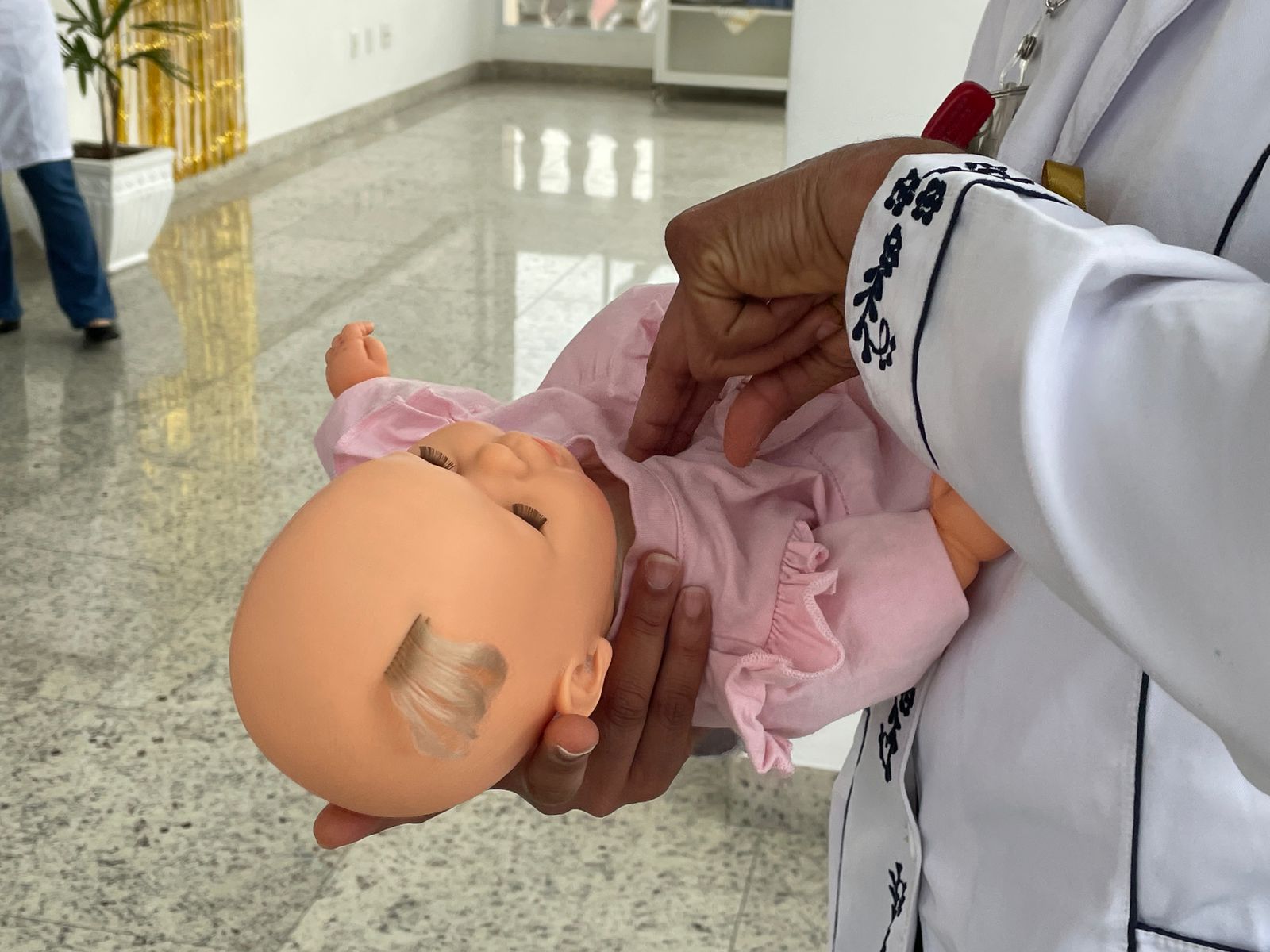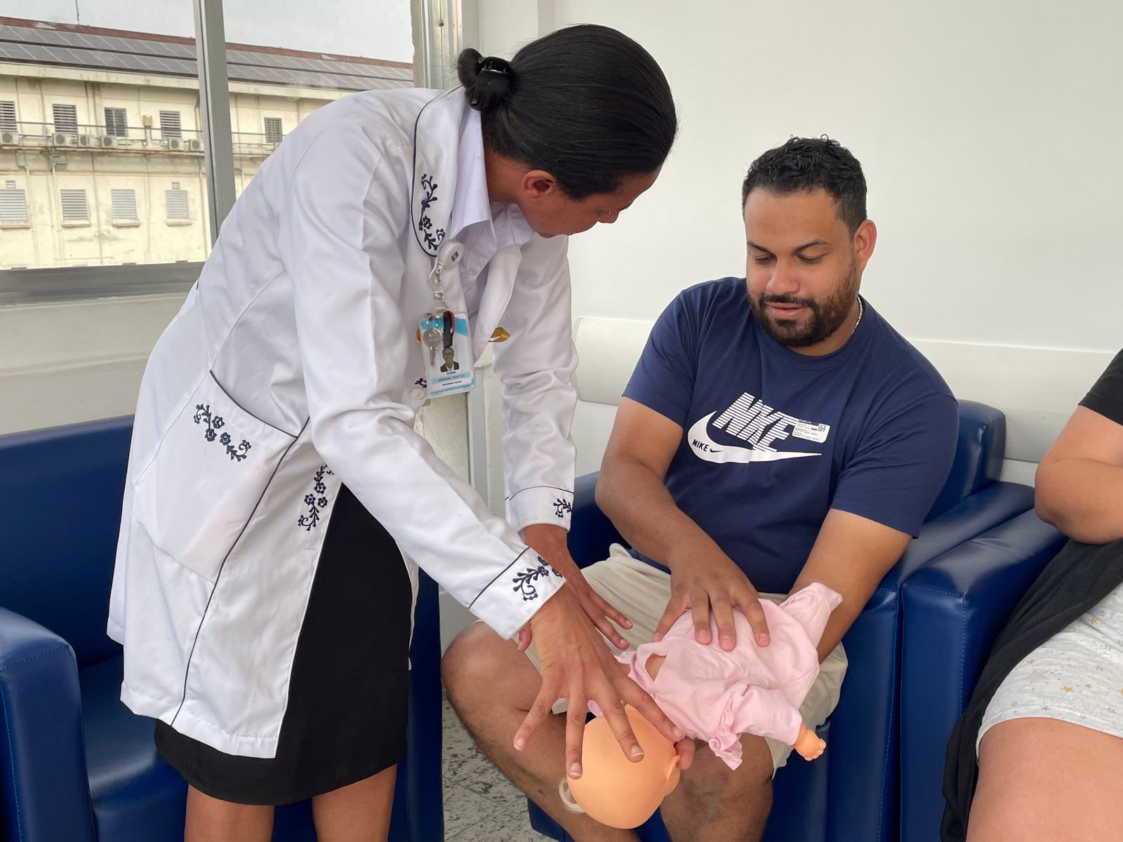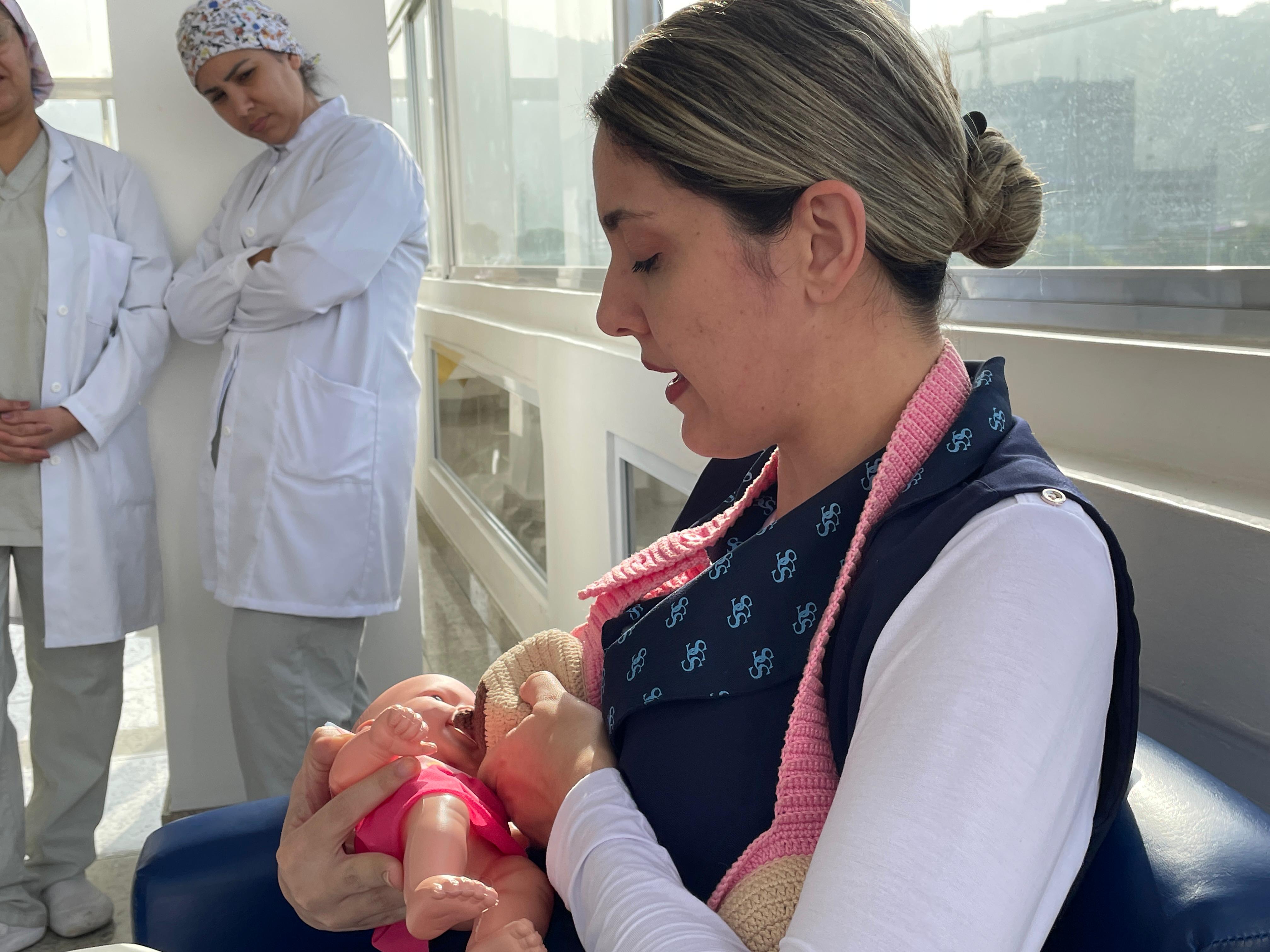 No terceiro dia de ação, foi a vez da enfermeira Adriana Silva, do setor de Educação Continuada da Santa Casa de Santos, falar sobre as manobras de desengasgo do recém-nascido. Um tema também muito importante e é um procedimento rápido de primeiros socorros para tratar asfixia por obstrução das vias respiratórias superiores.