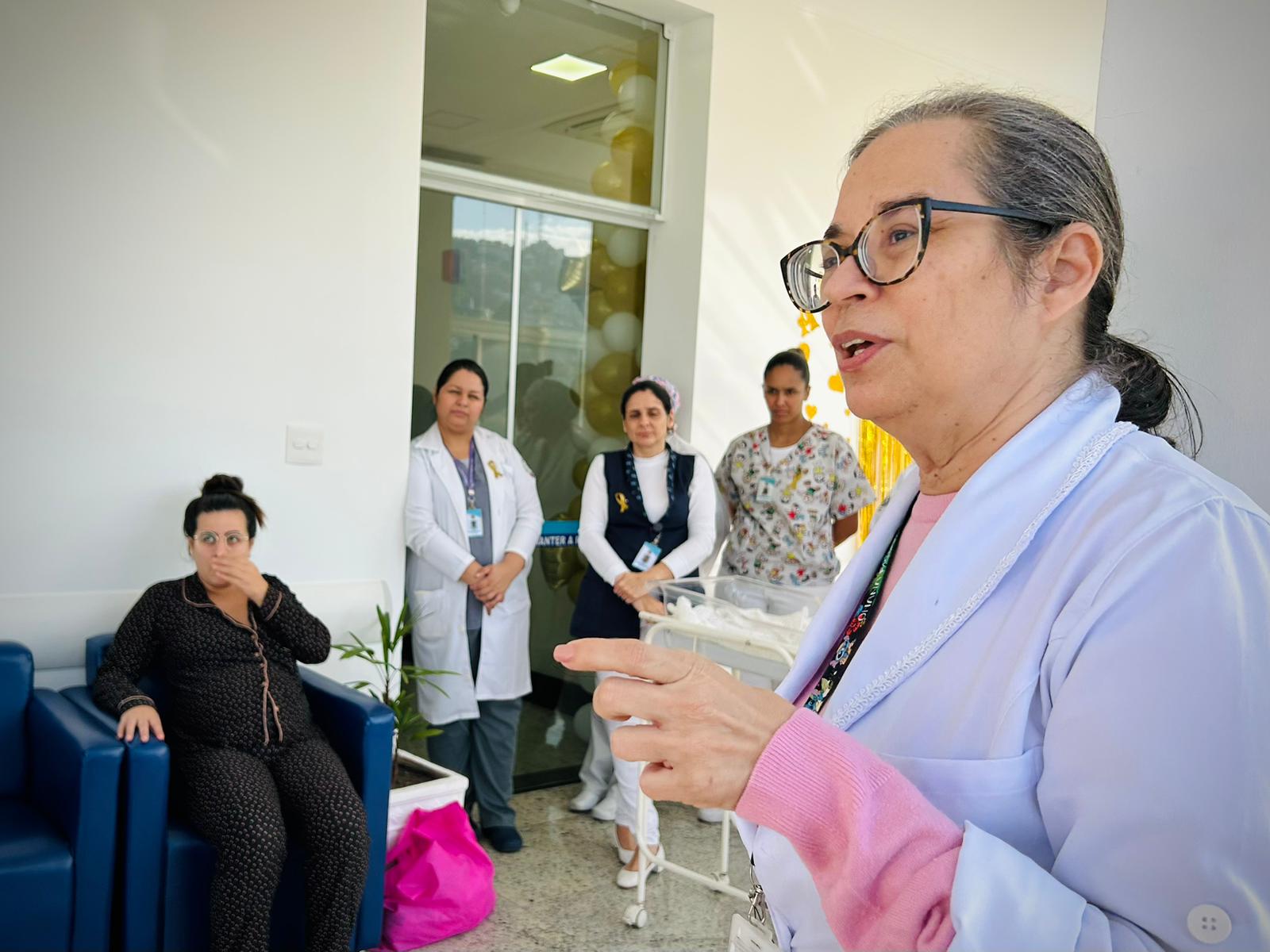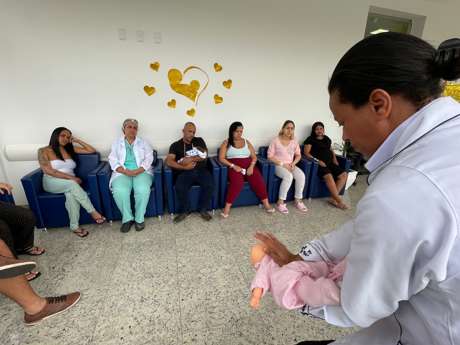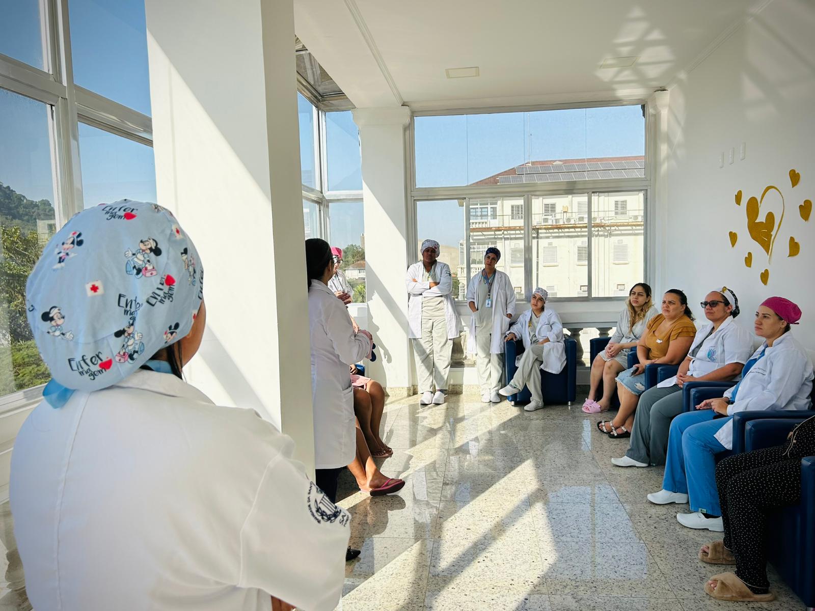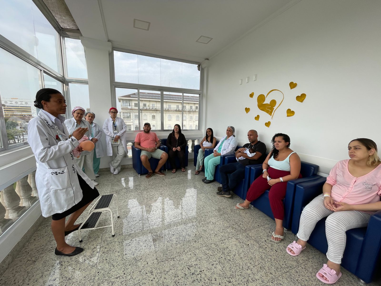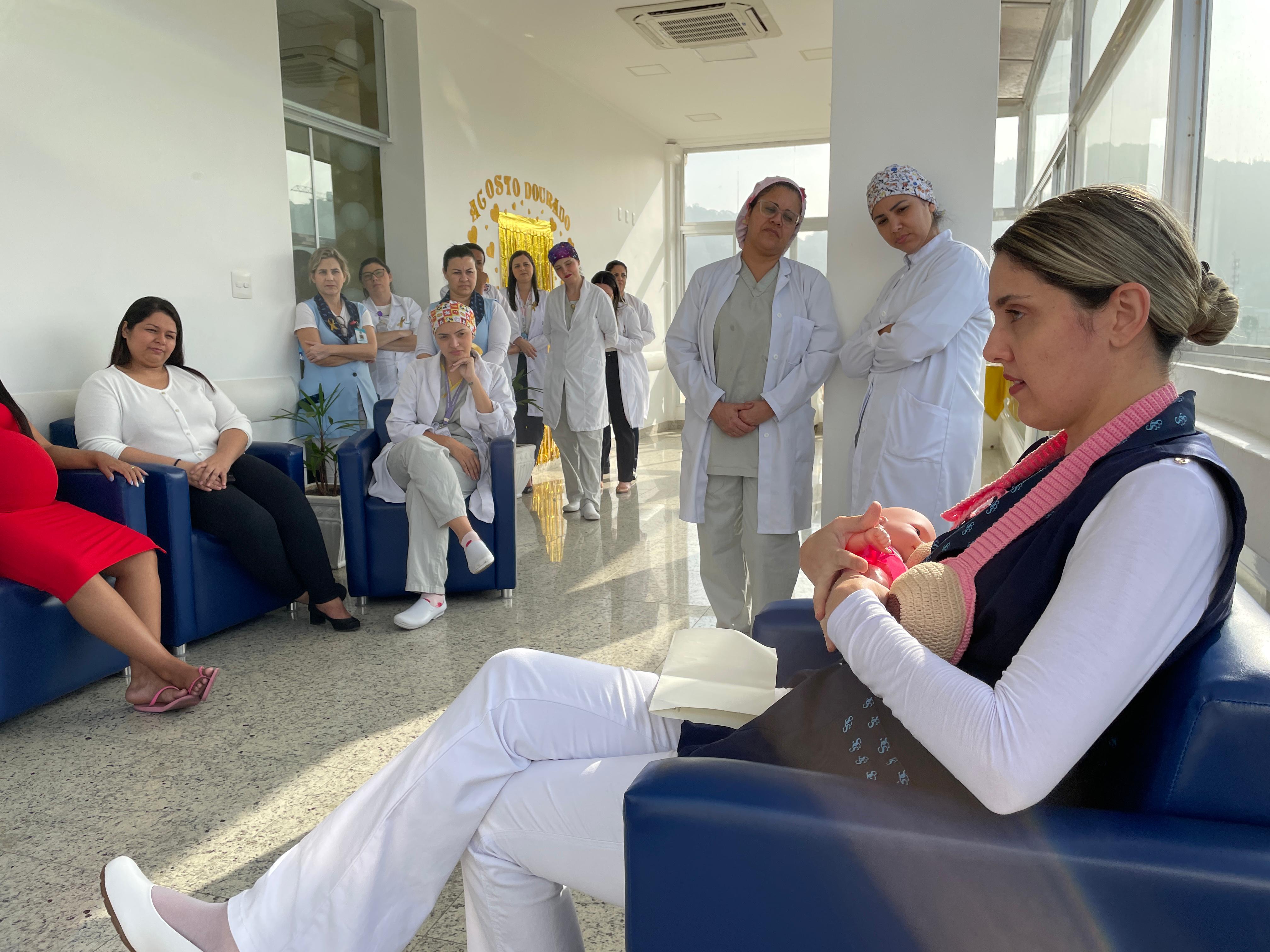Com a Maternidade toda enfeitada da cor dourada, os colaboradores fizeram diversas atividades com as recém mamães e também com as gestantes que estavam internadas. No primeiro dia, a enfermeira Edlaine Ramos, reuniu as pacientes no solarium da ala e falou sobre Aleitamento e mostrou na prática as técnicas de amamentação.