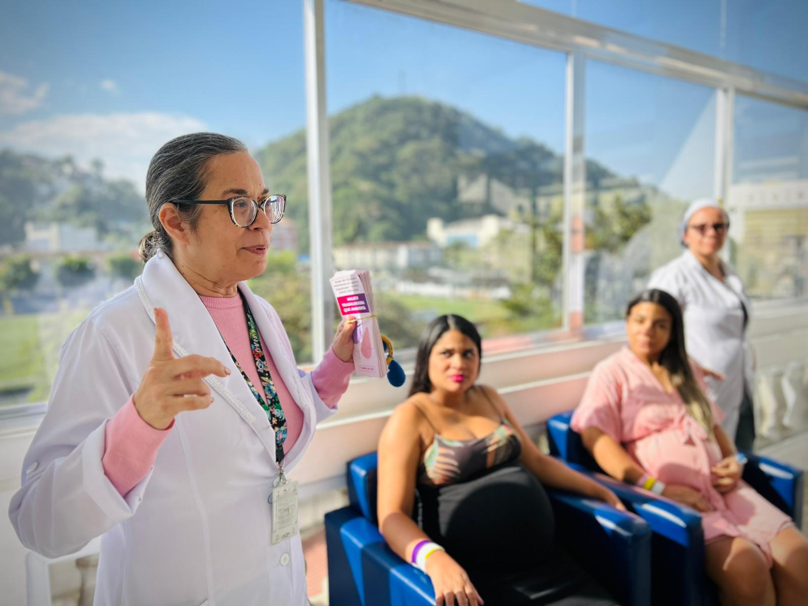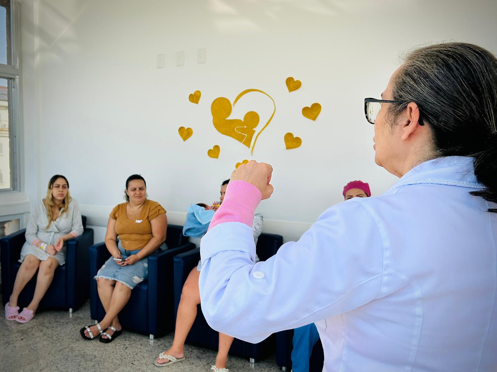 No segundo dia de ação, as mamães e gestantes da Maternidade tiveram uma palestra com a fonoaudióloga da instituição Eliane Blanco, que falou sobra a amamentação com visão realista e citou sobre as orientações fakes que aparecem na internet. Além disso, explicou que o aleitamento materno é um processo de aprendizado tanto para o bebê quanto para a mãe. E que o processo de solidificação da amamentação não é dependência única da mãe, cabe também ao acompanhante aprender e auxiliar neste processo para que o bebê seja amamentado até os seis meses, antes da introdução alimentar por via oral.