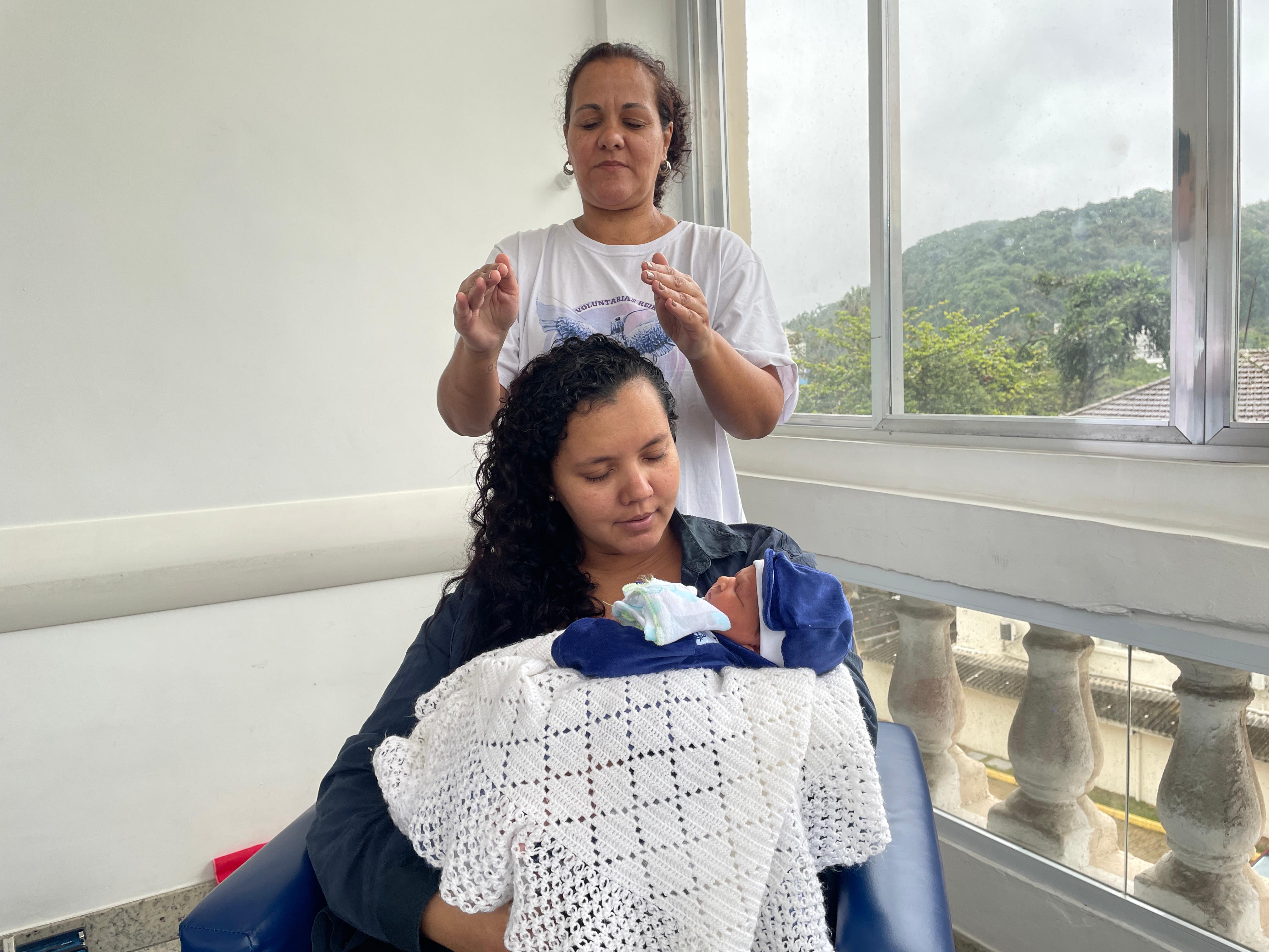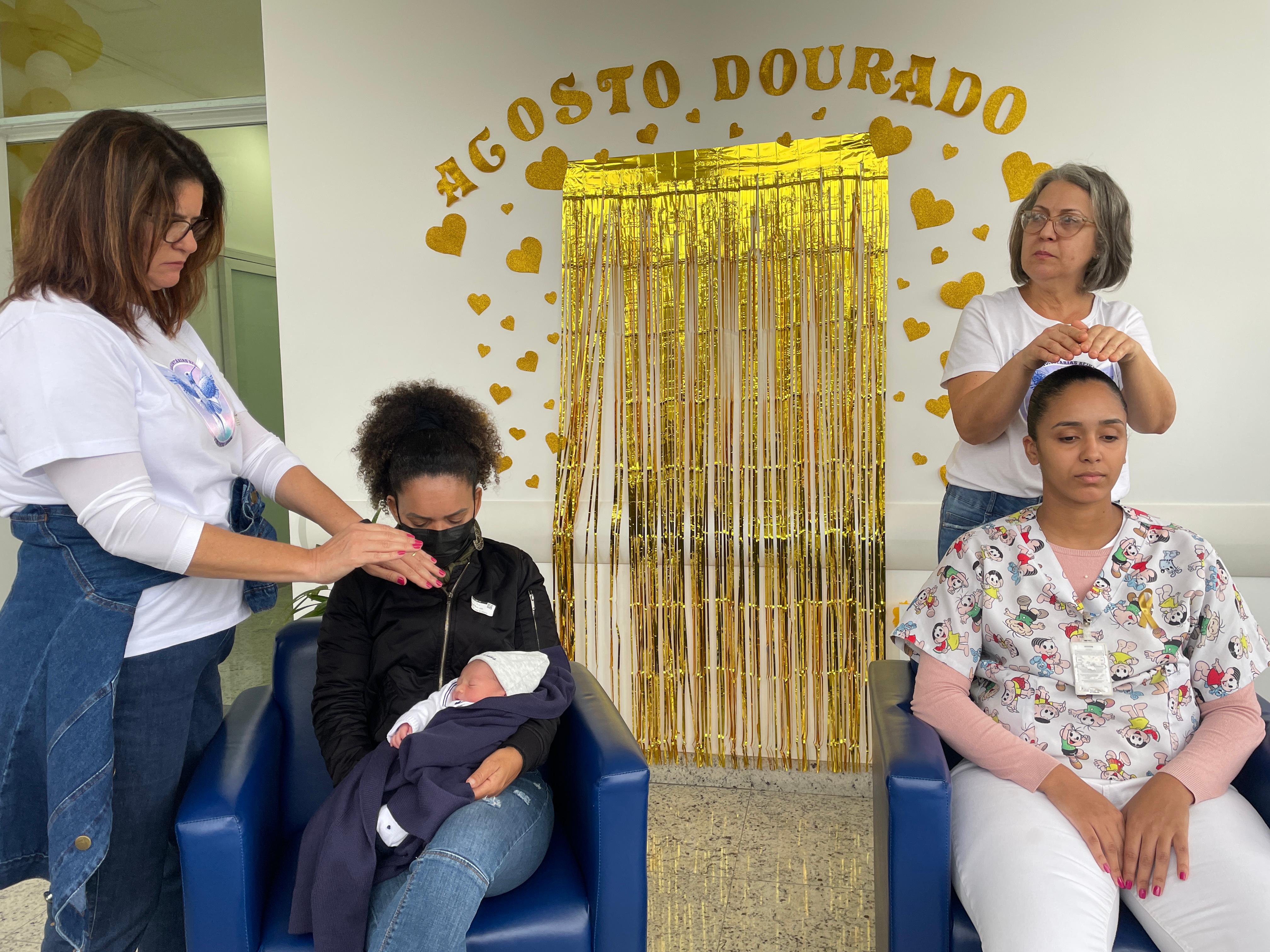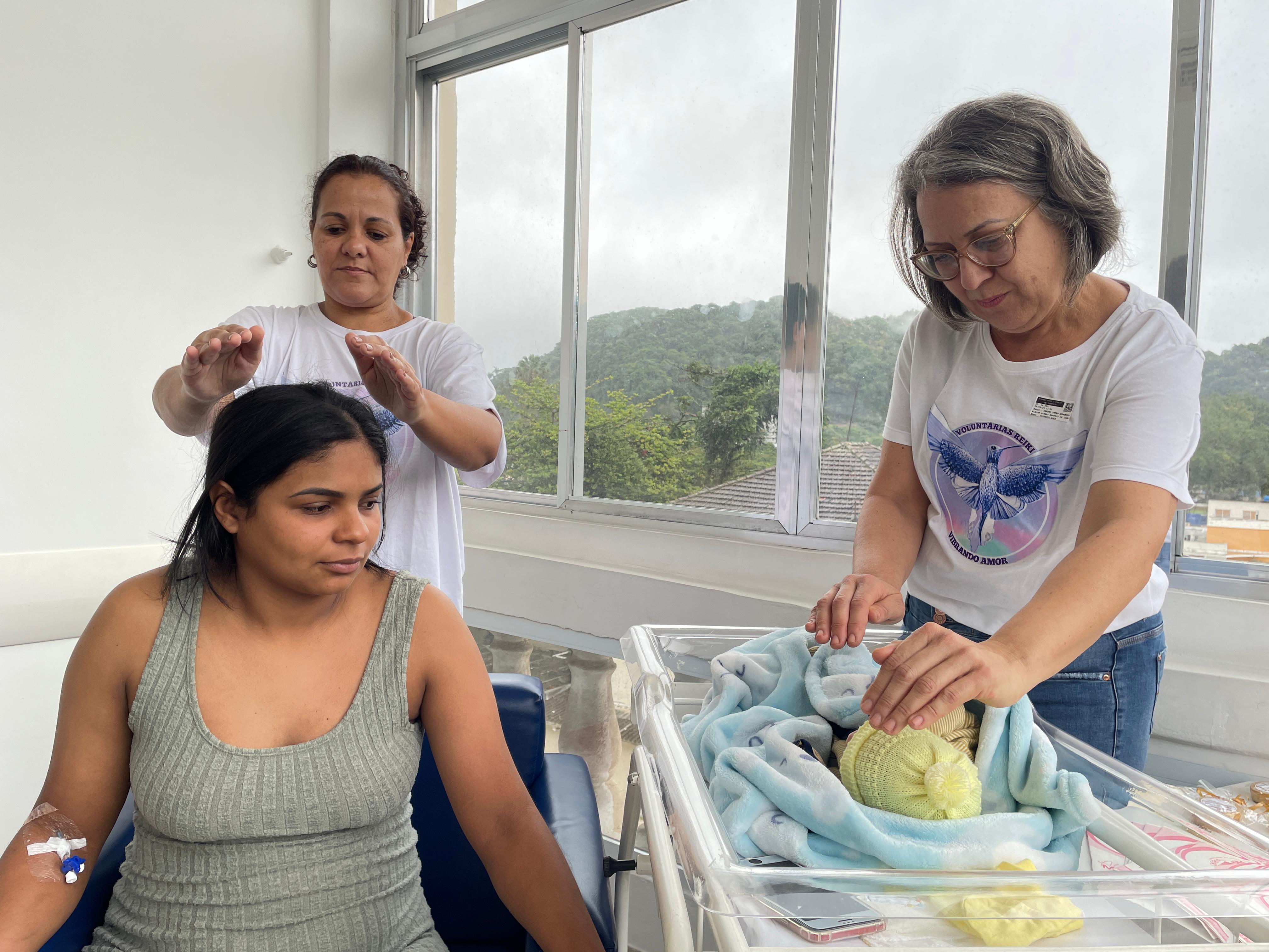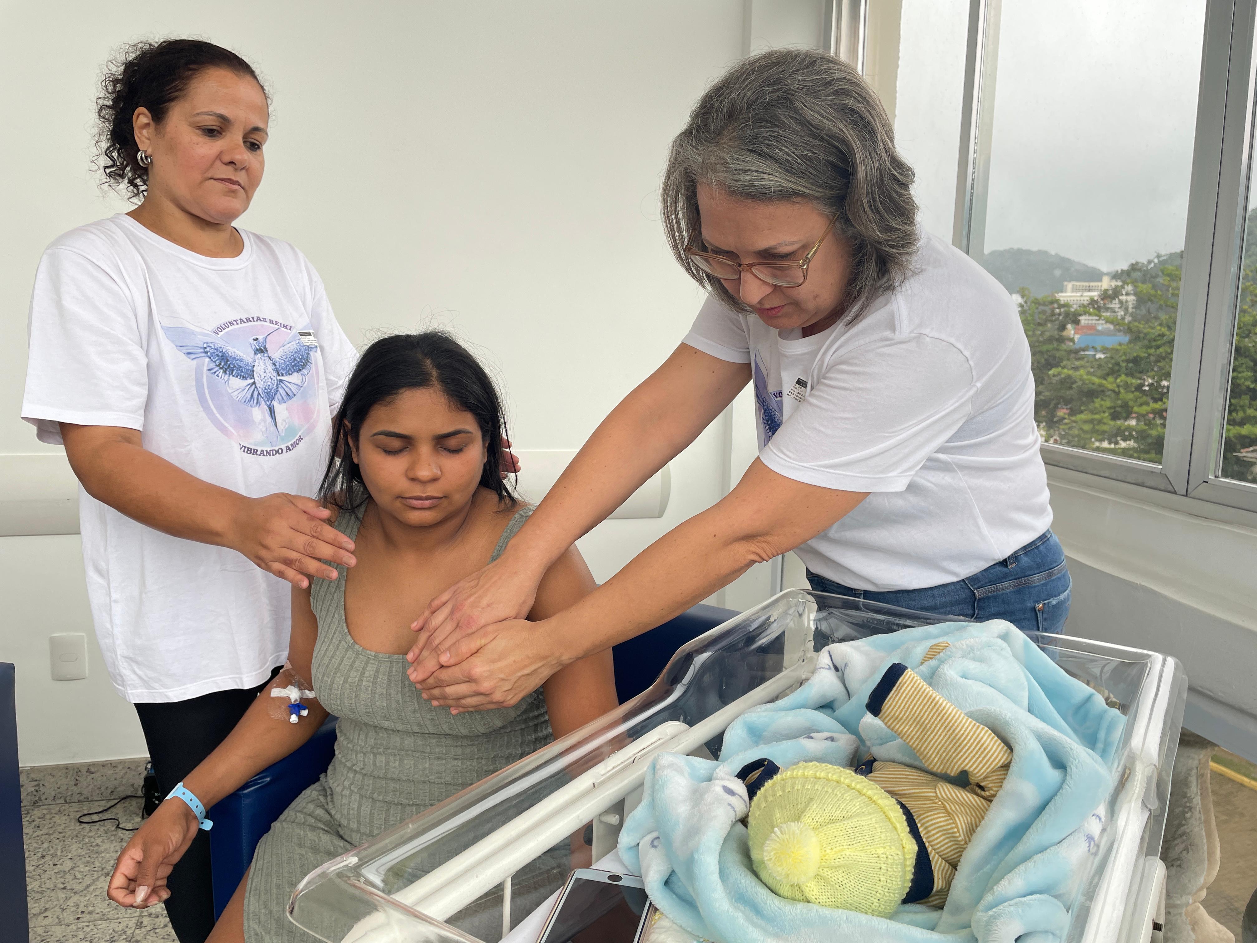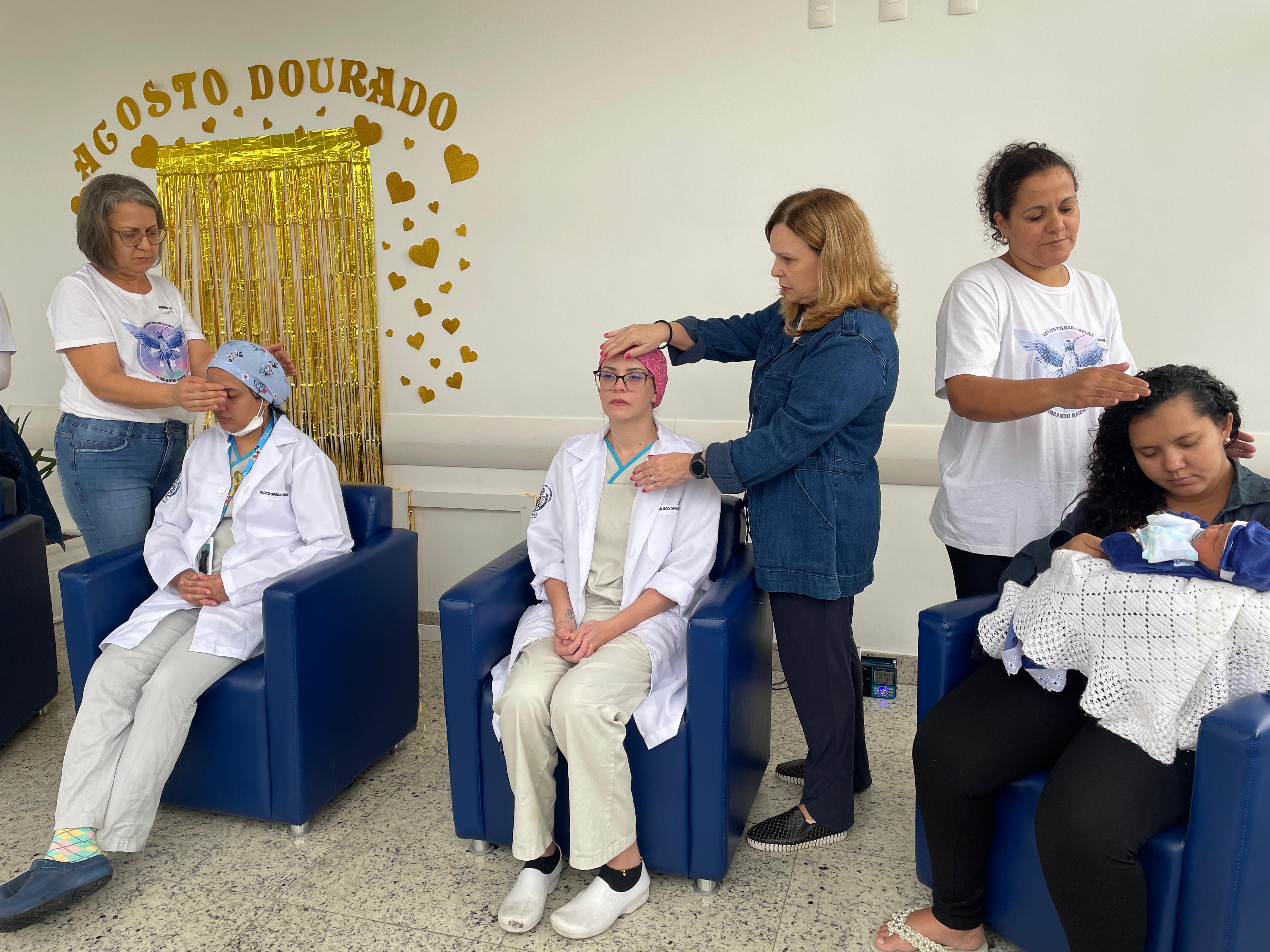 No último dia, as mamães puderam fazer sessões de Reiki, com o Grupo Vibrando Amor. O Reiki é uma terapia integrativa complementar que usa a imposição das mãos para transferir “energia vital universal” para fins curativos. Esta prática é baseada em conhecimentos orientais tradicionais, e trabalha o ser humano de forma holística (atuando nos níveis emocional, mental e físico), restabelecendo o equilíbrio energético vital. É importante destacar que o Reiki não é uma prática religiosa, não é invasivo e não tem contraindicações ou efeitos adversos.