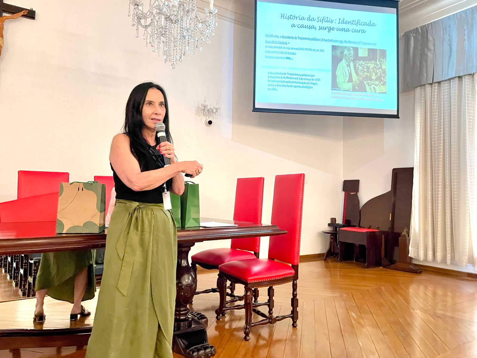 A primeira palestra foi com pediatra neonatologista, Drª Josiane Q. Xavier Castro, que falou sobre a história da sífilis na humanidade, explanando sobre o contexto social vivido à época do início da doença até os tempos atuais. Drª. Josiane apresentou dados sobre a incidência de sífilis congênita, inclusive regionais, e também falou como o pediatra pode intervir na diminuição da doença.