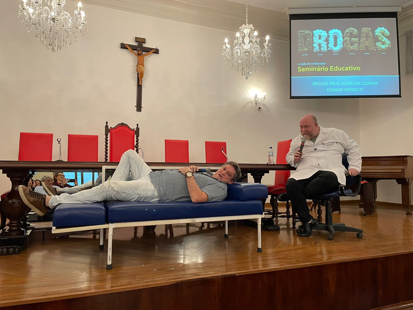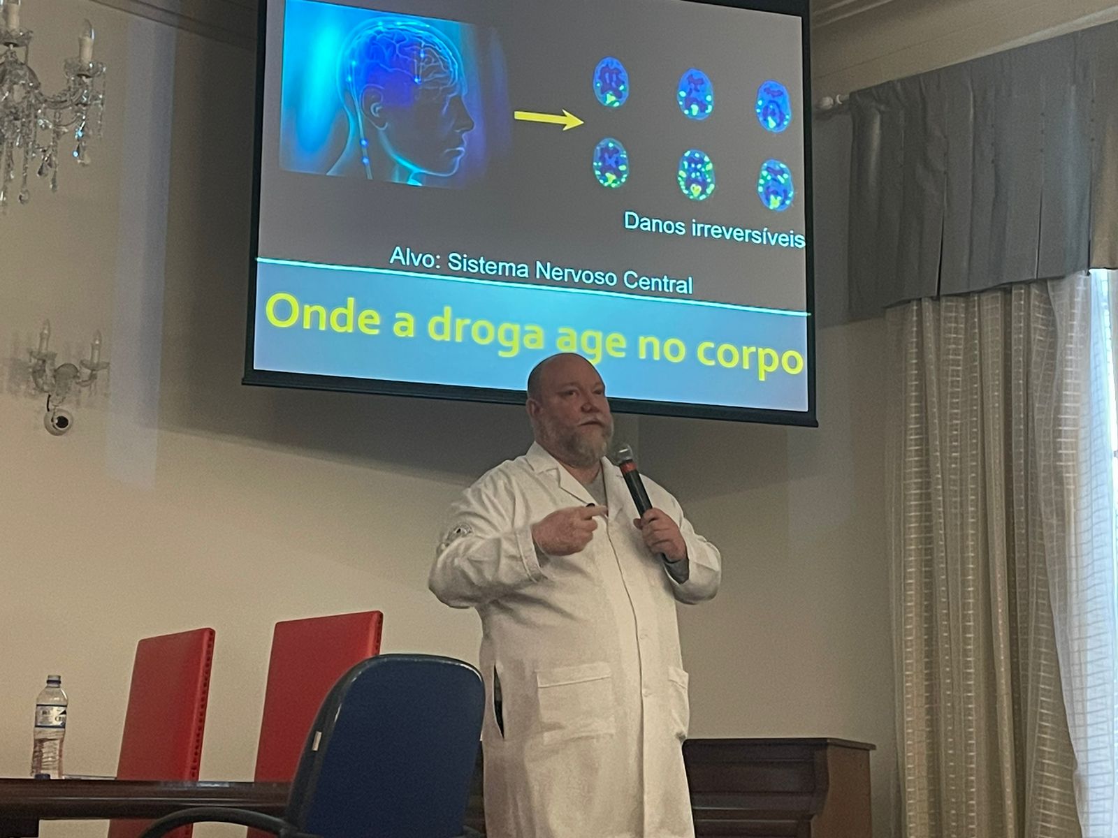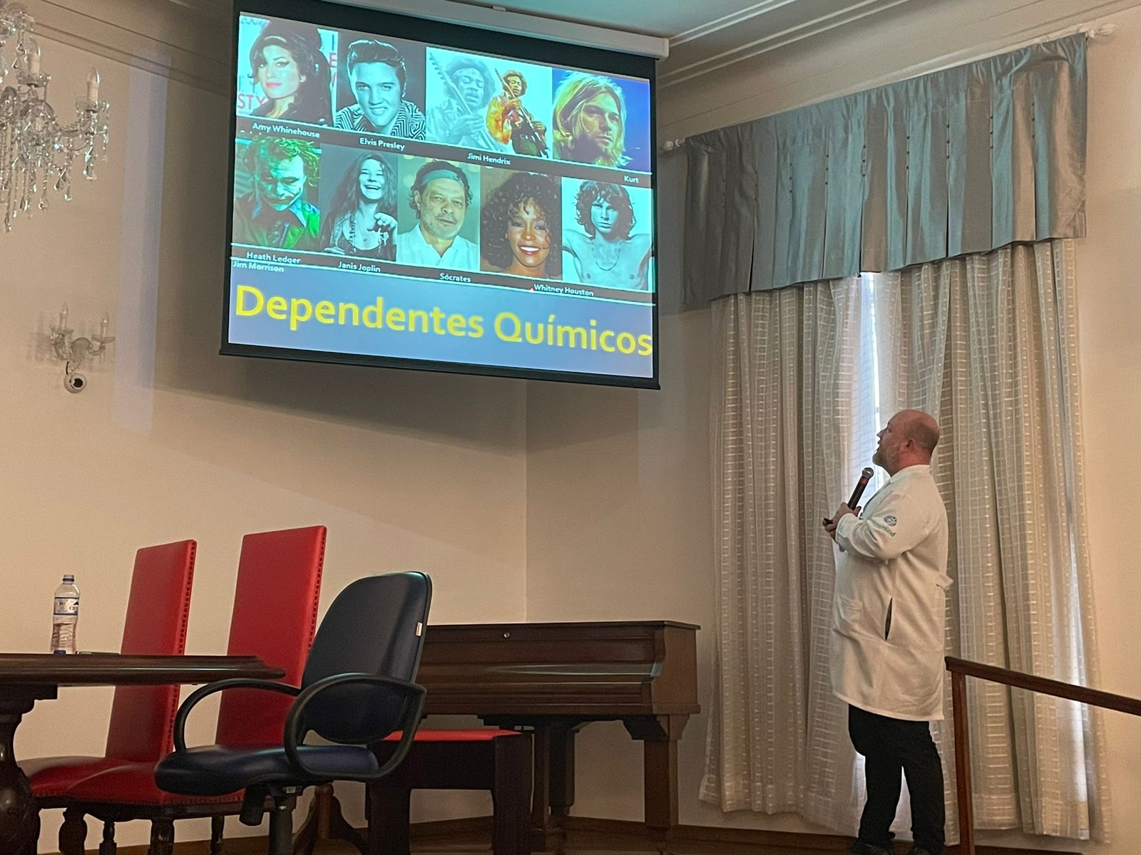 Após o “teatro”, o Dr. Bruno Reis iniciou sua palestra abordando o tema do ponto de vista médico, e também recordou alguns ícones da música e cinema que perderam a vida devido ao vício nas drogas.