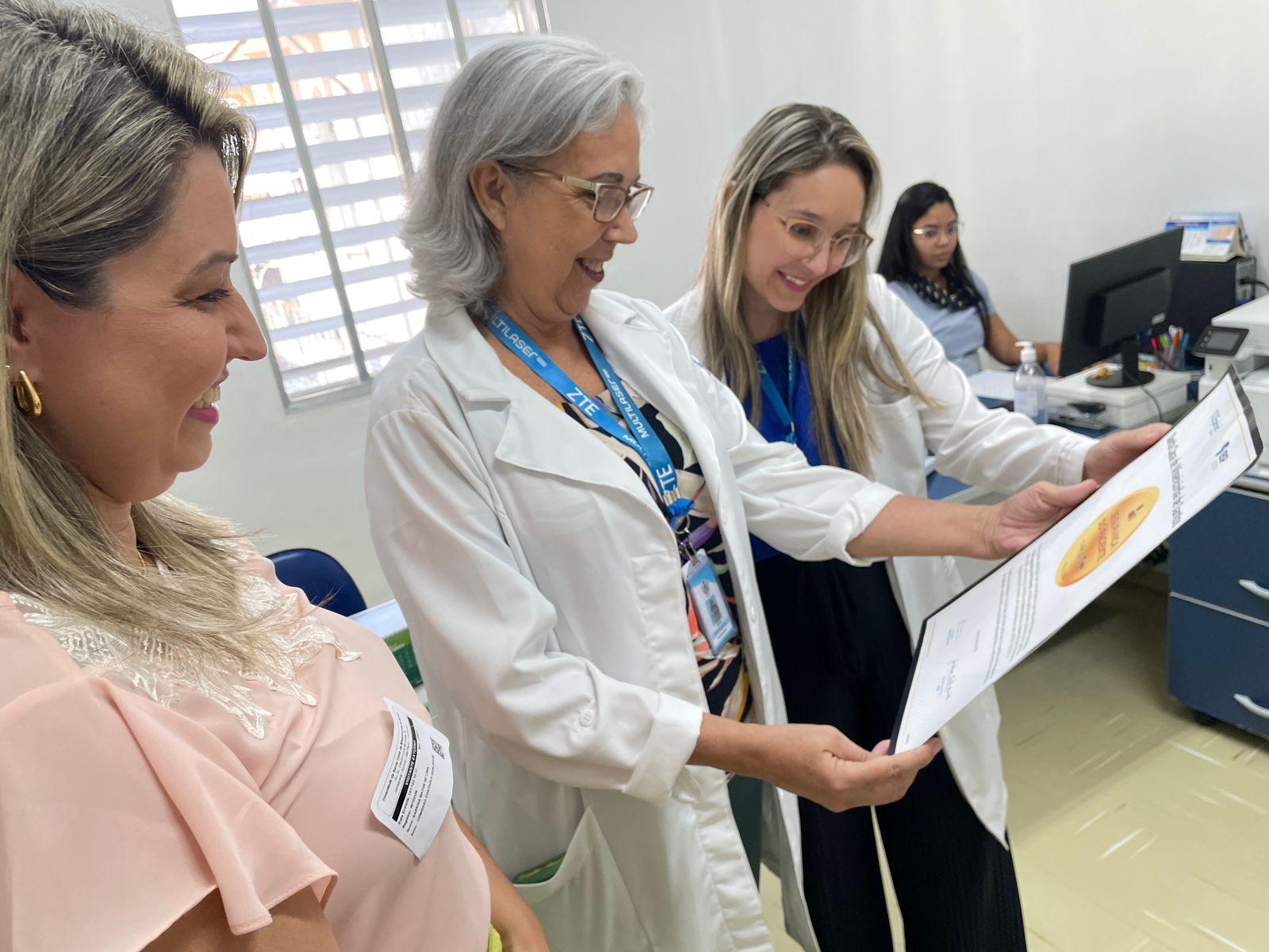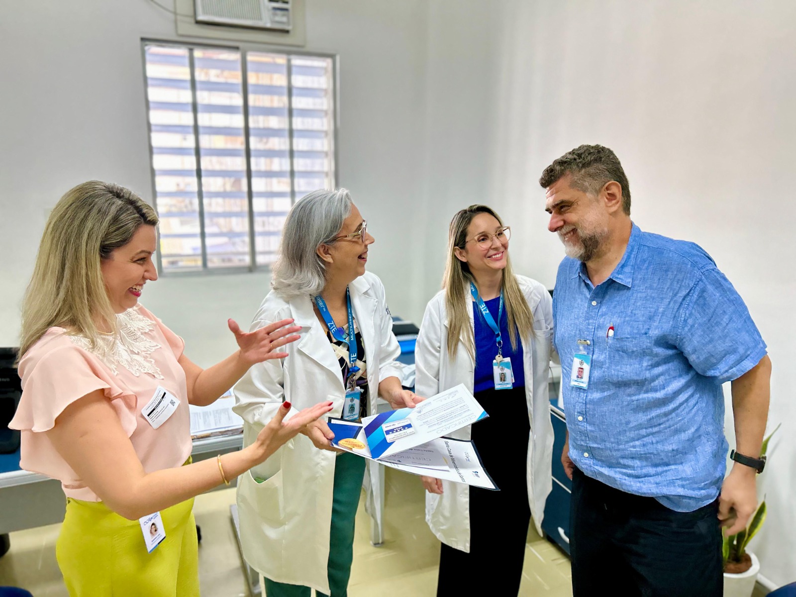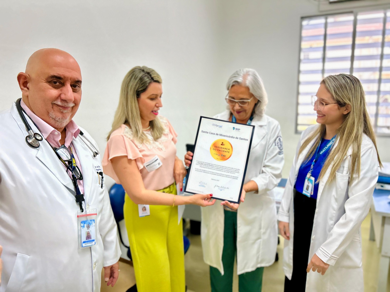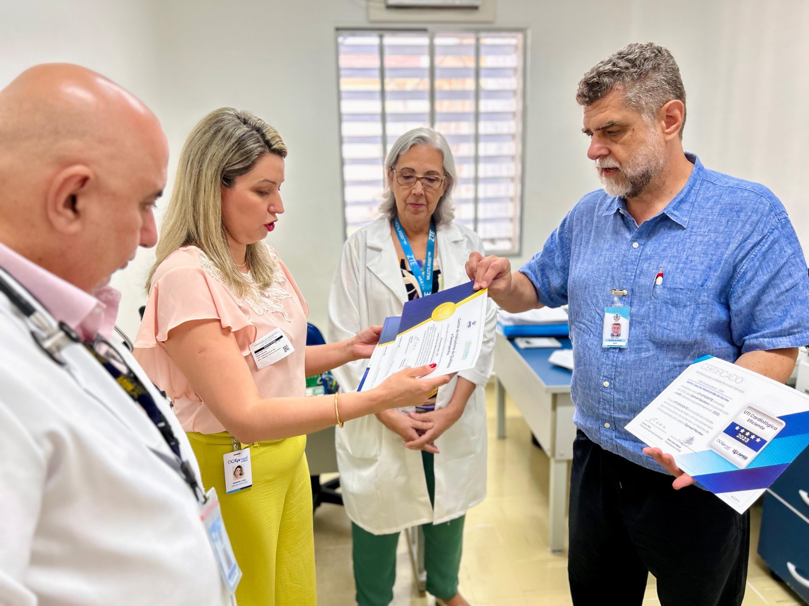 A formalização da entrega dos certificados aconteceu no dia 14/11/23, na diretoria técnica, com as presenças do diretor técnico, Dr. Alex Macedo; do médico intensivista Dr. Edwin Koterba; e das representantes do Núcleo de Segurança do Paciente, Enfª. Márcia Torelli e Enfª. Amanda Antunes. Os selos foram entregues pela gerente comercial da Epimed, Sabrina Lima.