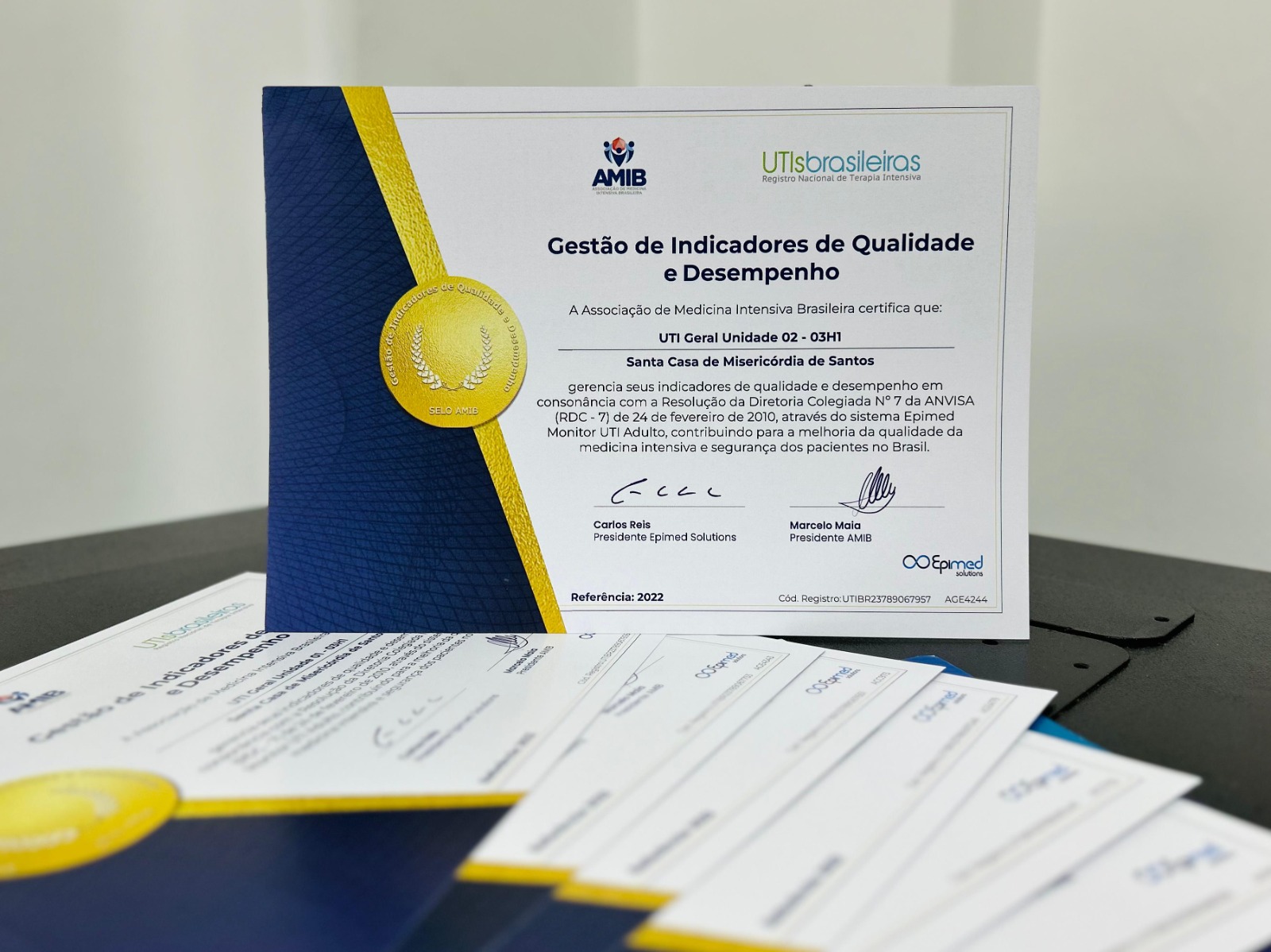 Certificação da AMIB –Associação de Medicina Intensiva Brasileira e Selo de Segurança do Paciente foram entregues pela Epimed Solutions à diretoria técnica da instituição nesta terça, dia 14/11.