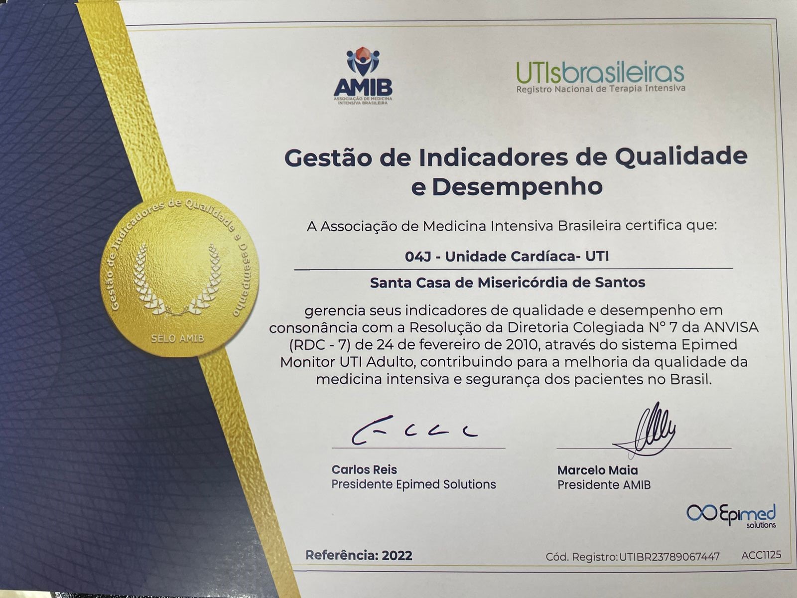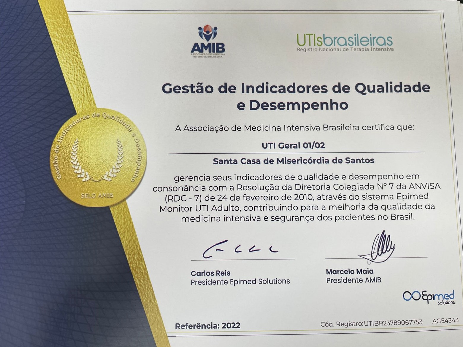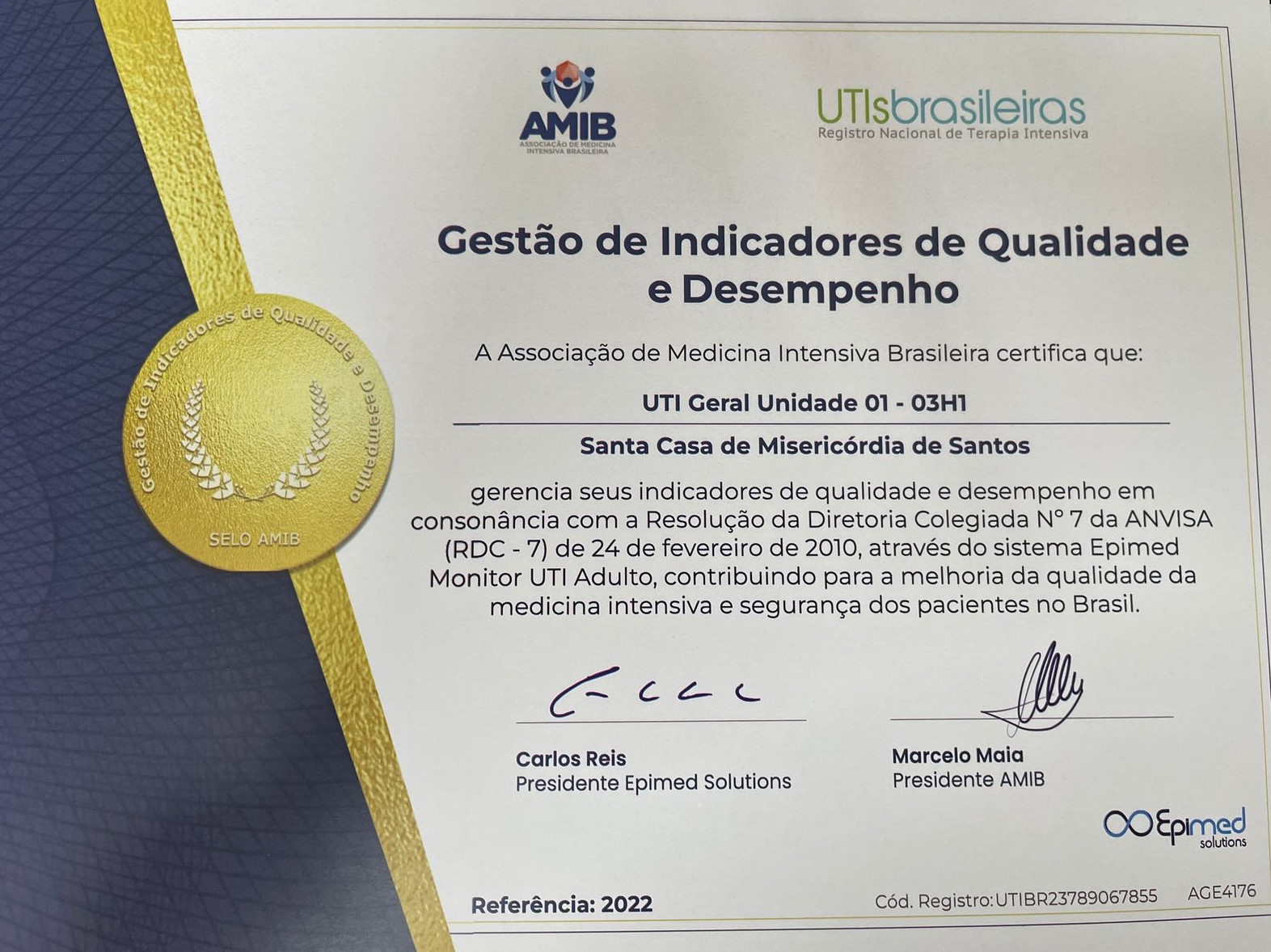 Qualidade e desempenho foram os principais quesitos que deram às Unidades de Terapia Intensiva da Santa Casa de Santos o reconhecimento para a certificação da Associação de Medicina Intensiva Brasileira - AMIB. O importante selo de qualidade foi conquistado através do sistema Epimed Monitor, com a avaliação de indicadores em consonância com a Resolução da Diretoria Colegiada Nº7 da ANVISA (RDC-7).