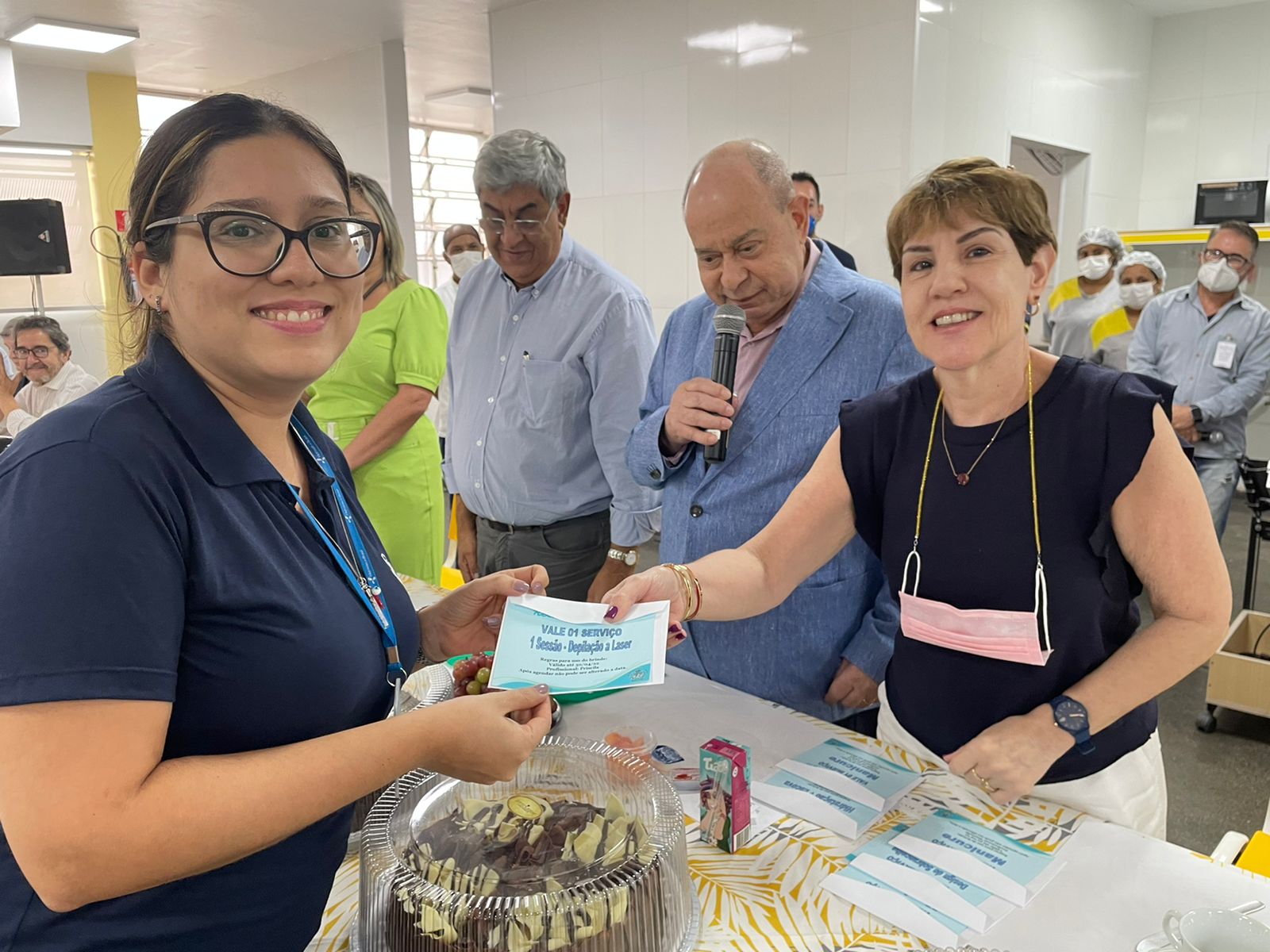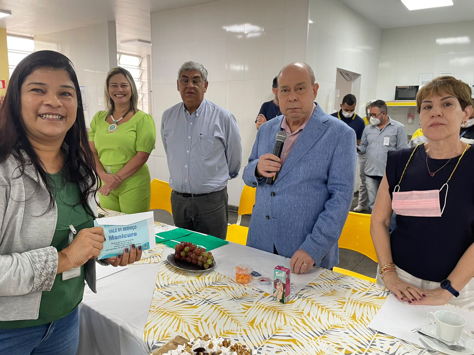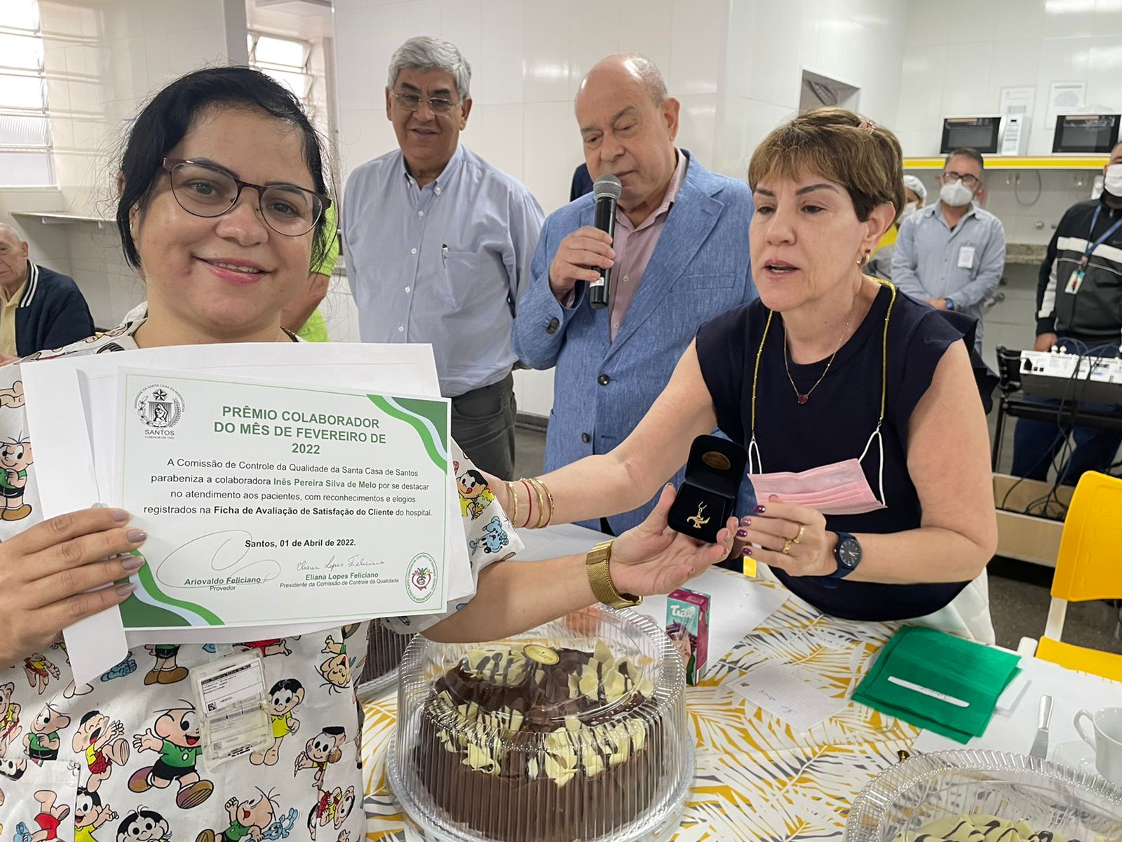 Os colaboradores mais elogiados foram chamados à frente para receber os cumprimentos e o certificado que congratula o profissional pelo destaque na assistência. A Técnica de Enfermagem Inês Pereira Silva de Melo foi destaque pela 4ª vez, e ganhou uma joia em ouro, que foi entregue pela presidente da C.C.Q. Eliana Lopes Feliciano, em reconhecimento pela excelência no atendimento.