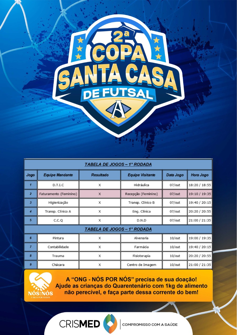 Sucesso entre os funcionários na 1ª edição realizada no ano passado, a 2ª Copa Santa Casa de Futsal começa nesta sexta, dia 7/10, às 18h, na Abrescas. Ao todo, são 18 equipes participantes, sendo 16 times masculinos e 2 times femininos.