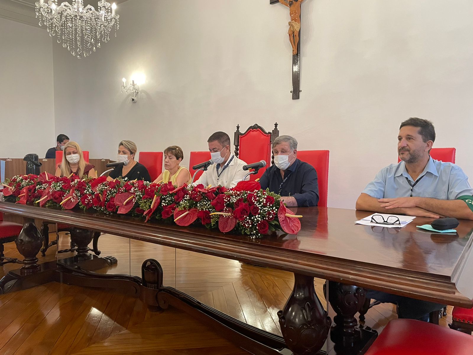 Convidados para compor a mesa para abertura da SIPAT, tomaram lugar: o diretor Médico, Rogério Dedivitis, o diretor de Apoio, Octavio Tavolaro Filho, a presidente da C.C.Q., Eliana Lopes Feliciano, a supervisora do R.H., Priscila Marques, a vice-presidente da CIPA, Kelly Cristine, e o presidente da CIPA, Ricardo Guarmani.