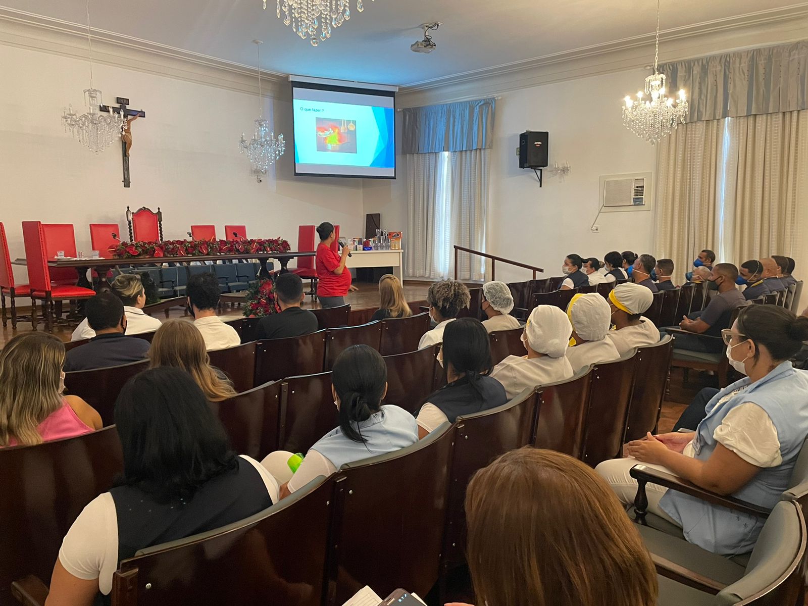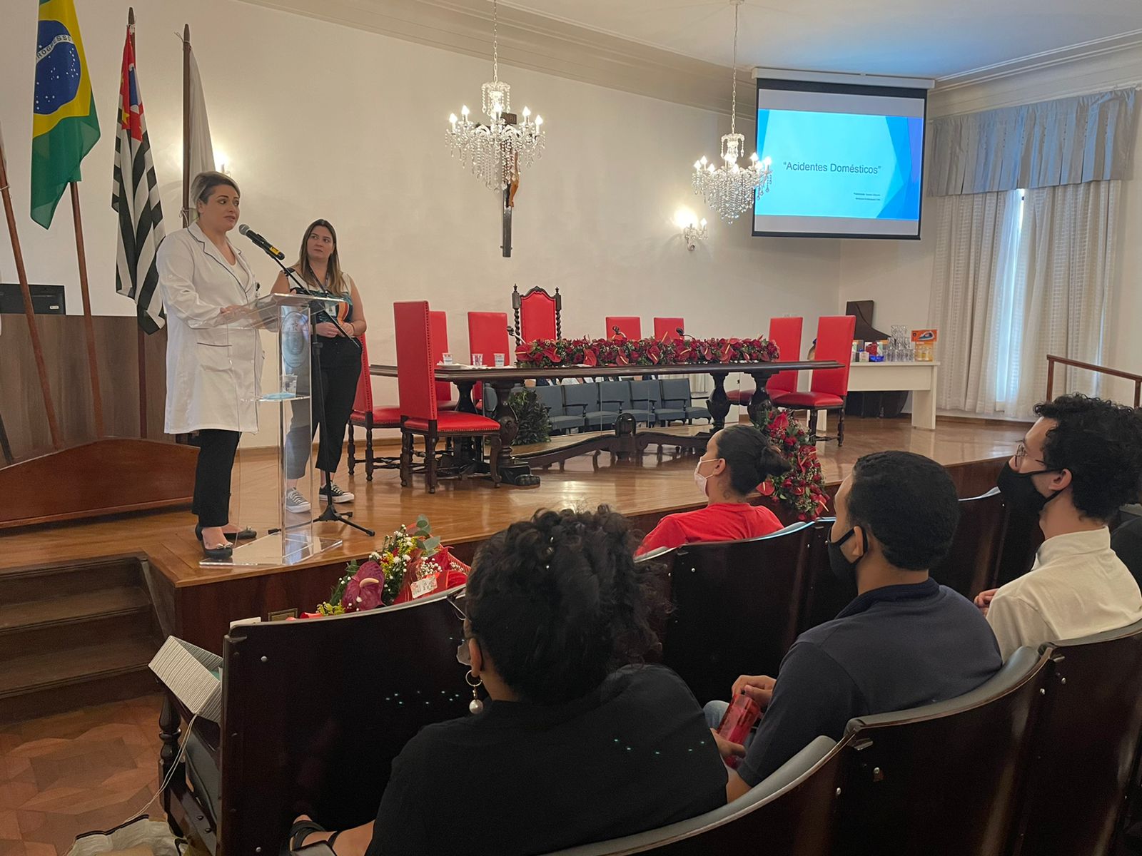 A primeira palestra foi ministrada pela Bombeira Civil da Santa Casa, Suelen Ribeiro, que abordou sobre “Acidentes Domésticos”. Dentro deste contexto, Suelen alertou para as situações do cotidiano que merecem mais atenção, e mencionou exemplos como: subir em cadeiras para limpar janelas ou móveis, fogo em panelas, queimaduras e seus vários tipos (térmicas, químicas, por eletricidade) e suas classificações (1º, 2º e 3º graus).