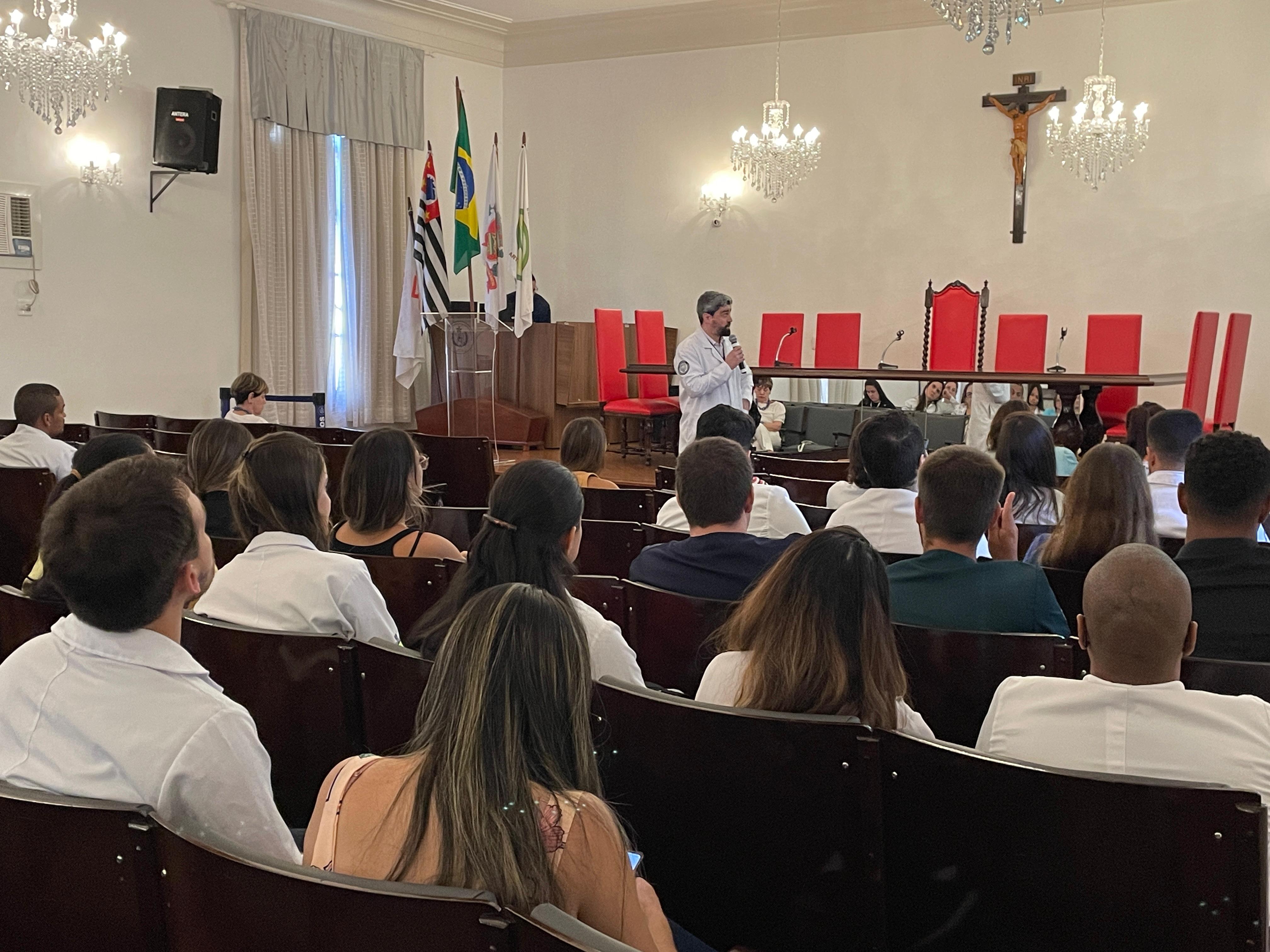 Aula inaugural apresenta orientações institucionais e marca o início da nova turma que fará internato na Santa Casa de Santos em 2024 .