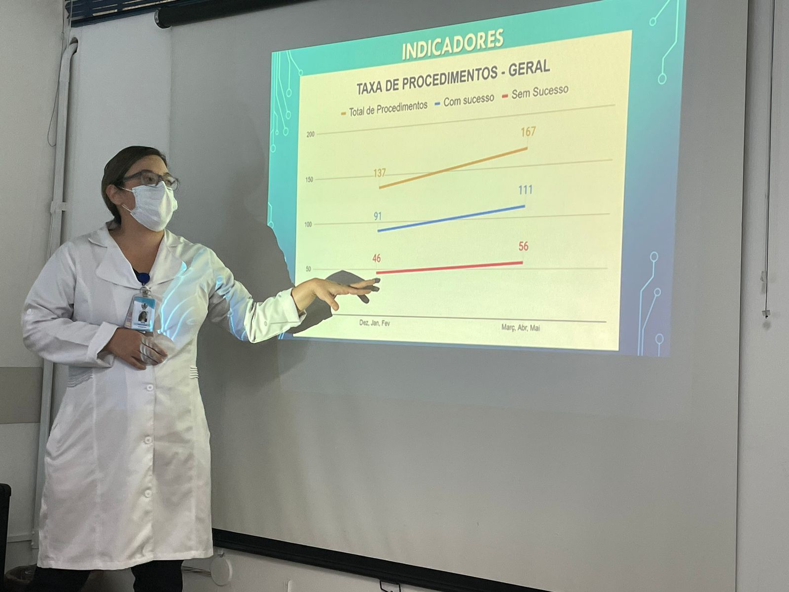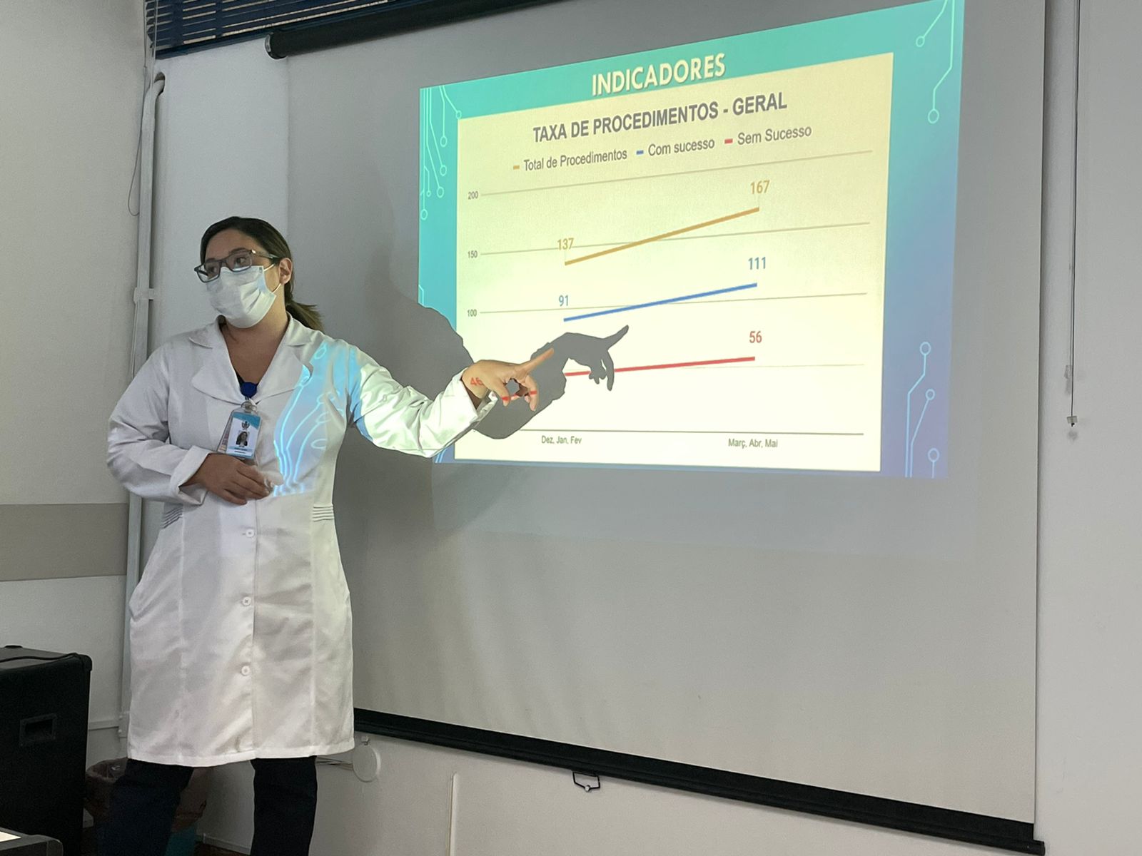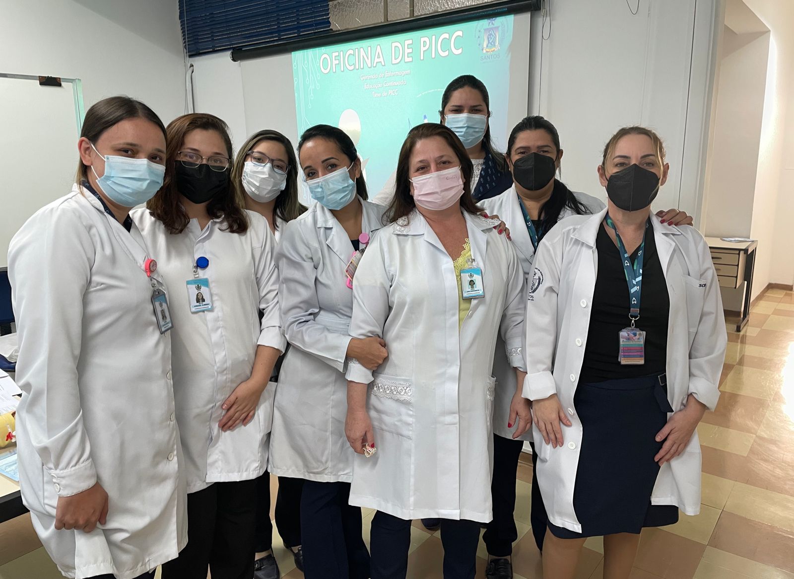 Na última sexta-feira (22/07/22), dando continuidade ao programa de capacitação, um grupo de cerca de 30 enfermeiros, já habilitados, participaram de uma oficina de atualização para Passagem de Cateter Central de Inserção Periférica – PICC, em curso ministrado pela enfermeira Noely Jesus, da Educação Continuada.