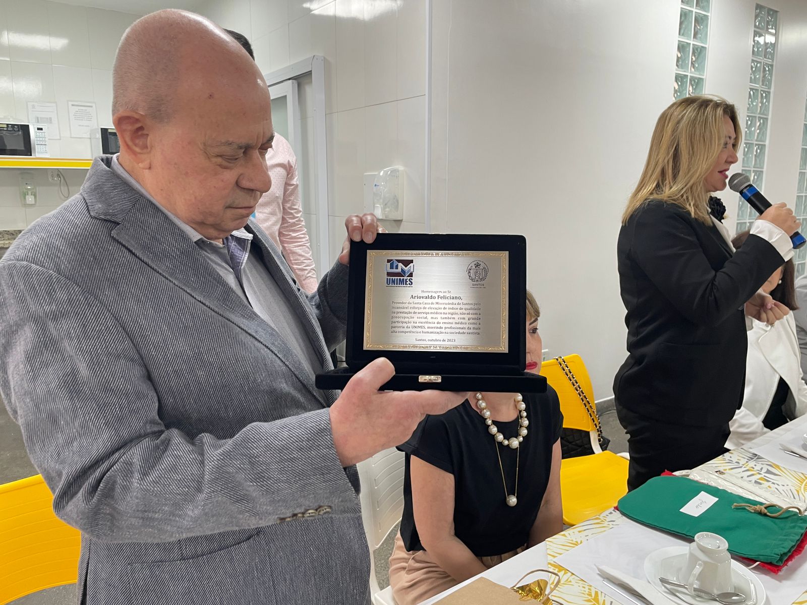 A reitora da Unimes, Renata Viegas, e a pró-reitora da Unimes, Elaine Mancilha, também prestigiaram o evento e homenagearam o provedor Ariovaldo Feliciano e a presidente da CCQ, Eliana Lopes Feliciano, com a entrega de placas de honraria.
