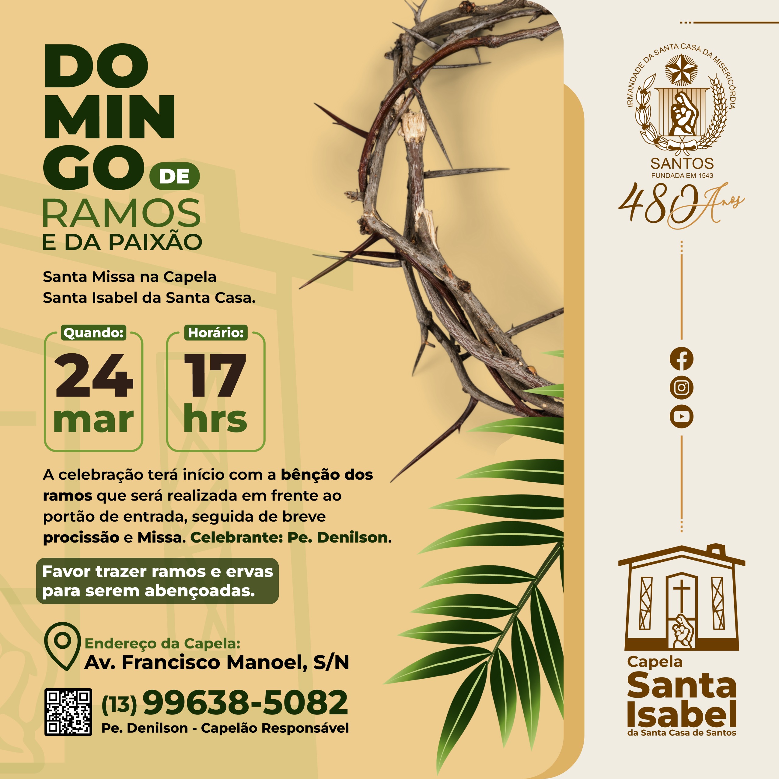 A programação especial para a Semana Santa, na Capela Santa Isabel terá início no Domingo de Ramos, dia 24/3, às 17 horas. A celebração terá início com a benção dos ramos, que será realizada em frente ao portão de entrada, seguida de breve procissão e a Santa Missa celebrada pelo Capelão Padre Denilson. Os fiéis podem levar ramos e ervas para serem abençoadas.
