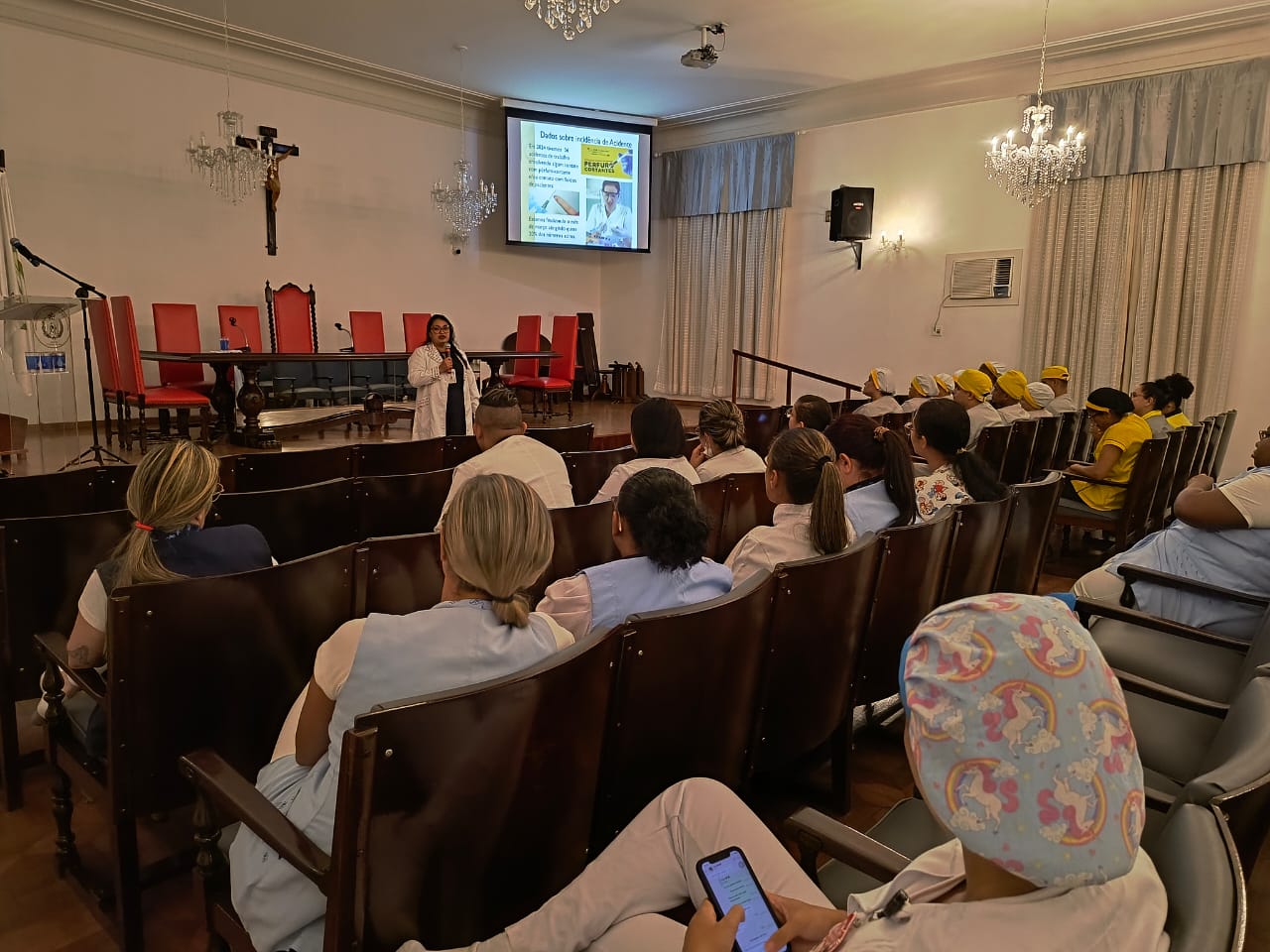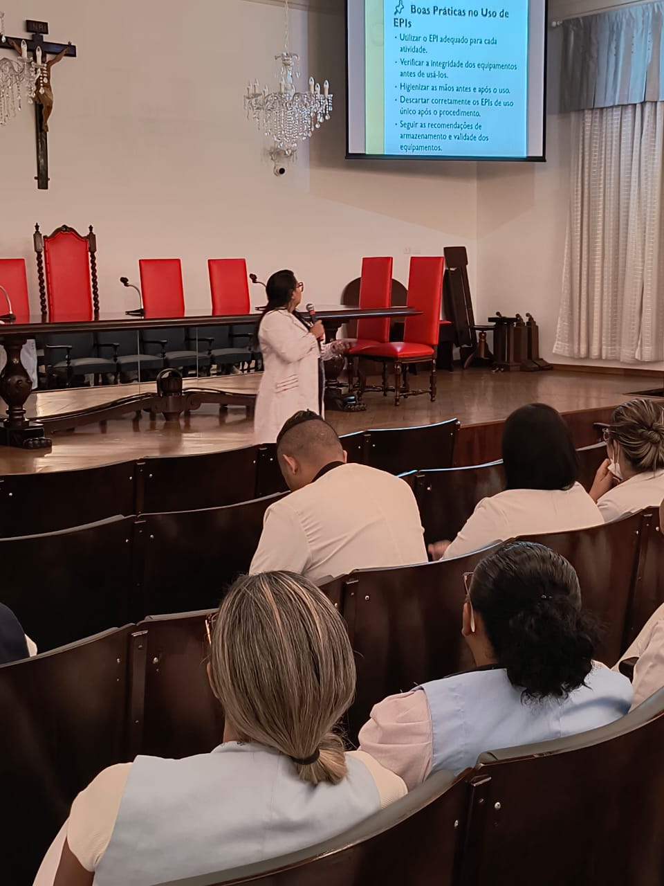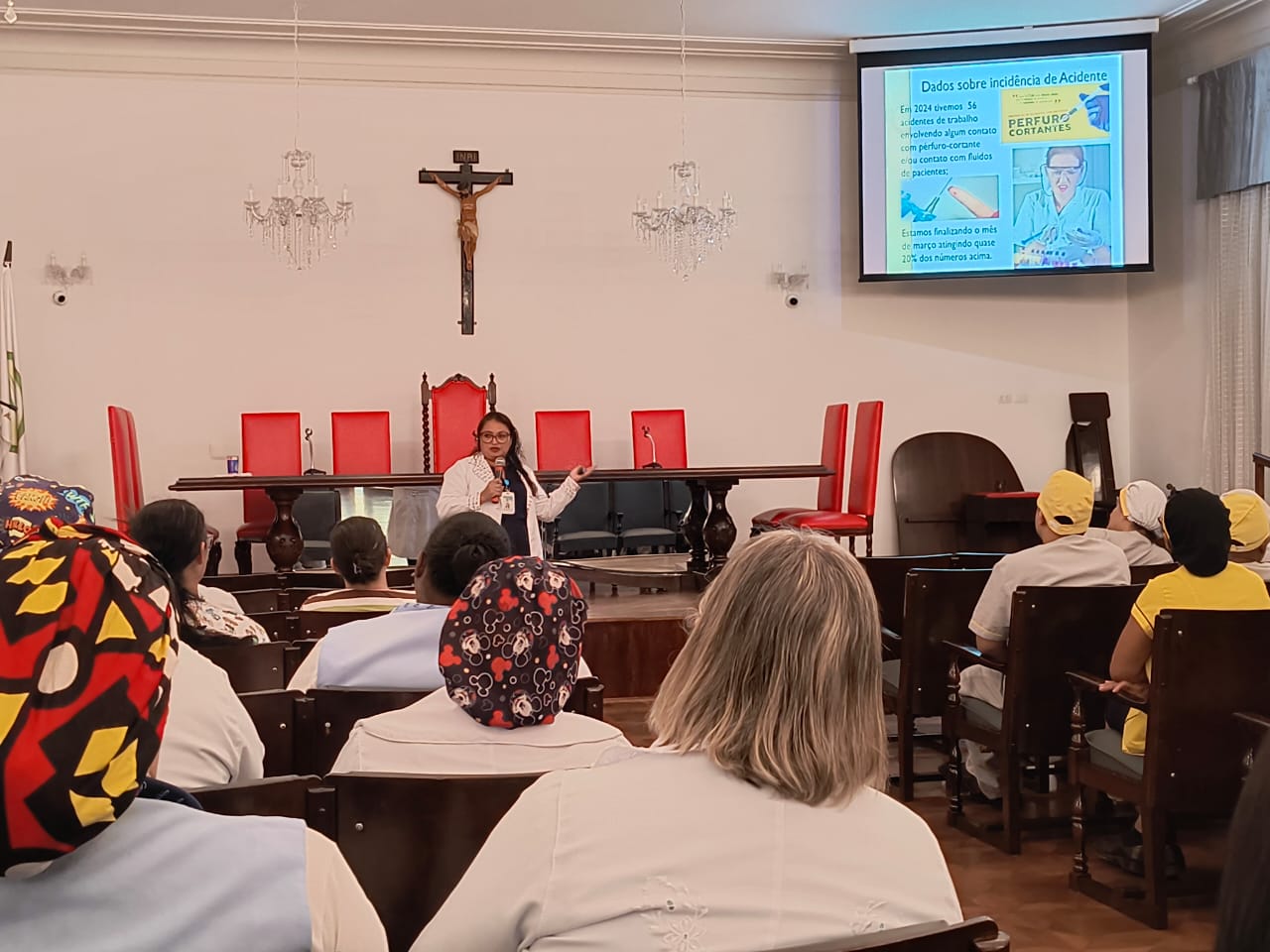 A segunda palestra da programação aconteceu às 19h30, para que os colaboradores do período noturno pudessem participar. O tema abordado foi Biossegurança no Ambiente de Trabalho e Prevenção de ISTs, com a Enfª. Olívia Guedes Silva, do Serviço de Controle de Infecção Hospitalar.
