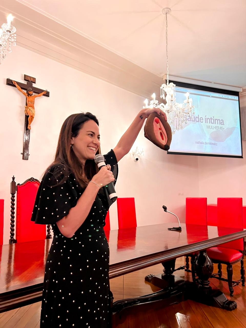 Logo depois, a sexóloga Nathalia Ziemkiewicz conduziu uma conversa sobre sexualidade, promovendo um diálogo aberto e acolhedor sobre saúde íntima e qualidade de vida, destacando a importância de cuidar não apenas da saúde física, mas também do bem-estar emocional e mental nessa fase da vida. Segundo a especialista, o período da menopausa representa uma etapa de transformações naturais do corpo feminino, que exige autoconhecimento, acolhimento e, principalmente, segurança e autenticidade para viver a sexualidade de forma plena.