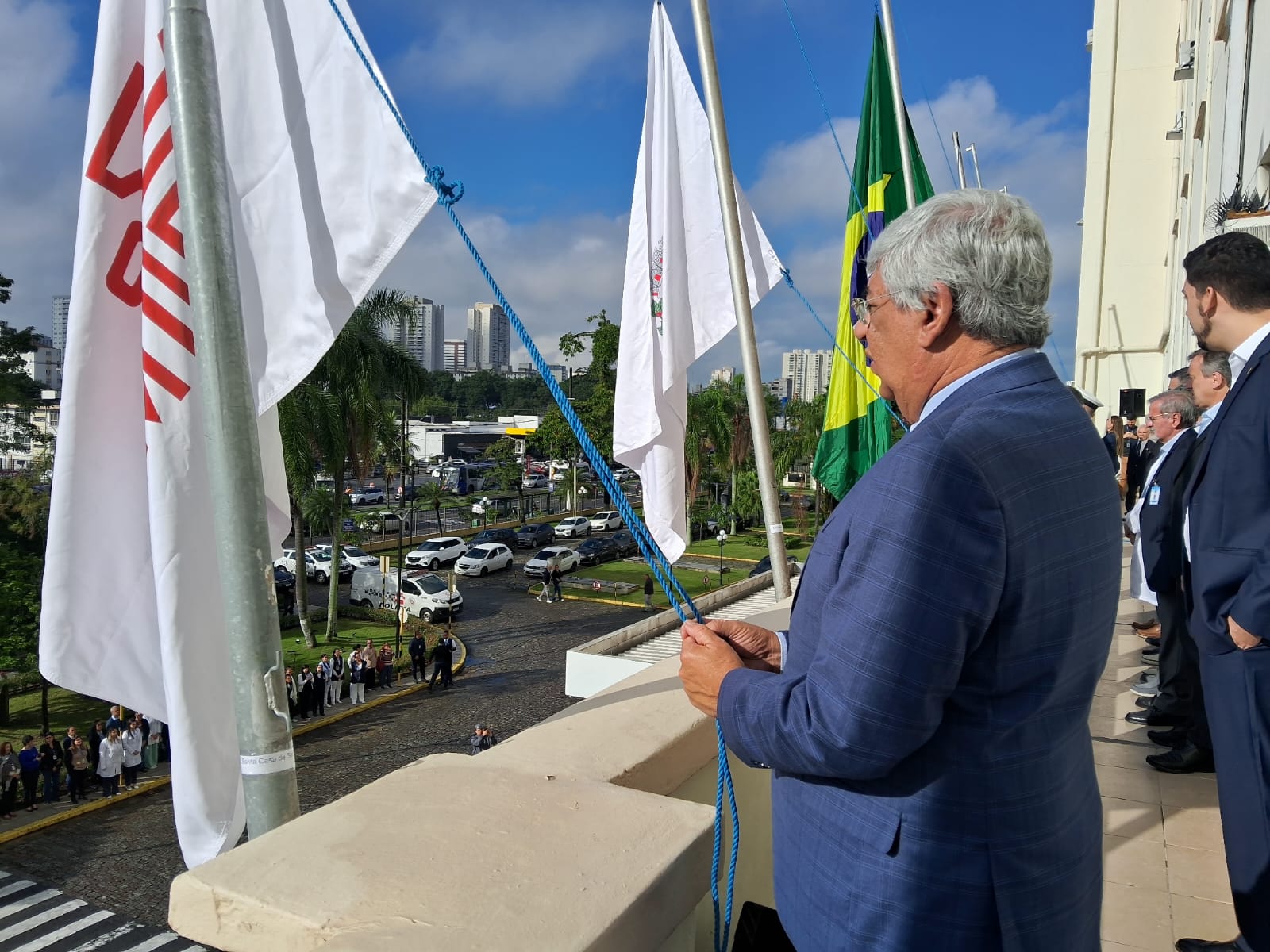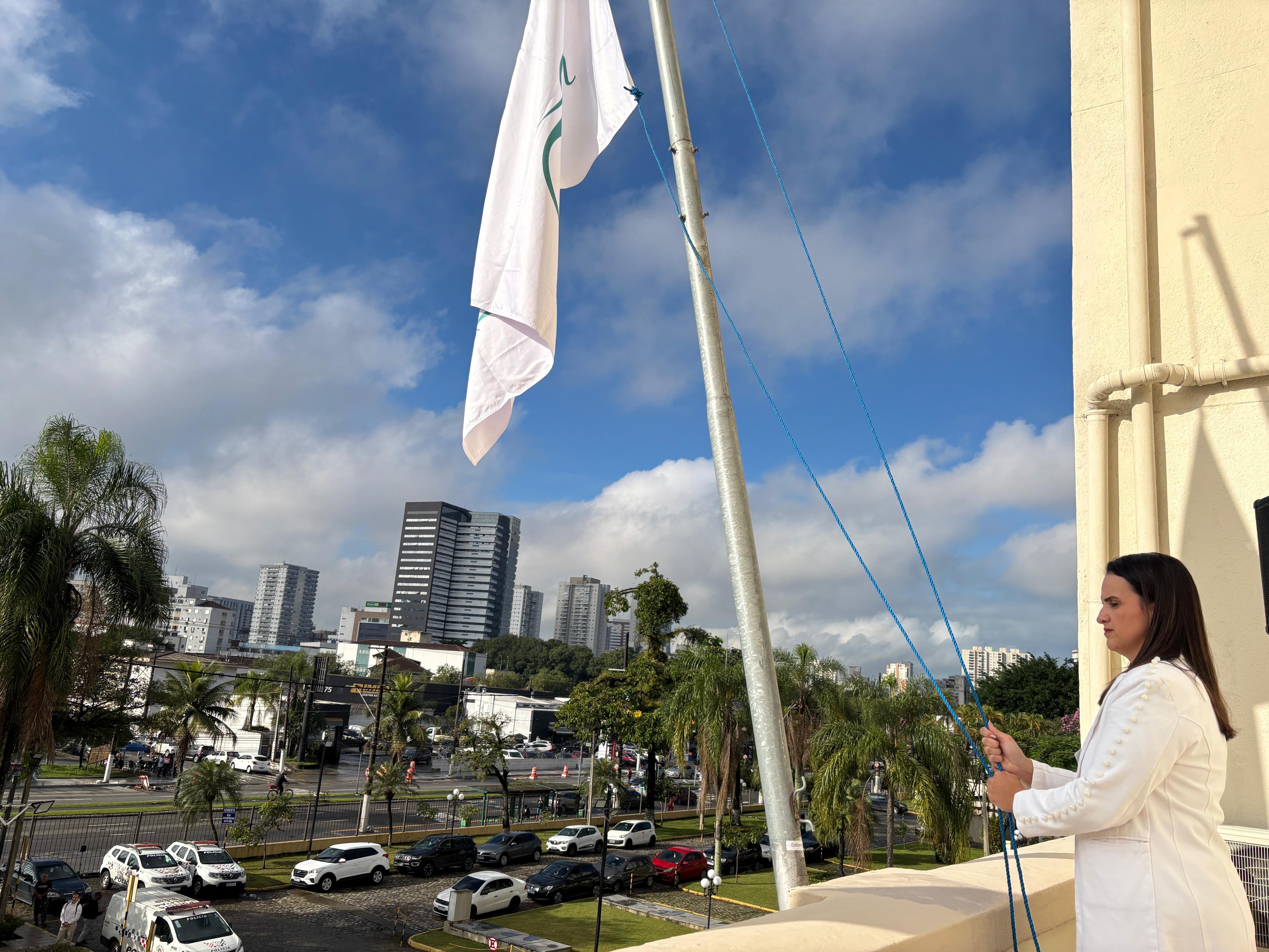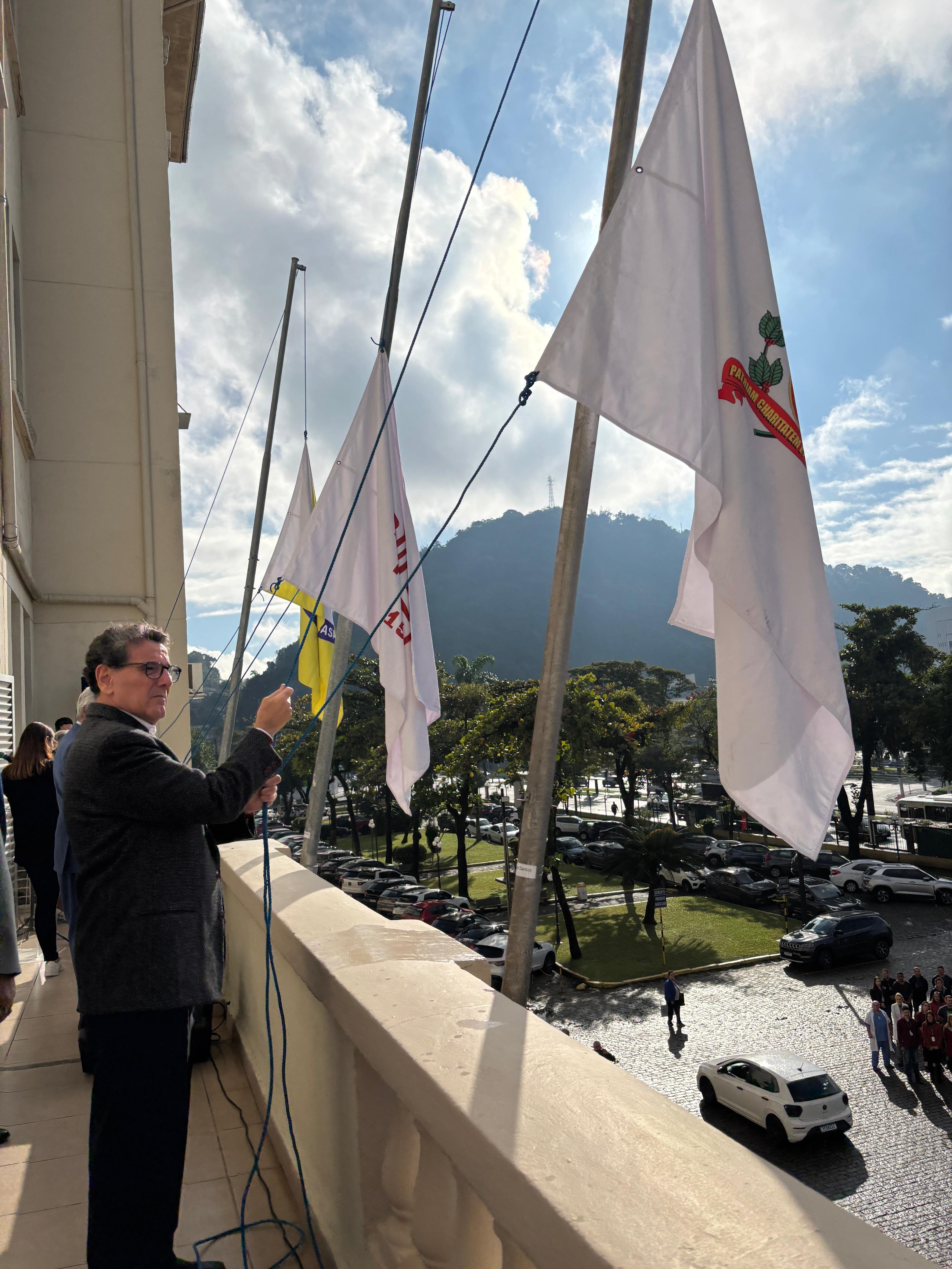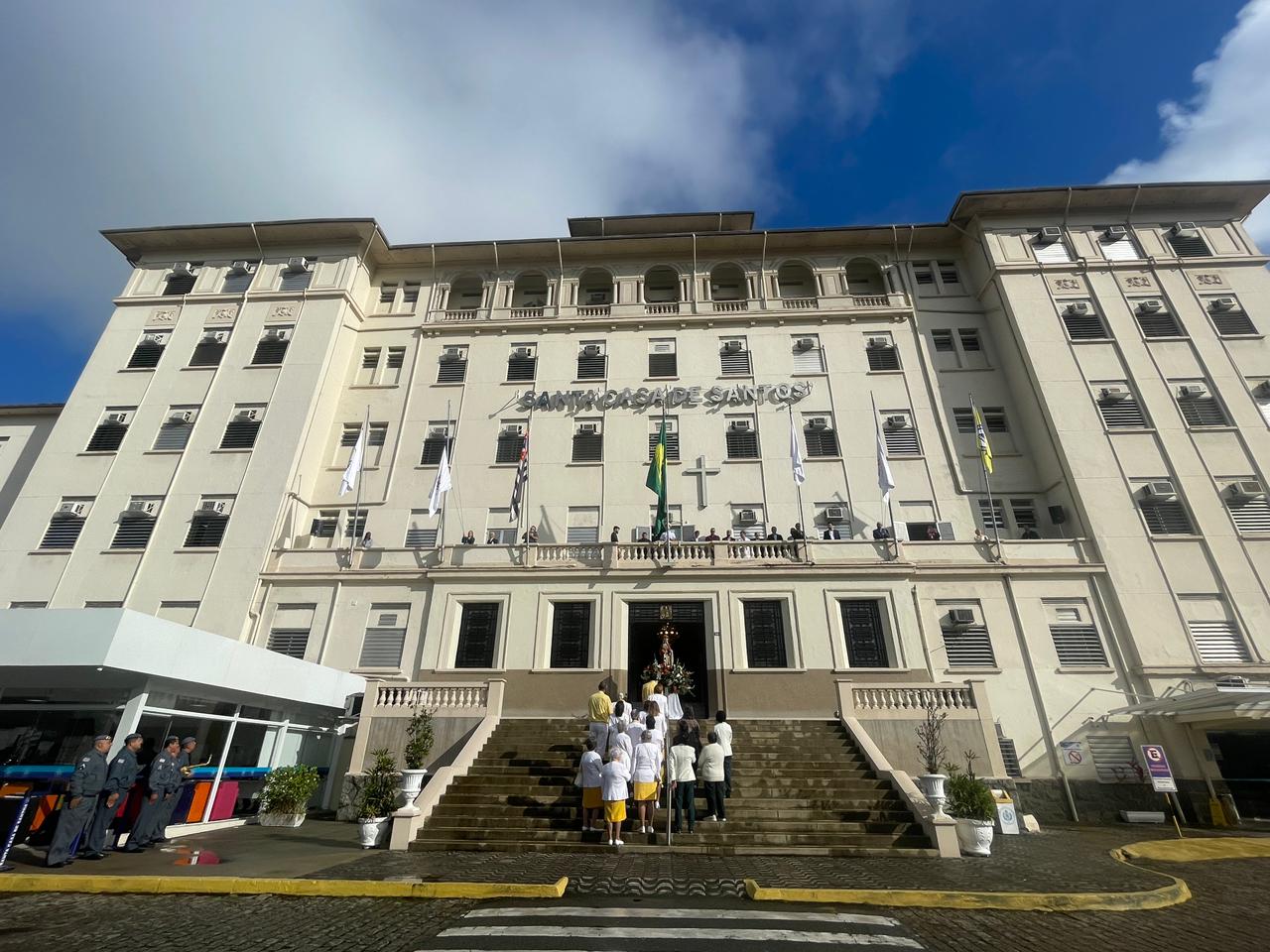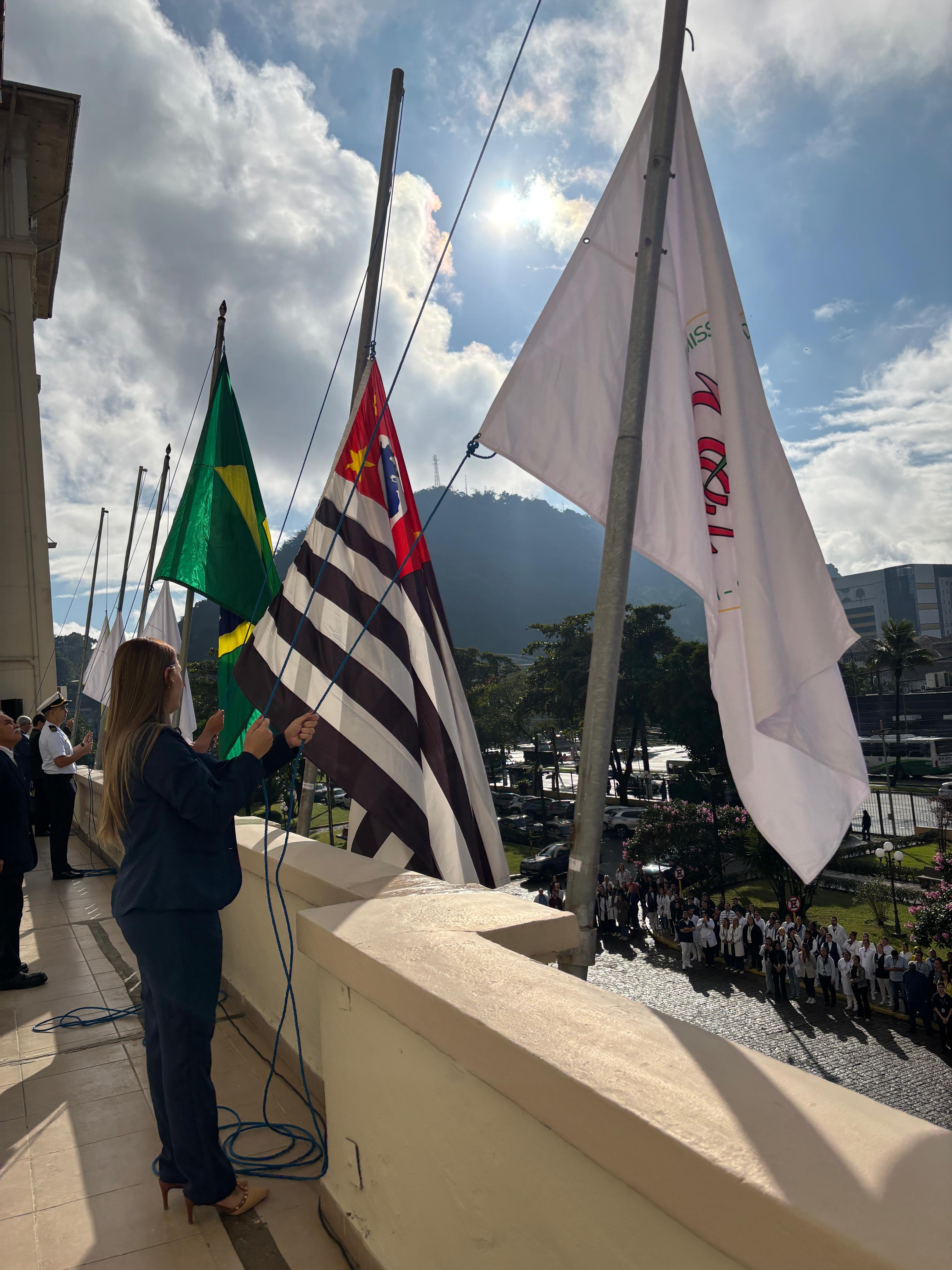 Da sacada da Santa Casa, gestores e membros da Mesa Administrativa realizaram o hasteamento das bandeiras, conforme segue: Representando o Capitão de Mar e guerra, o 2º Tenente Victor Hugo Santos Vaz Leite (Bandeira Nacional); Tenente João Batista (Bandeira do Estado de São Paulo); representando a prefeitura de Santos, o assessor da Secretaria de Saúde, Braz Antunes Mattos Neto (Bandeira de Santos); o vice-provedor Carlos Teixeira Filho (Bandeira da Santa Casa); Enfª Rita Rocha (Bandeira da Enfermagem); Ana Carolina Costa (Bandeira da Comissão de Controle da Qualidade) e Maria Emília (Bandeira da AVOSC).