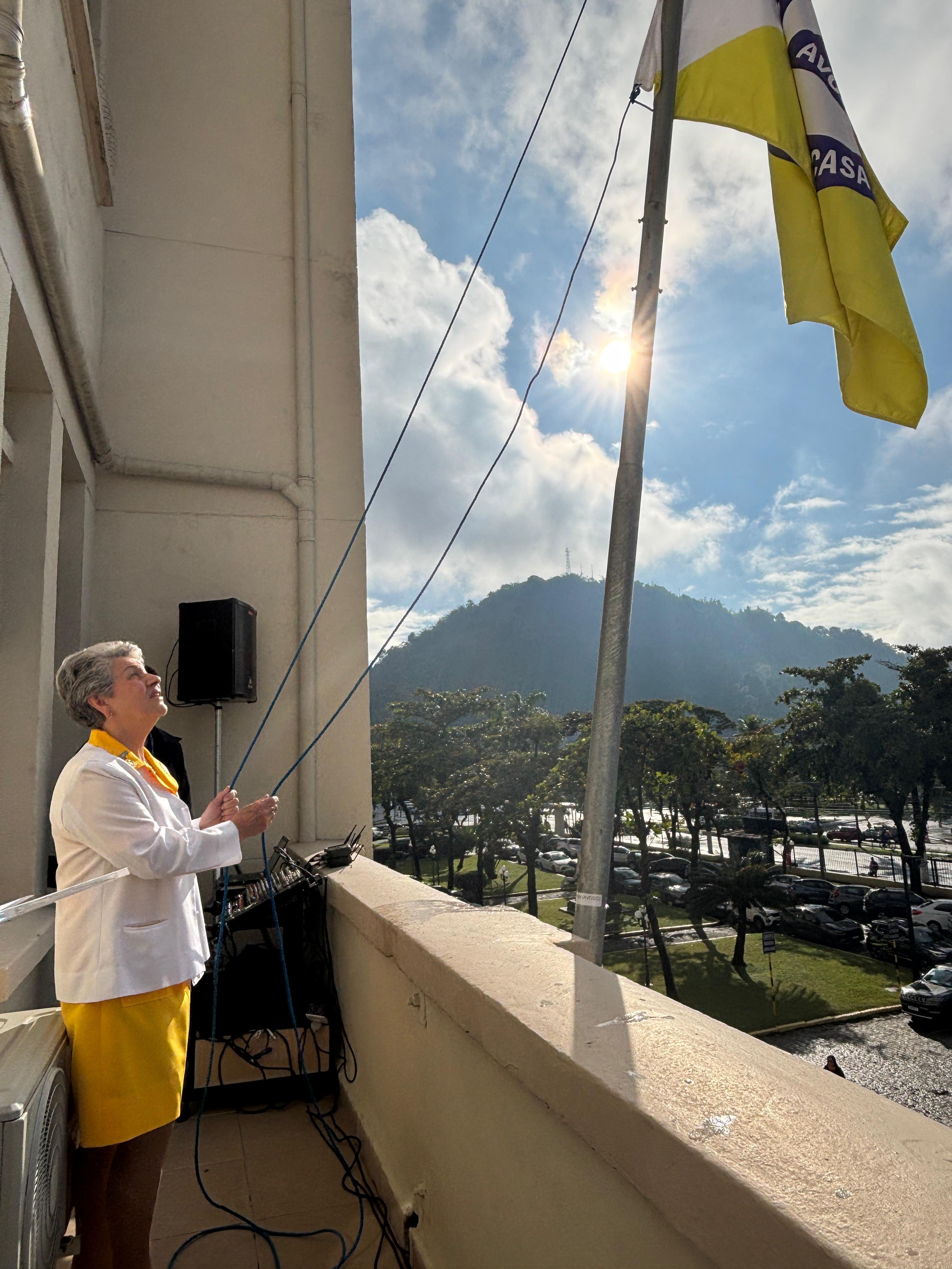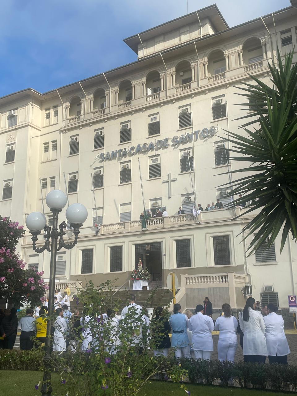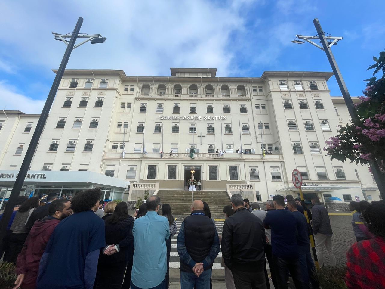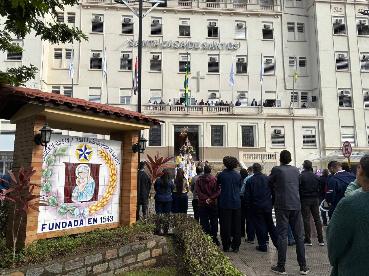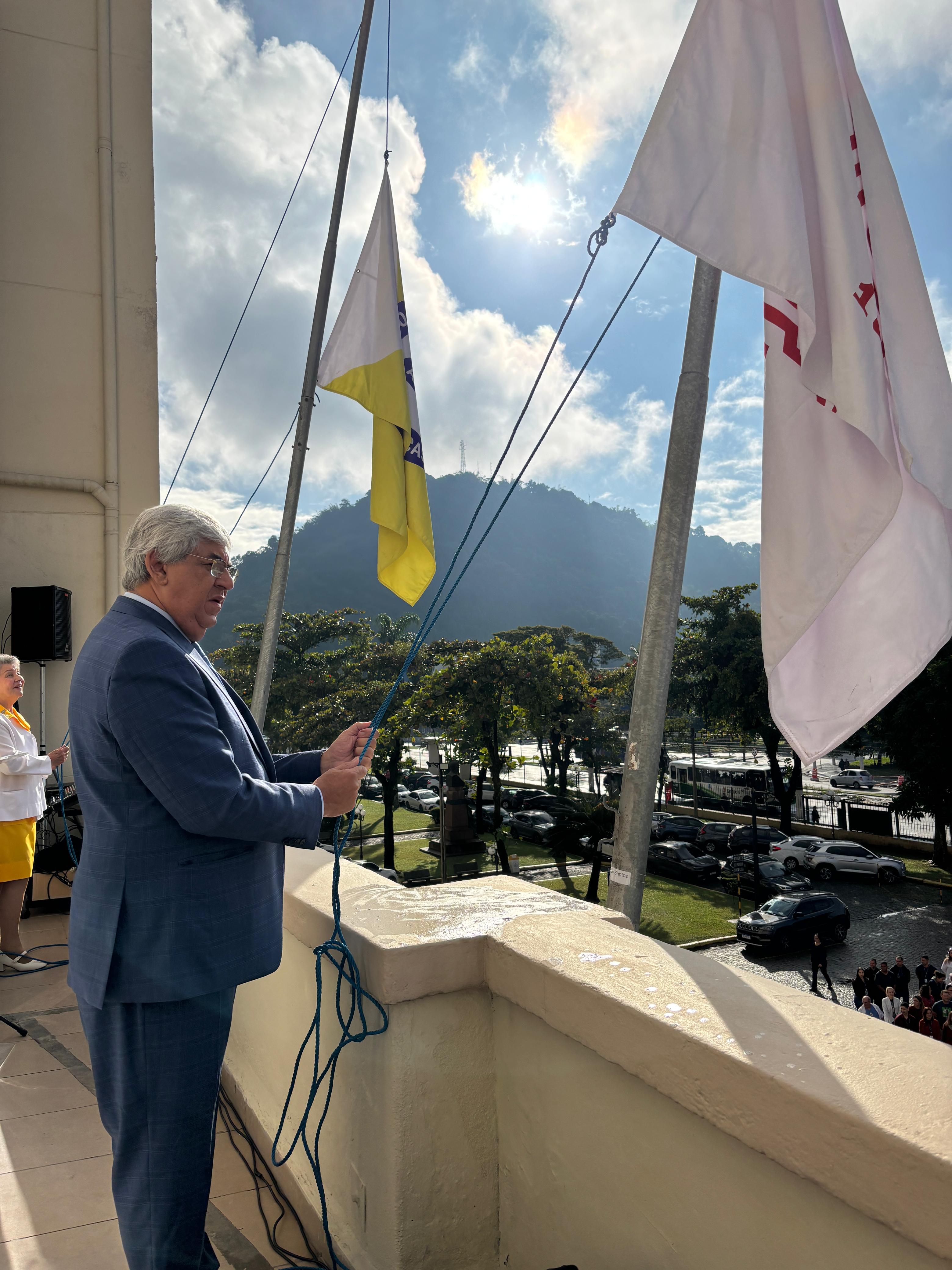 Da sacada da Santa Casa, gestores e membros da Mesa Administrativa realizaram o hasteamento das bandeiras, conforme segue: Representando o Capitão de Mar e guerra, o 2º Tenente Victor Hugo Santos Vaz Leite (Bandeira Nacional); Tenente João Batista (Bandeira do Estado de São Paulo); representando a prefeitura de Santos, o assessor da Secretaria de Saúde, Braz Antunes Mattos Neto (Bandeira de Santos); o vice-provedor Carlos Teixeira Filho (Bandeira da Santa Casa); Enfª Rita Rocha (Bandeira da Enfermagem); Ana Carolina Costa (Bandeira da Comissão de Controle da Qualidade) e Maria Emília (Bandeira da AVOSC).