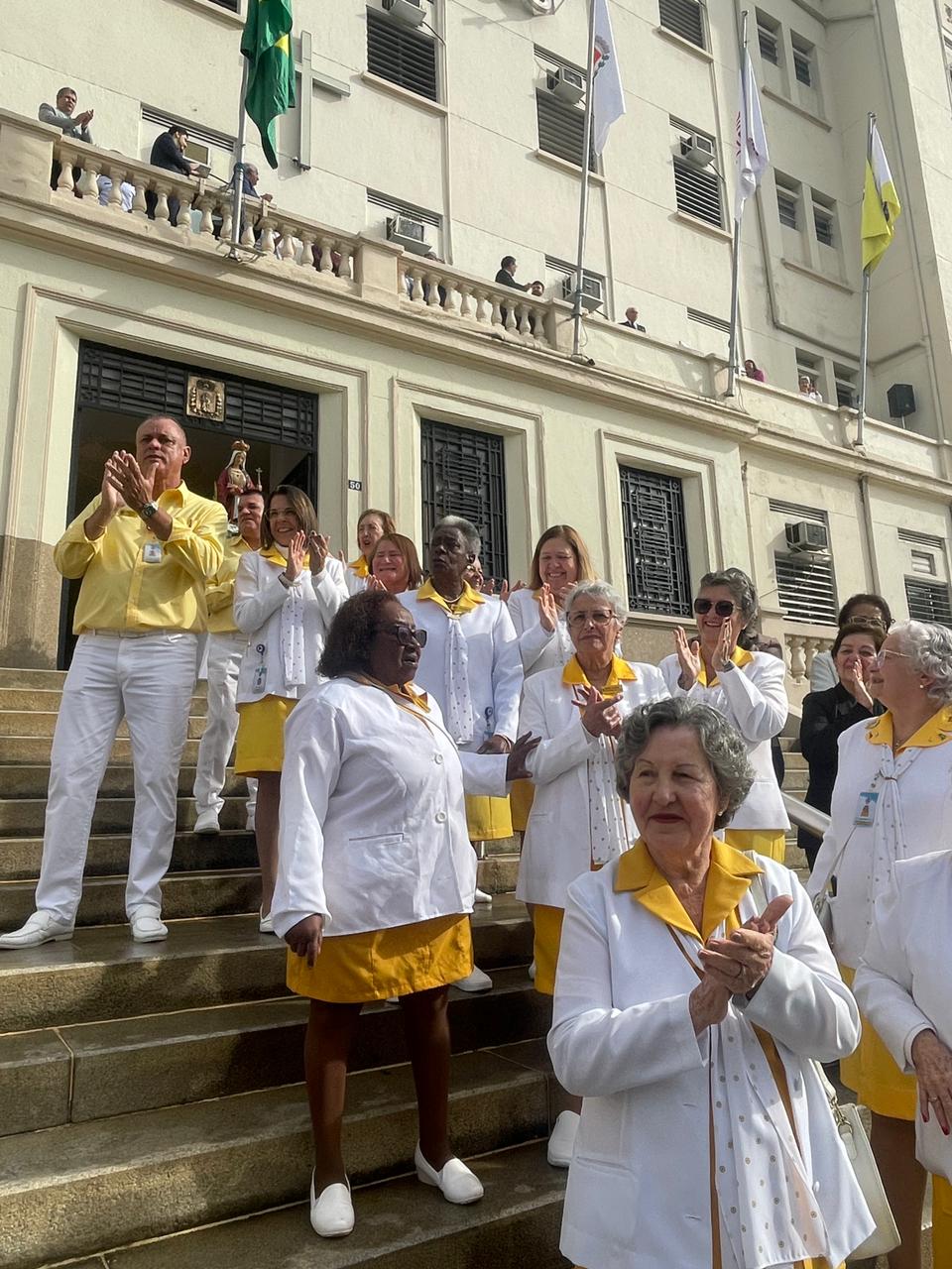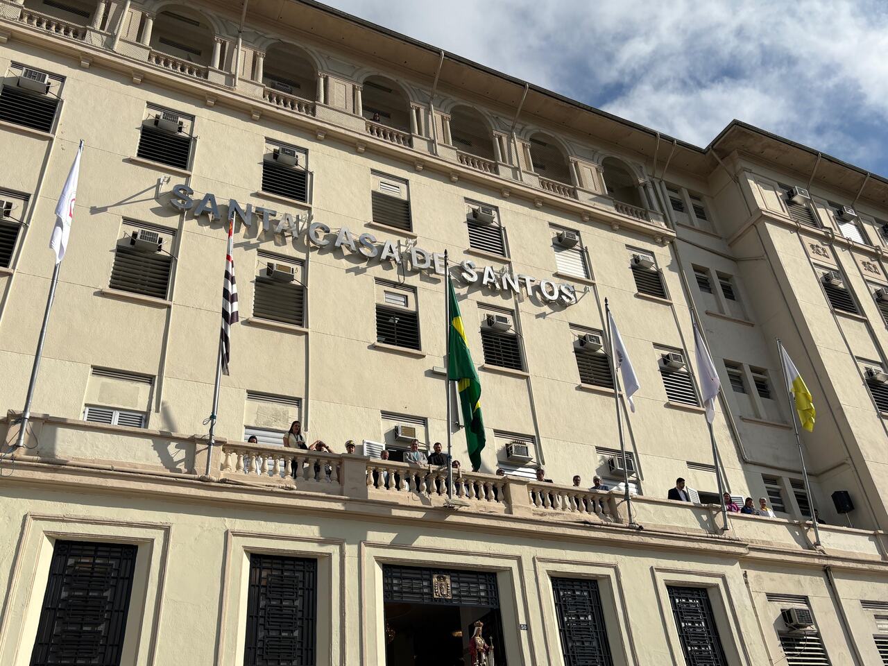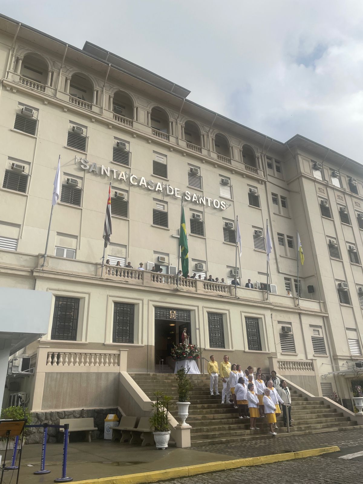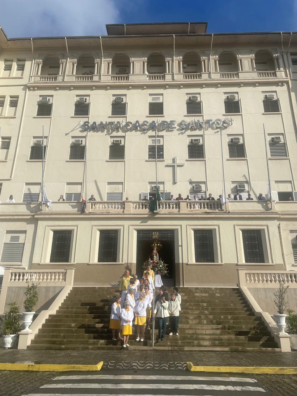 Da sacada da Santa Casa, gestores e membros da Mesa Administrativa realizaram o hasteamento das bandeiras, conforme segue: Representando o Capitão de Mar e guerra, o 2º Tenente Victor Hugo Santos Vaz Leite (Bandeira Nacional); Tenente João Batista (Bandeira do Estado de São Paulo); representando a prefeitura de Santos, o assessor da Secretaria de Saúde, Braz Antunes Mattos Neto (Bandeira de Santos); o vice-provedor Carlos Teixeira Filho (Bandeira da Santa Casa); Enfª Rita Rocha (Bandeira da Enfermagem); Ana Carolina Costa (Bandeira da Comissão de Controle da Qualidade) e Maria Emília (Bandeira da AVOSC).