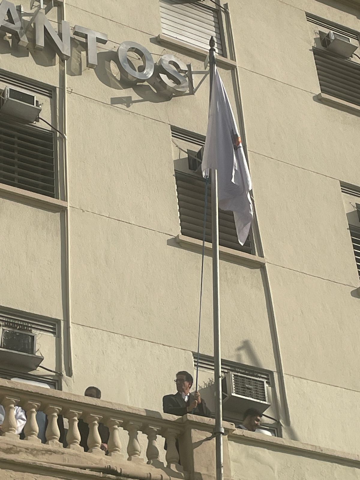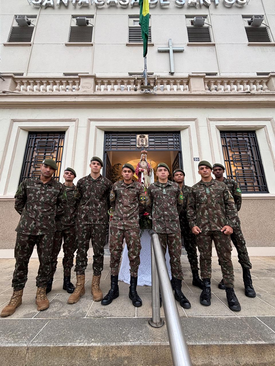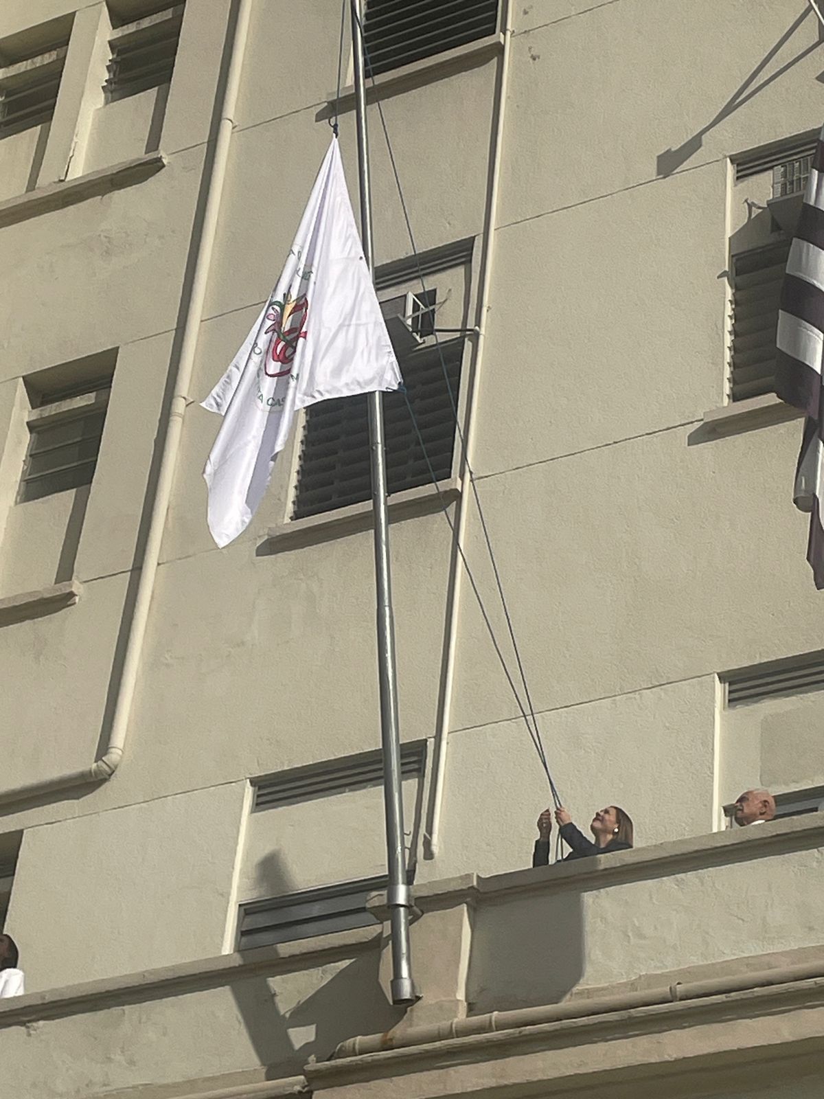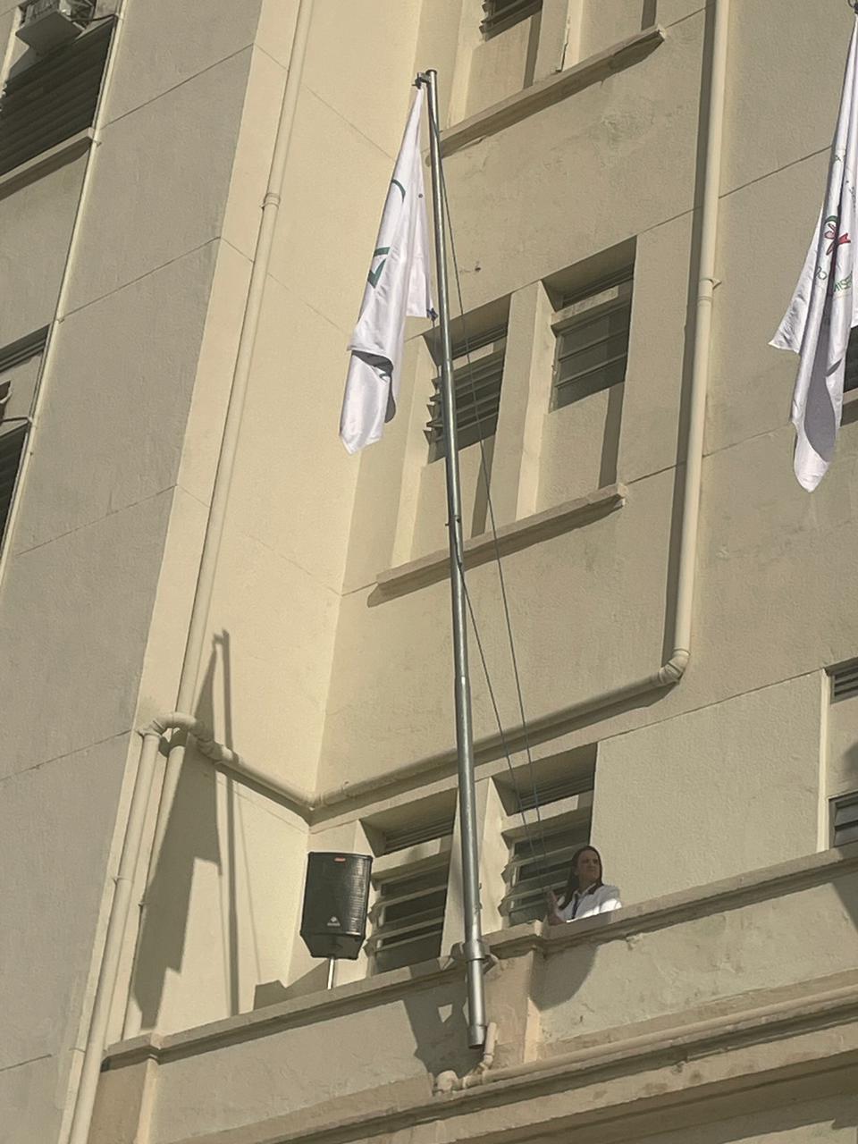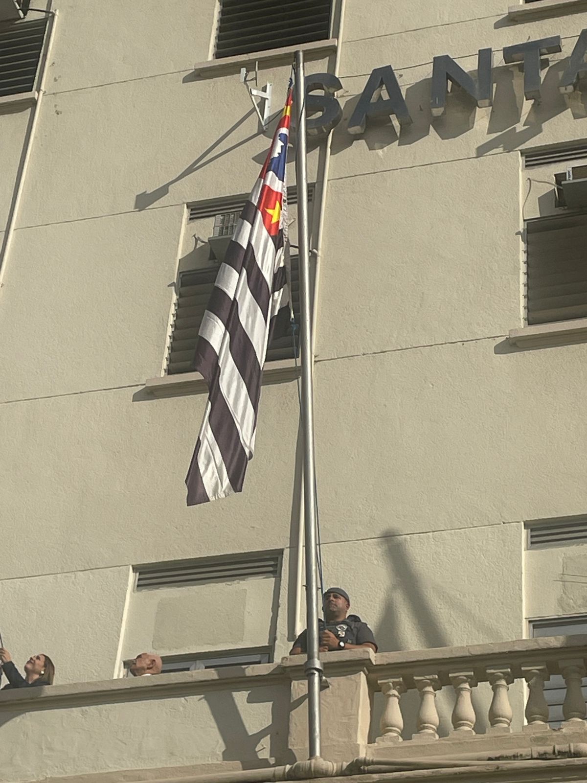 Da sacada da Santa Casa, gestores e membros da Mesa Administrativa realizaram o hasteamento das bandeiras, conforme segue: Representando o Capitão de Mar e guerra, o 2º Tenente Victor Hugo Santos Vaz Leite (Bandeira Nacional); Tenente João Batista (Bandeira do Estado de São Paulo); representando a prefeitura de Santos, o assessor da Secretaria de Saúde, Braz Antunes Mattos Neto (Bandeira de Santos); o vice-provedor Carlos Teixeira Filho (Bandeira da Santa Casa); Enfª Rita Rocha (Bandeira da Enfermagem); Ana Carolina Costa (Bandeira da Comissão de Controle da Qualidade) e Maria Emília (Bandeira da AVOSC).