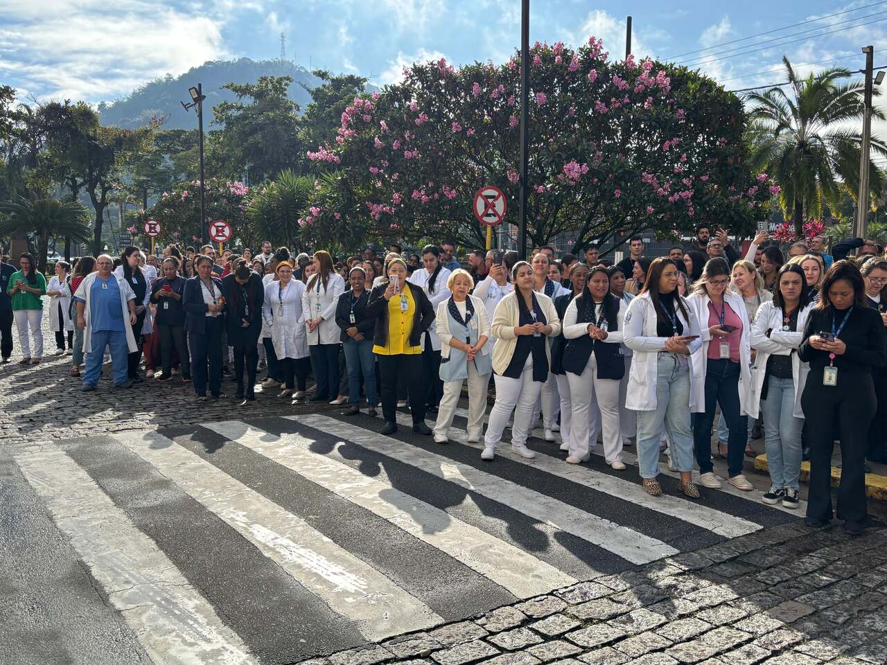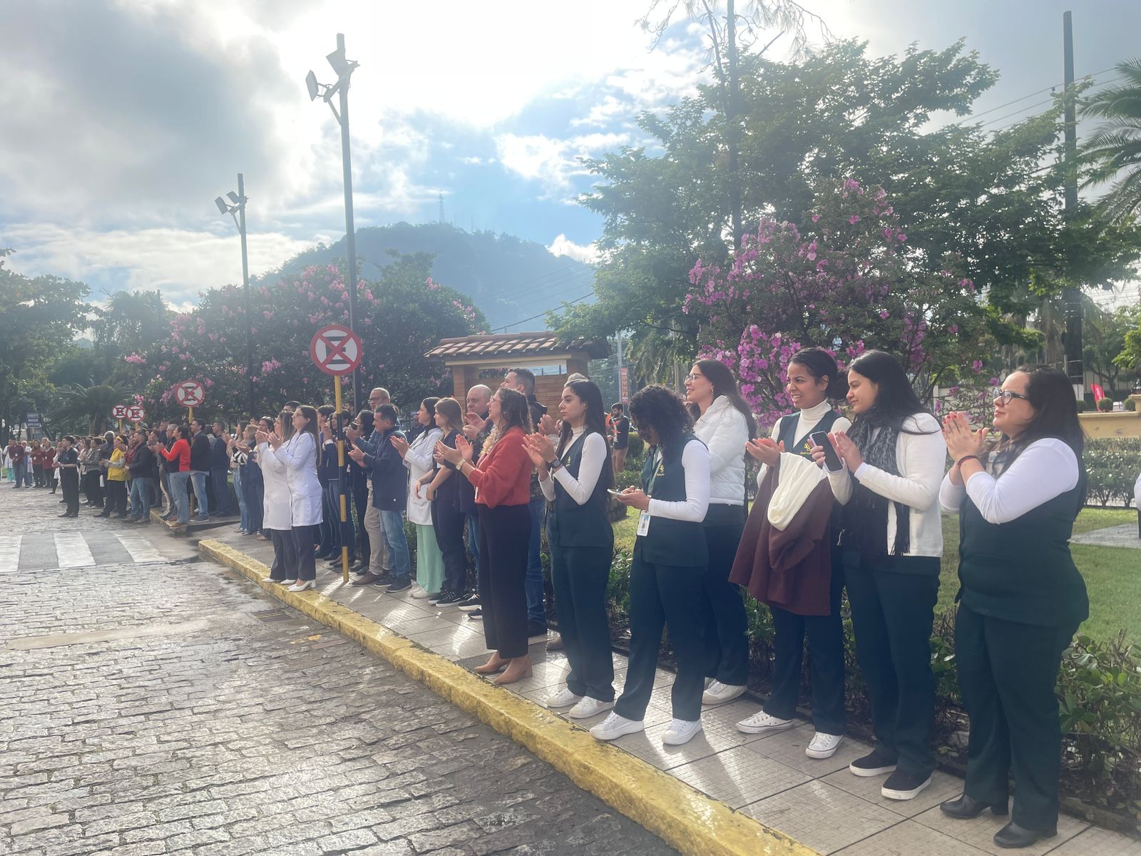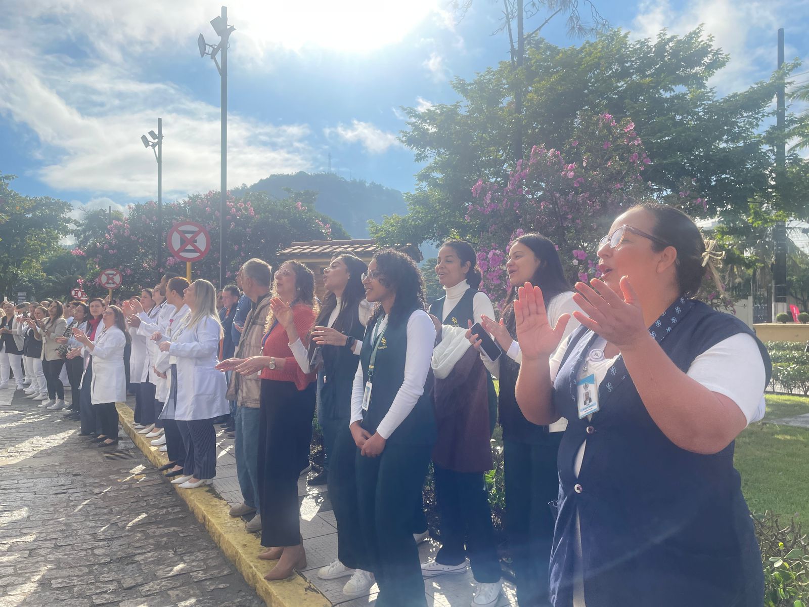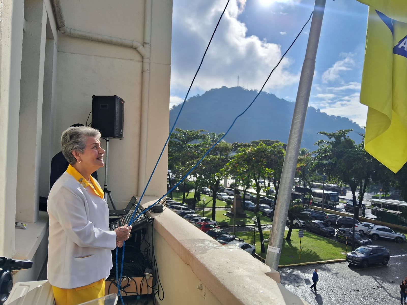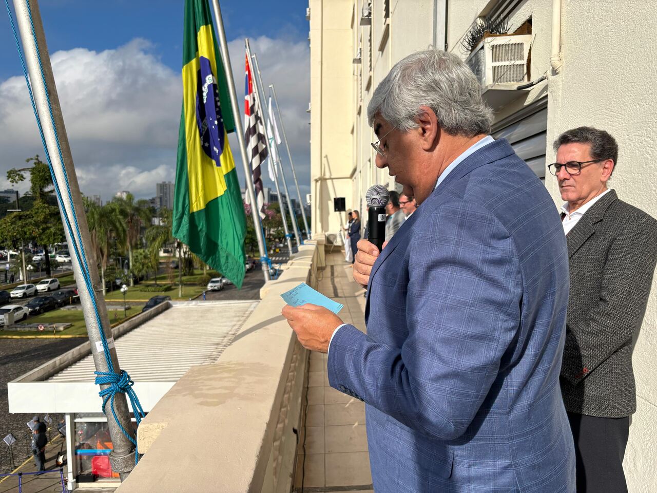 Da sacada da Santa Casa, gestores e membros da Mesa Administrativa realizaram o hasteamento das bandeiras, conforme segue: Representando o Capitão de Mar e guerra, o 2º Tenente Victor Hugo Santos Vaz Leite (Bandeira Nacional); Tenente João Batista (Bandeira do Estado de São Paulo); representando a prefeitura de Santos, o assessor da Secretaria de Saúde, Braz Antunes Mattos Neto (Bandeira de Santos); o vice-provedor Carlos Teixeira Filho (Bandeira da Santa Casa); Enfª Rita Rocha (Bandeira da Enfermagem); Ana Carolina Costa (Bandeira da Comissão de Controle da Qualidade) e Maria Emília (Bandeira da AVOSC).