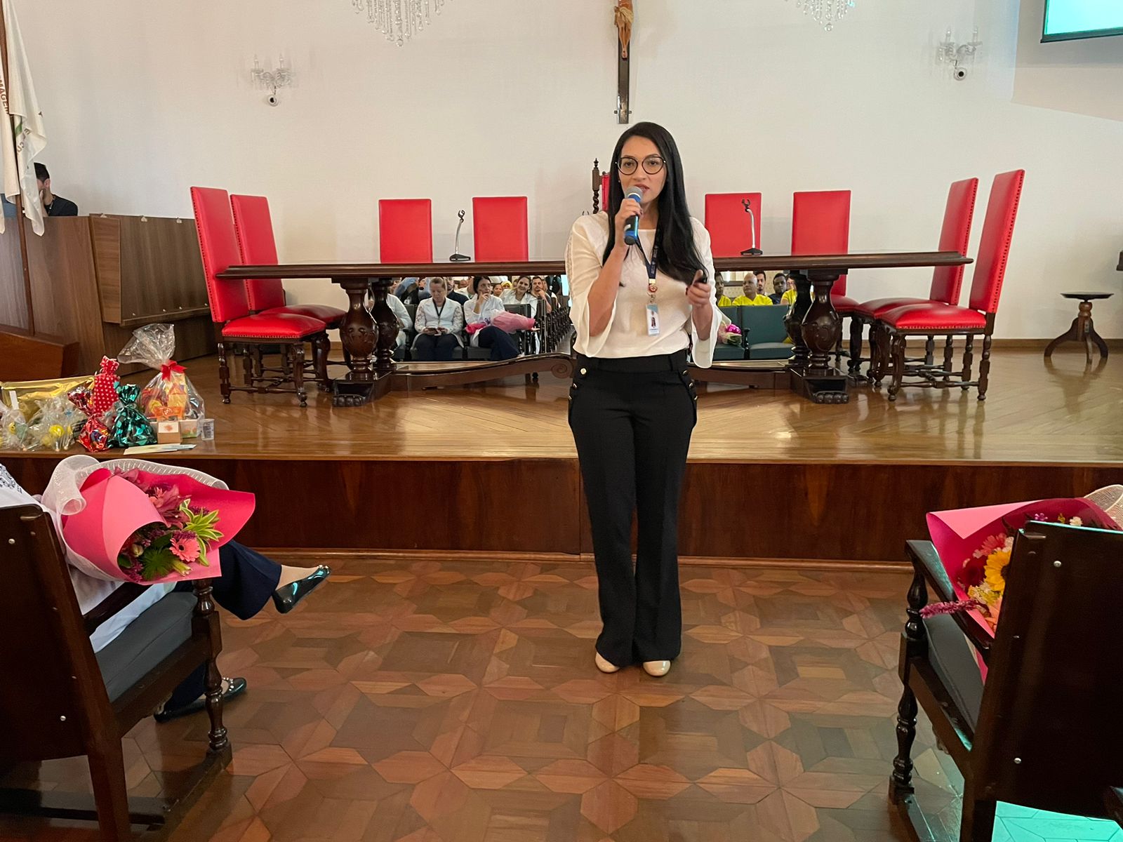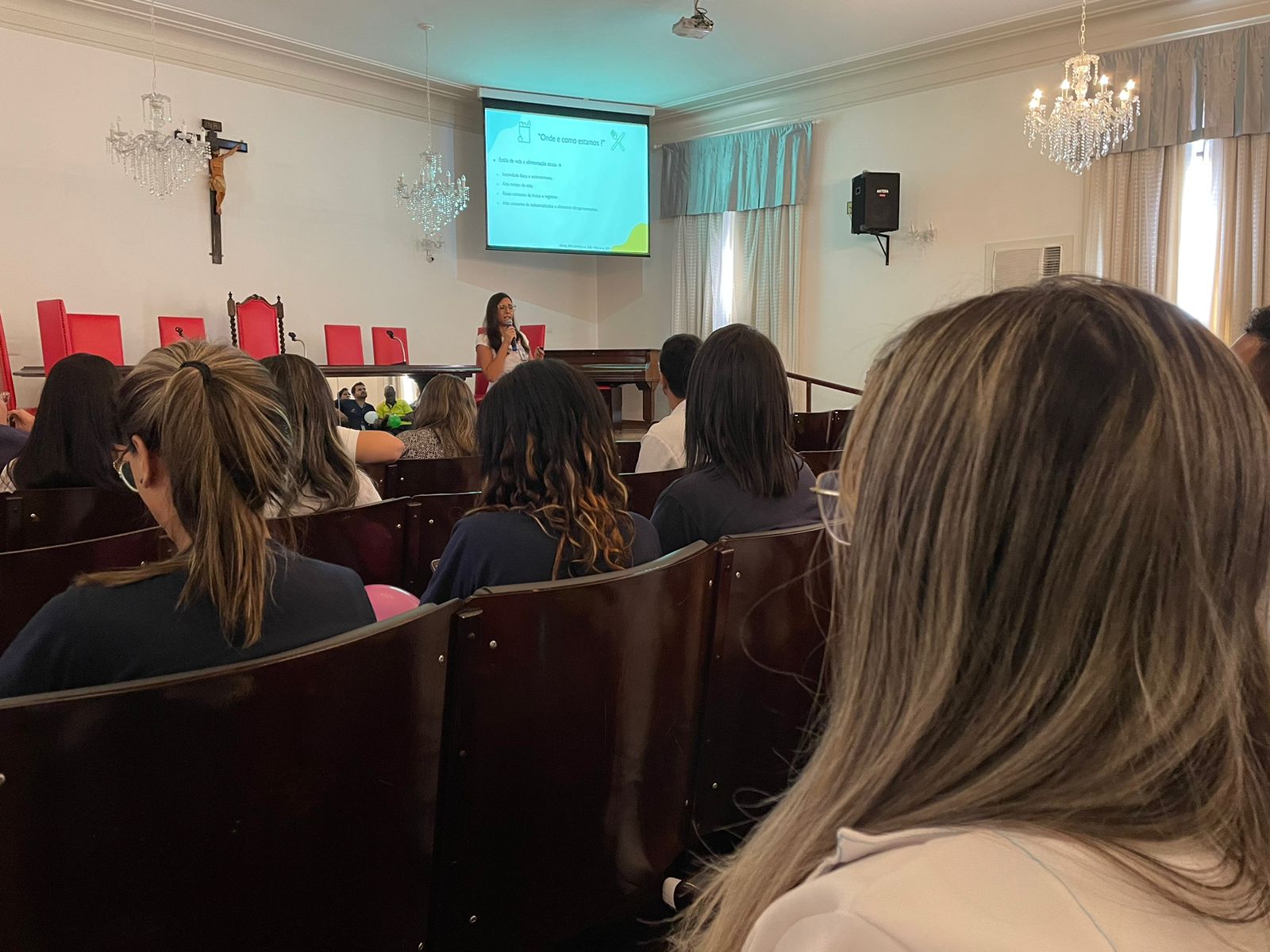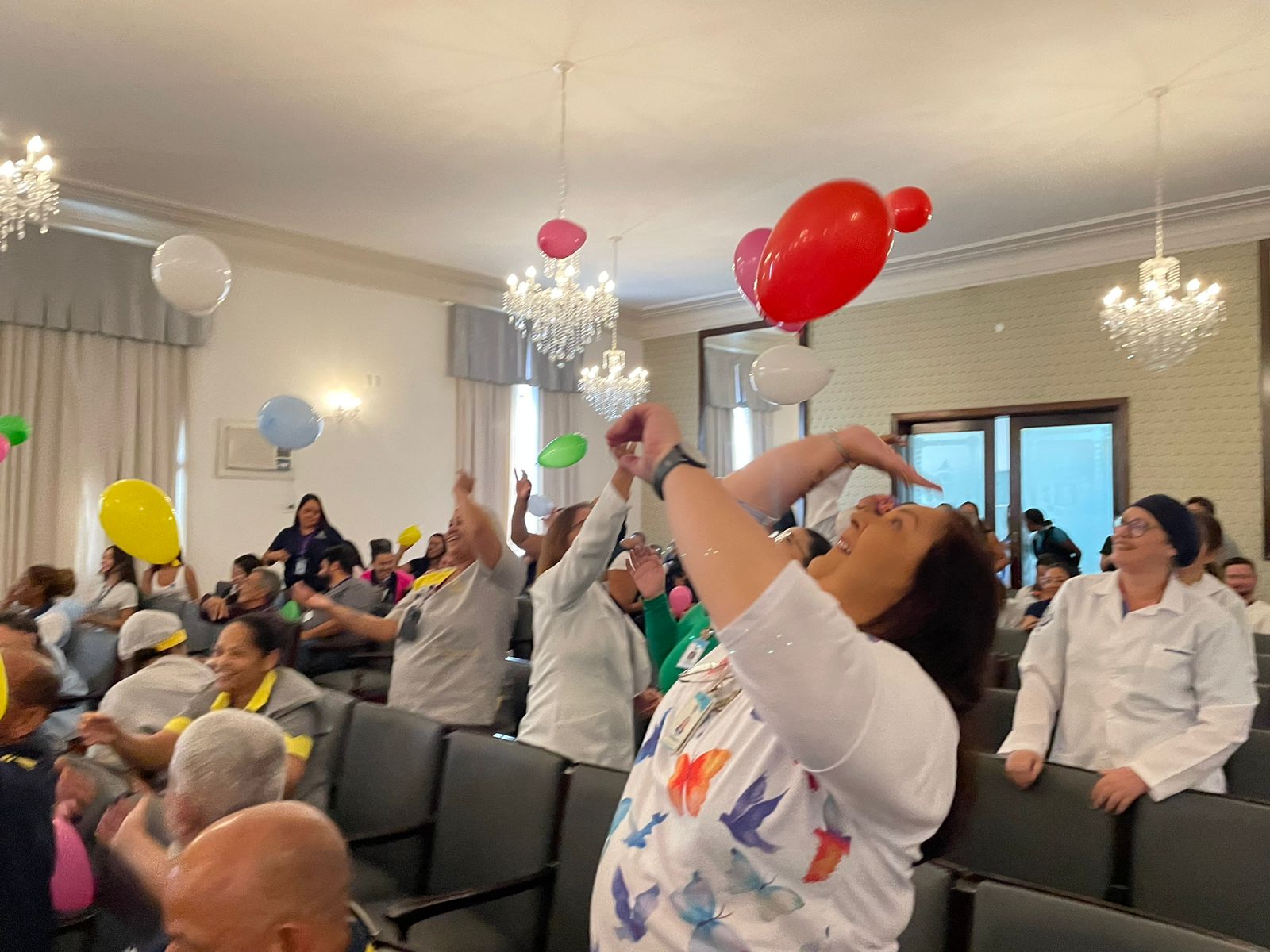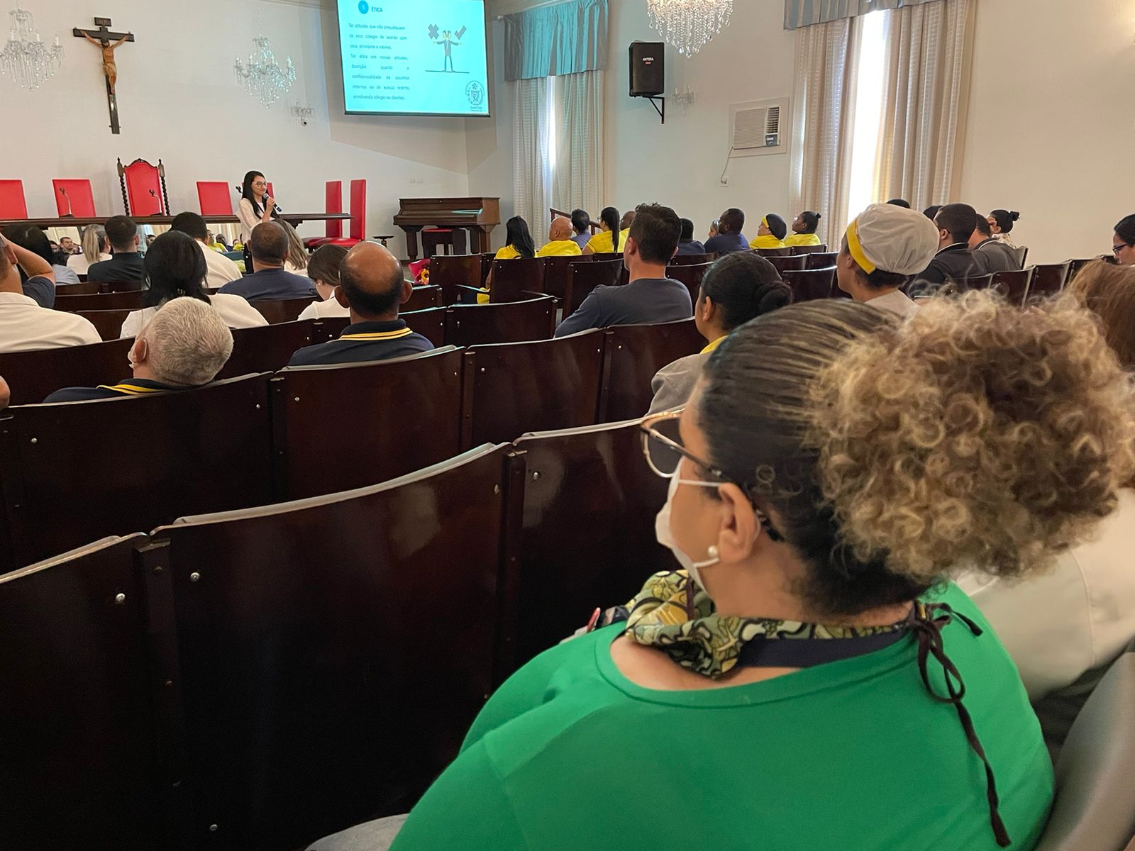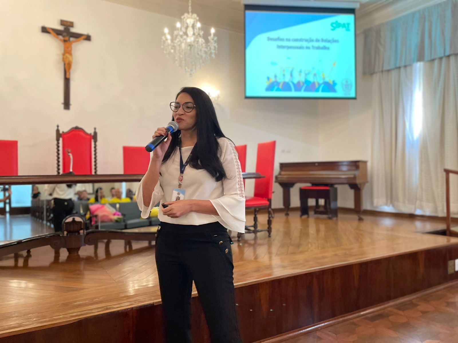 Na sequência, foi a vez da analista de RH, Ana Paula Moyano, falar dos desafios da construção de relações interpessoais no trabalho, e destacou a importância da ética profissional e comunicação assertiva. O assunto foi finalizado com uma dinâmica de grupo, onde os maus pensamentos deveriam ser soprados em uma bexiga escura, a qual teria como destino o lixo. Já os pensamentos e palavras positivas foram soprados em uma bexiga colorida, a qual deveria ser jogada no ar e compartilhada com os presentes. O momento lúdico alegrou o consistório e divertiu a todos com a brincadeira.