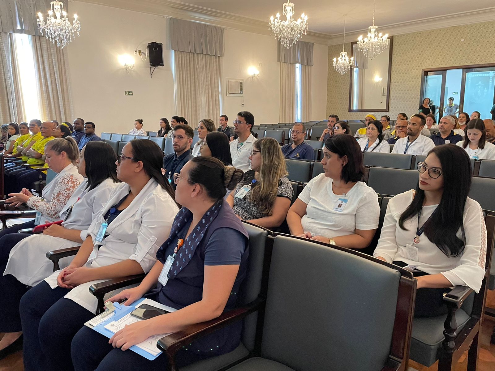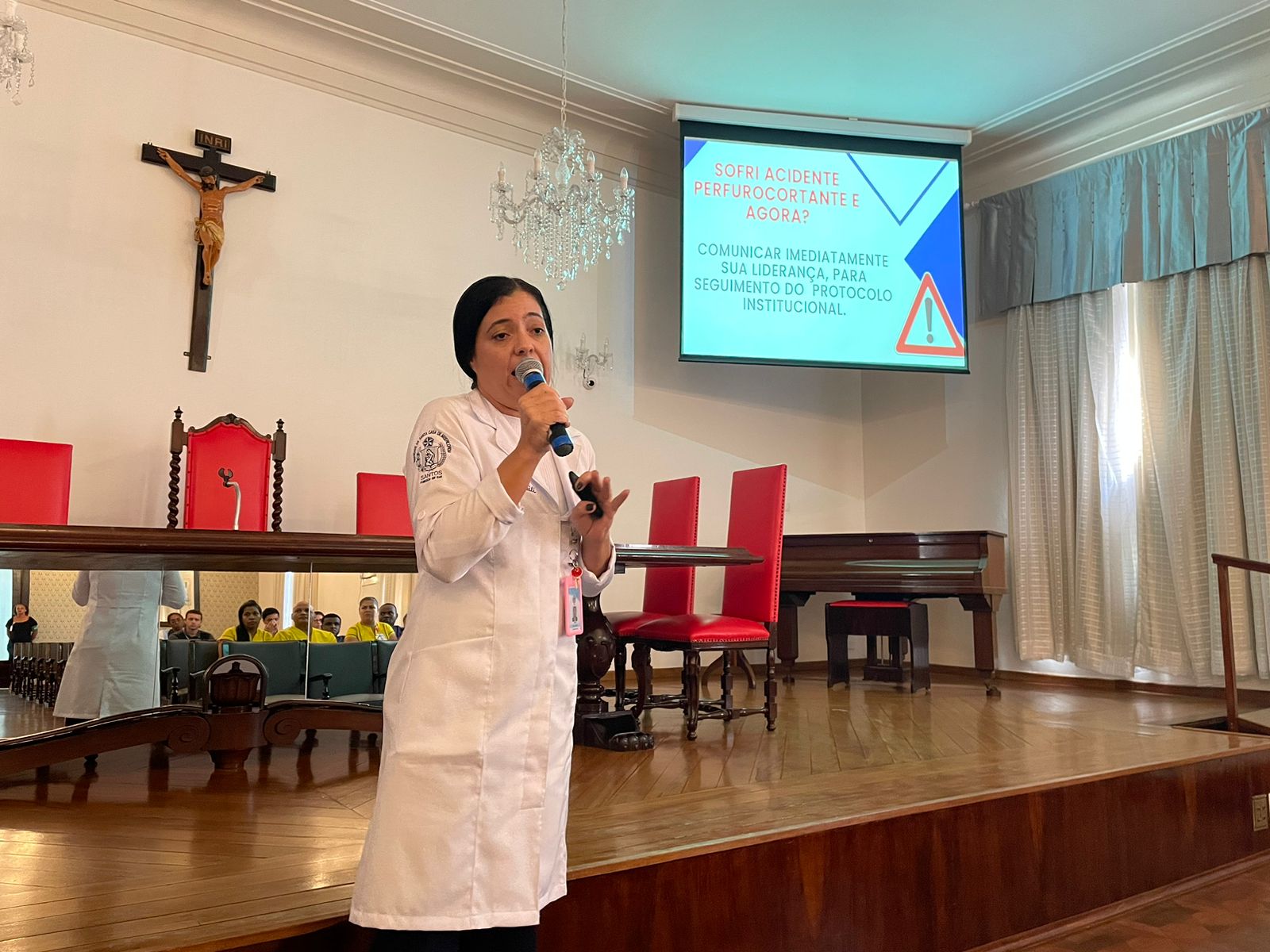 Nas palestras desta quarta, dia 19/4, a Enfª. Nivea Sbaiti, da Educação Continuada, explicou sobre situações que provocam acidentes com materiais perfuro cortantes, e também orientou sobre o uso adequado e montagem correta das caixas coletoras “Descarpack”.