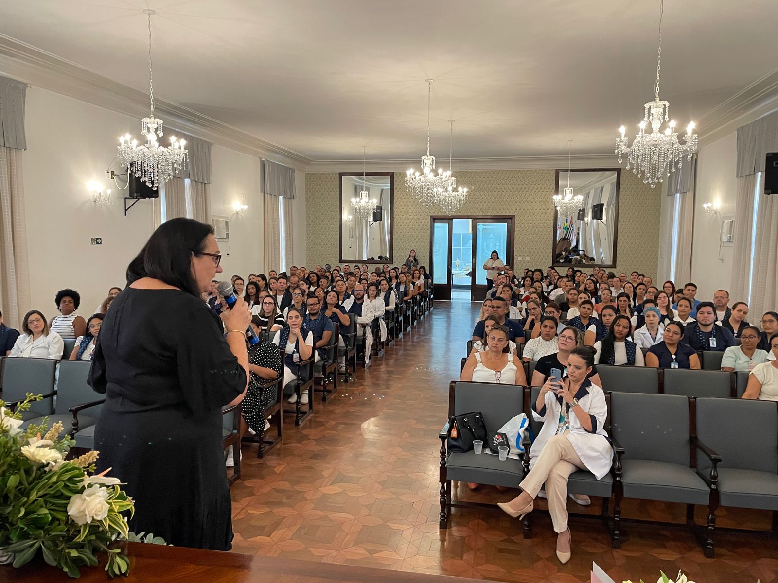 Rita Rocha aproveitou a oportunidade para falar de alguns projetos, como o retorno da folga de aniversário, que beneficiava colaboradores assíduos, mencionando como exemplo o enfermeiro Gilberto, o qual possui um histórico funcional admirável, sem nenhum afastamento nos últimos 5 anos.