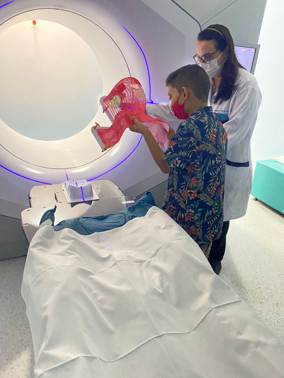 A Radioterapia Pediátrica é um dos procedimentos mais delicados do serviço e requer cuidado especial, que inclui uma simulação com envolvimento de equipe multiprofissional, formada por anestesista e oncopediatra, além de profissionais de enfermagem e de toda equipe da Radioterapia.