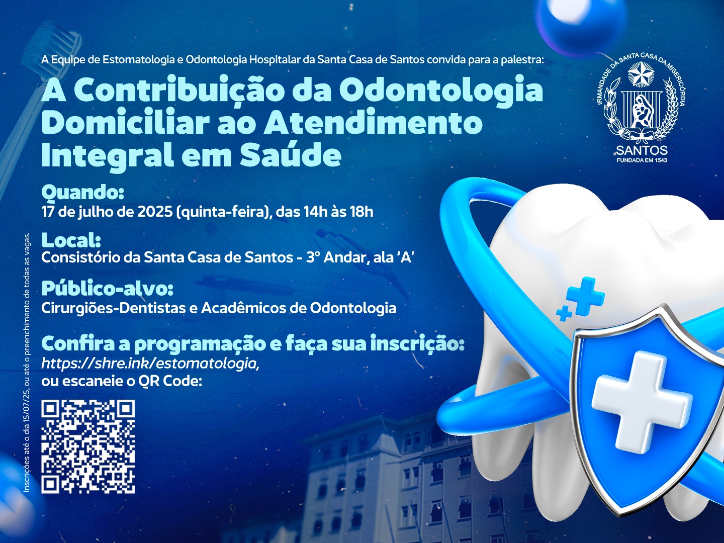 A Equipe de Estomatologia e Odontologia Hospitalar da Santa Casa de Santos convida cirurgiões-dentistas e acadêmicos de Odontologia para o evento “A Contribuição da Odontologia Domiciliar ao Atendimento Integral em Saúde”, que será realizado no dia 17 de julho de 2025 (quinta-feira), das 14h às 18h, no Consistório da Santa Casa de Santos.