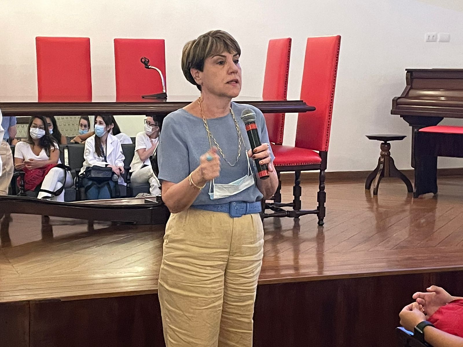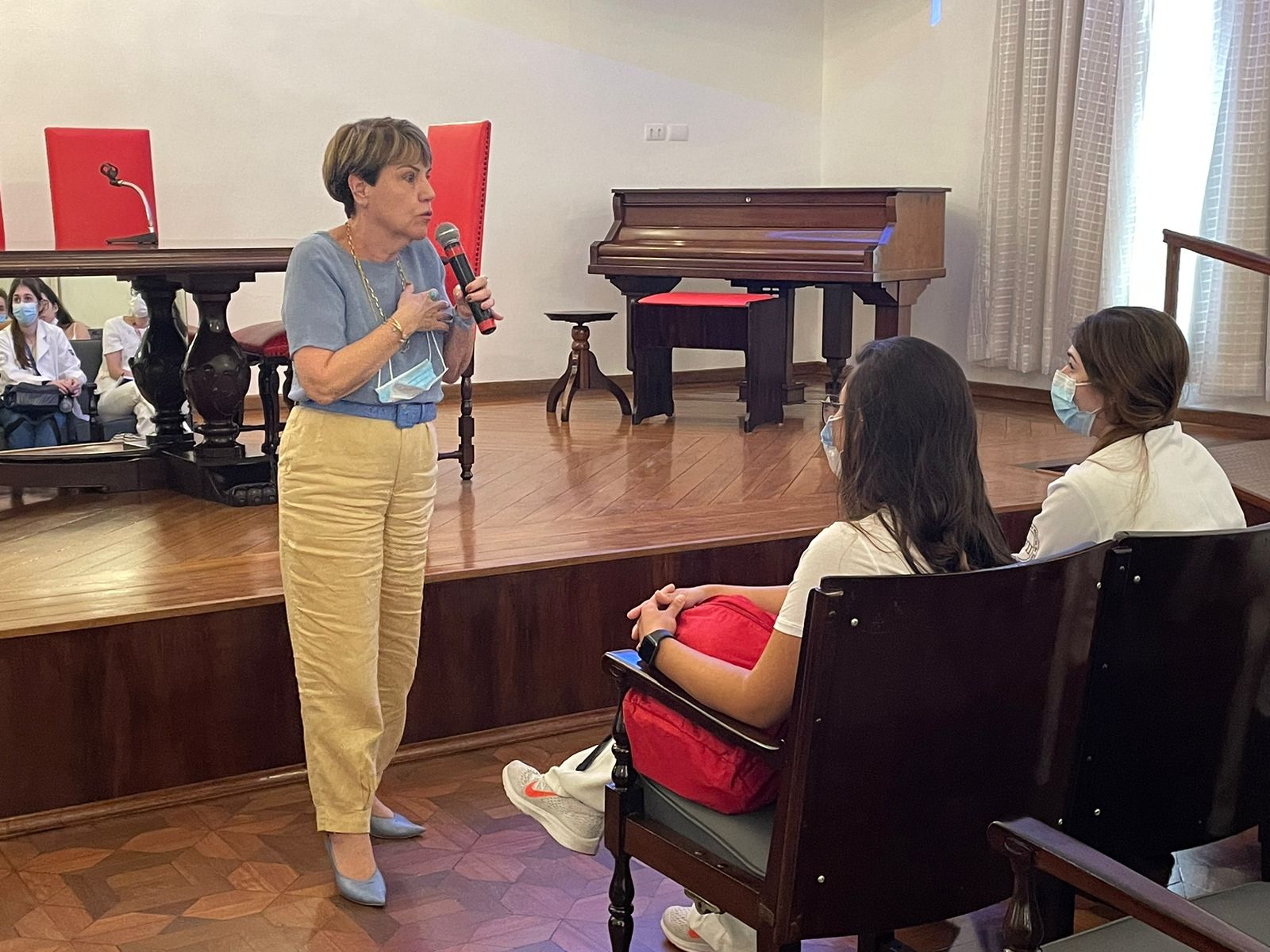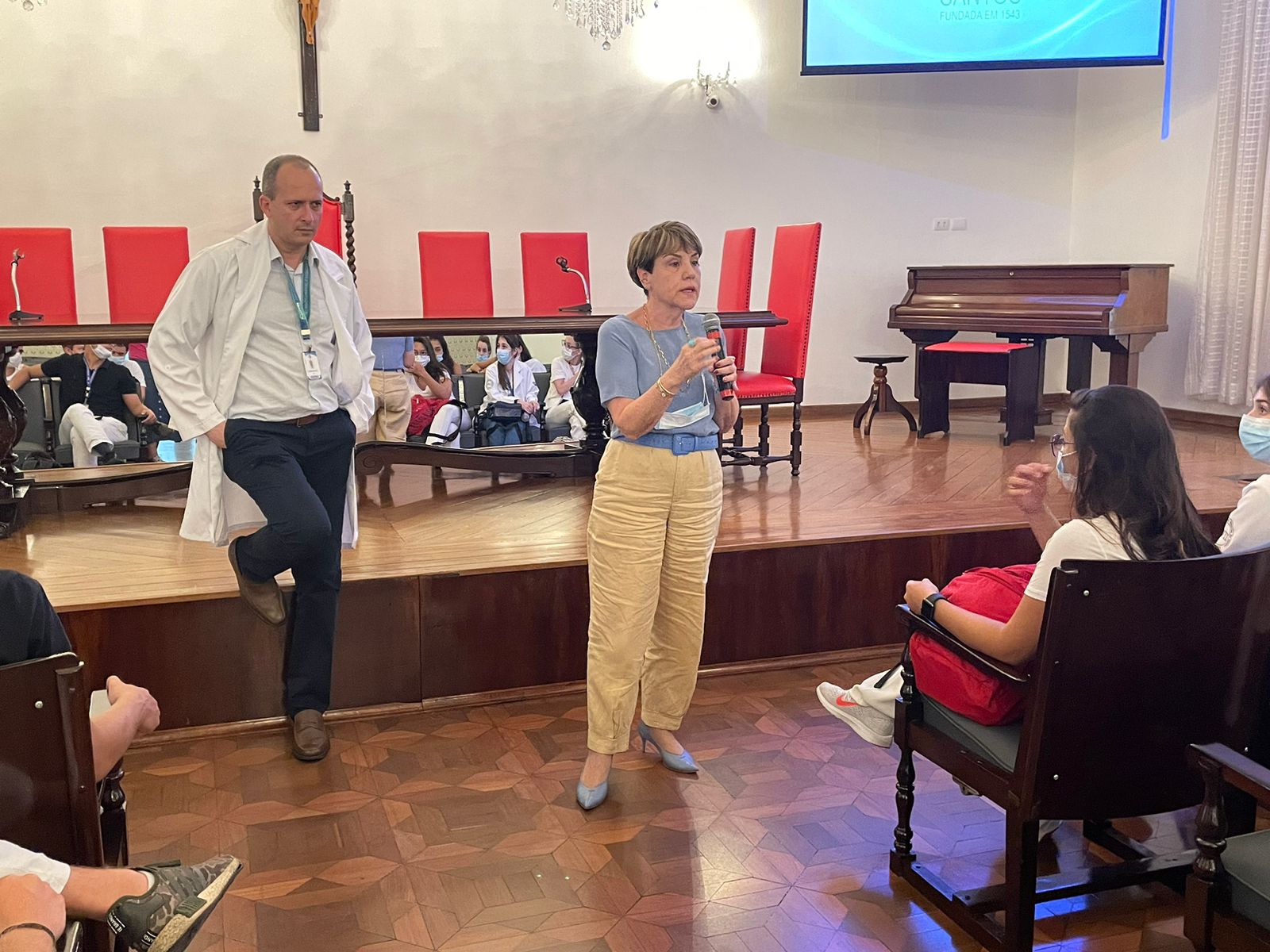 A presidente da CCQ e esposa do provedor do hospital, Srª. Eliana Lopes Feliciano, marcou presença e também participou explanando sobre algumas dúvidas levantadas pelos estudantes.