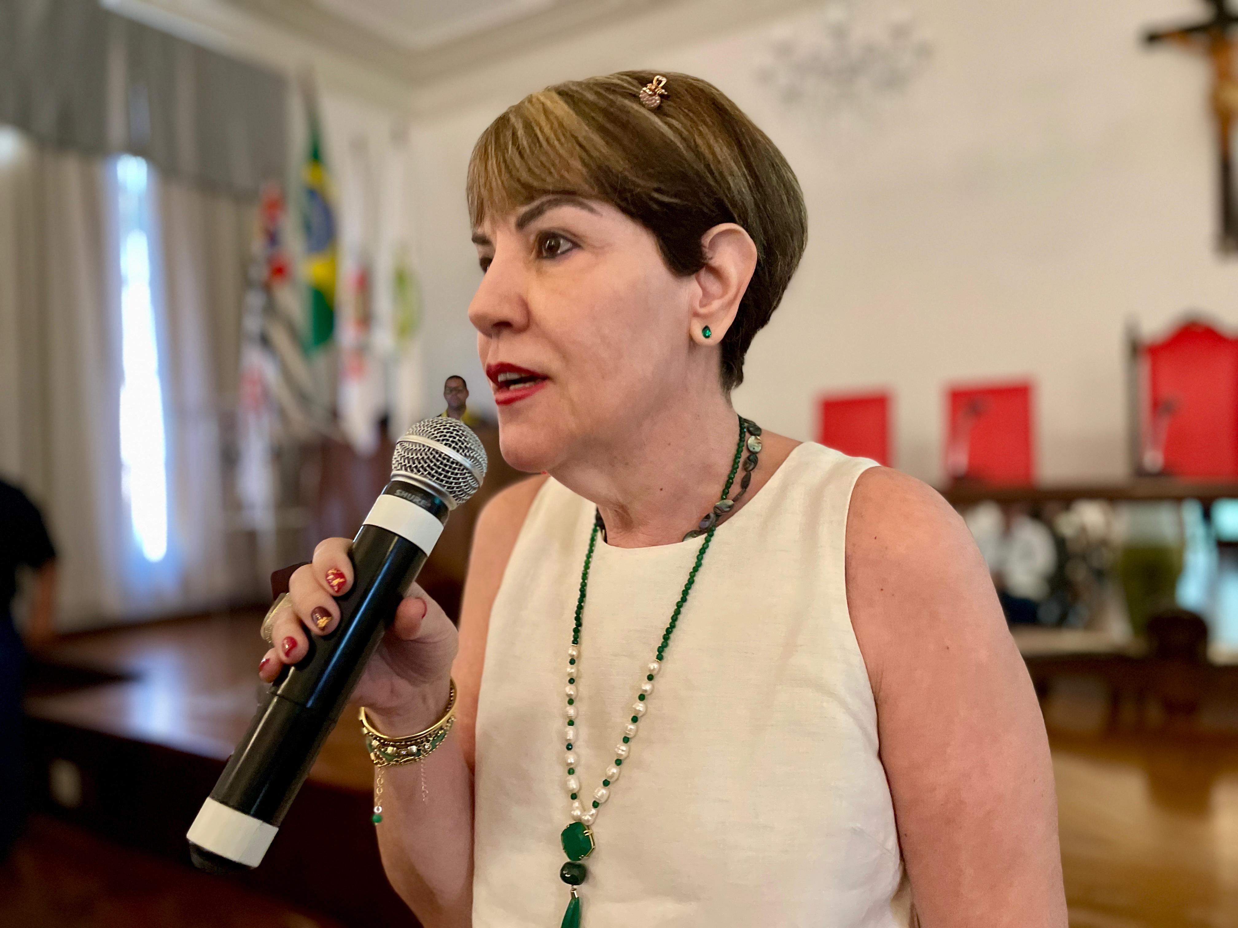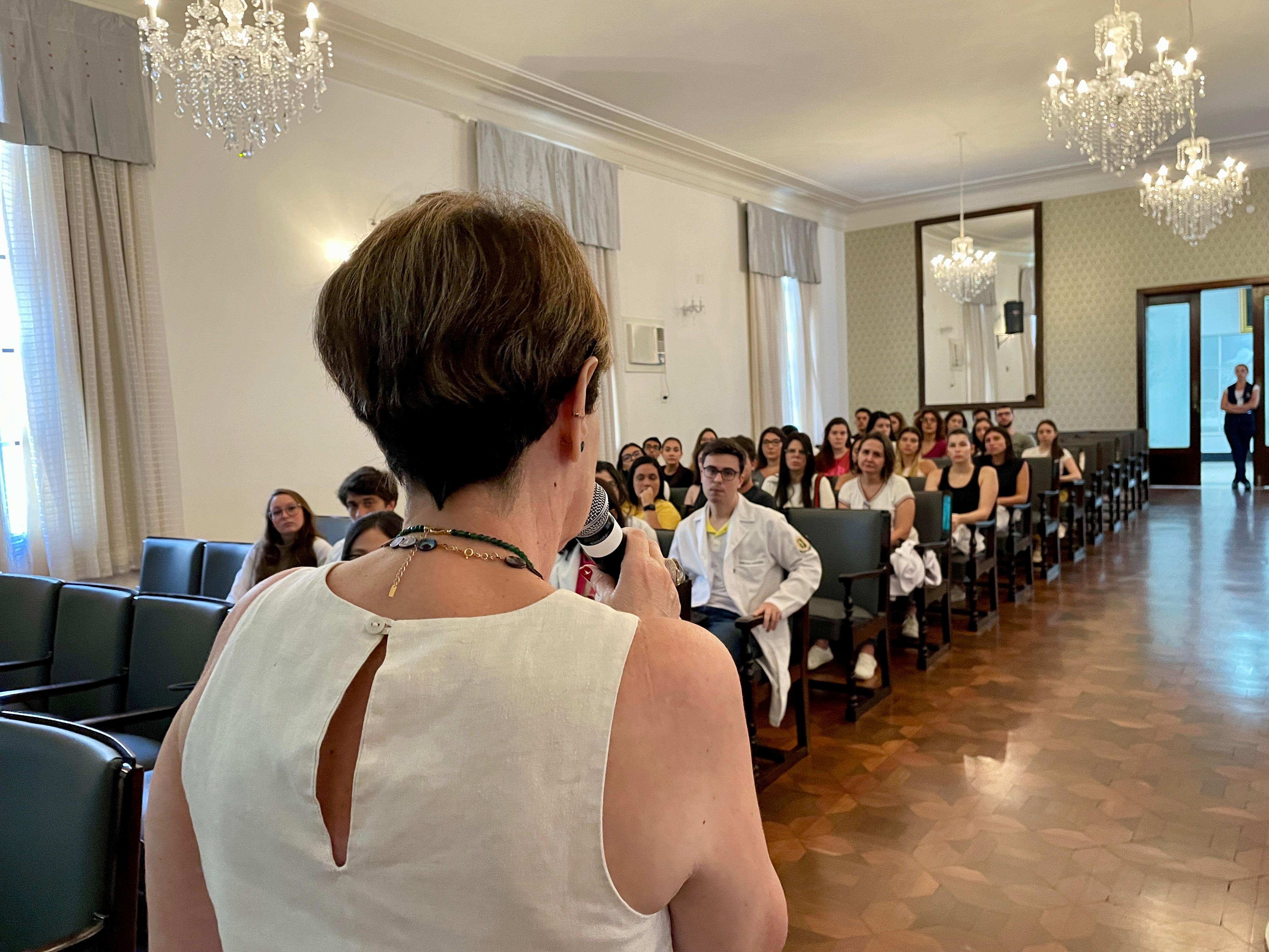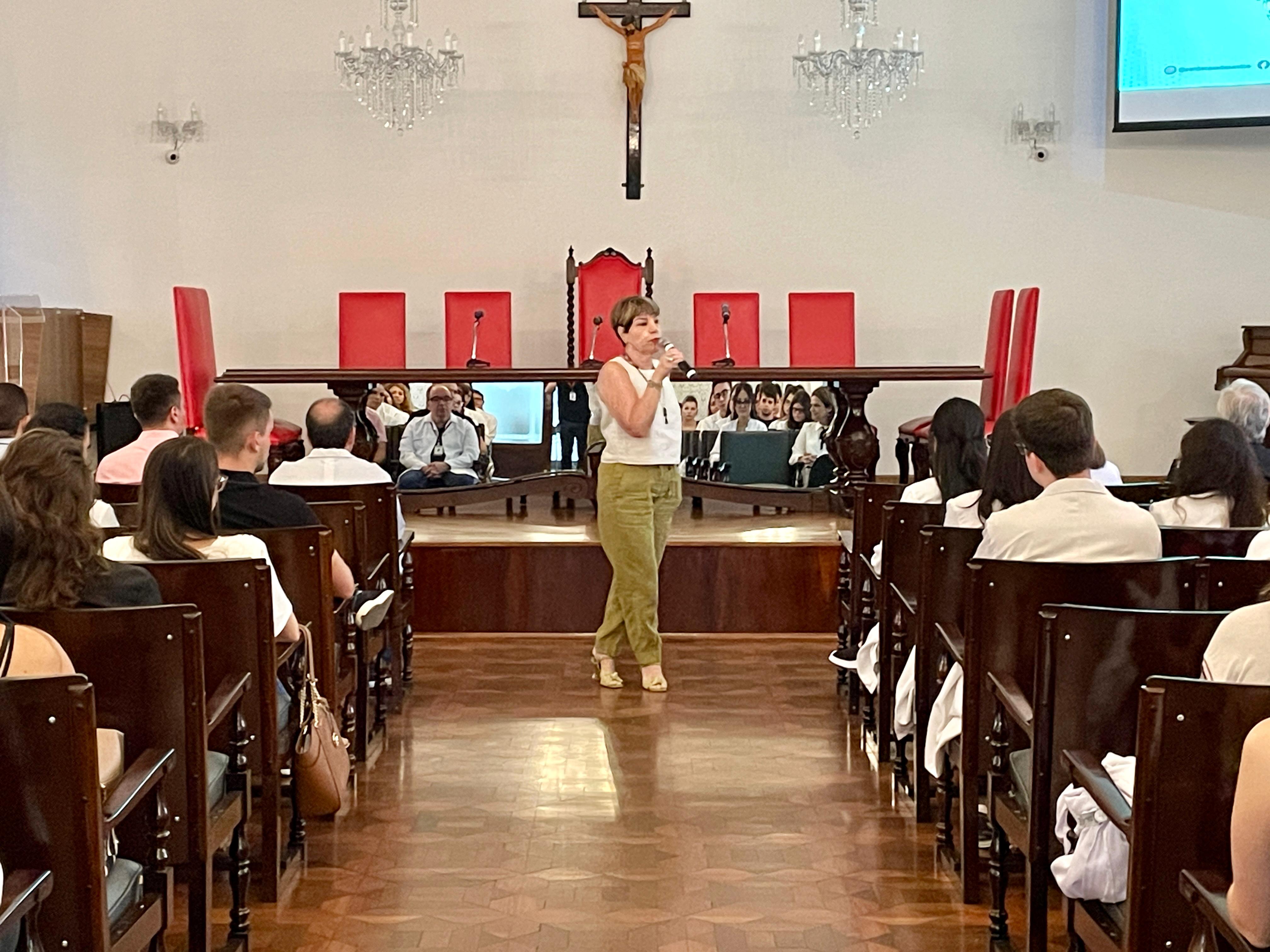 Em seguida, o diretor clínico, Dr. Constantino Kader Conde, passou a palavra à pró-reitora acadêmica, Profª. Drª. Elaine Marcílio Santos, que desejou um ótimo internato aos estudantes.