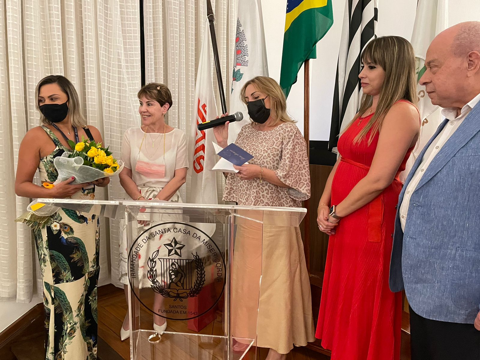 O provedor Ariovaldo Feliciano e a voluntária verdinha, Karilyn Lopes Feliciano, fizeram uma homenagem surpresa para a Presidente da Comissão de Controle da Qualidade (CCQ), Eliana Lopes Feliciano, enaltecendo o trabalho realizado na Santa Casa de Santos. Dona Eliana, como é carinhosamente conhecida, recebeu das mãos da gerente de enfermagem, Alessandra Shepis um buquê de flores, em agradecimento à atuação junto com a enfermagem do hospital.