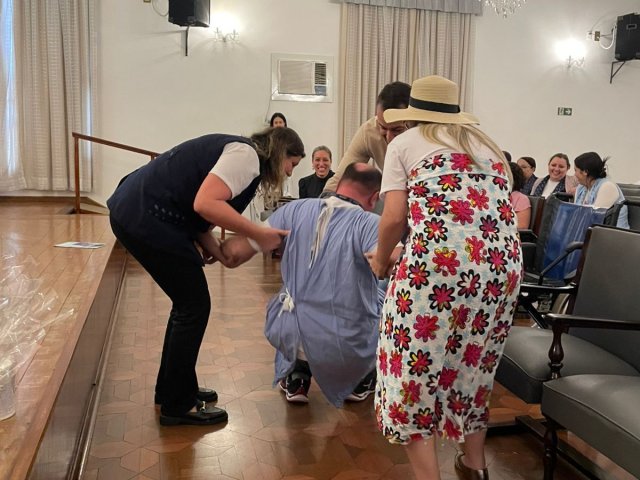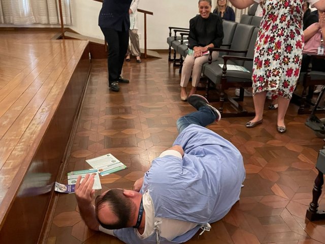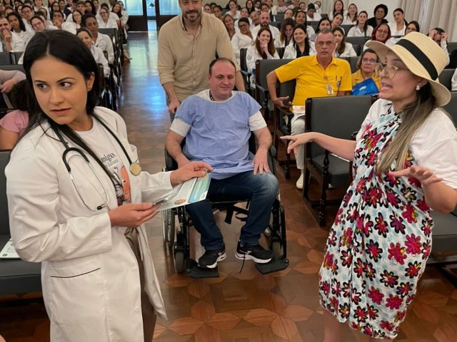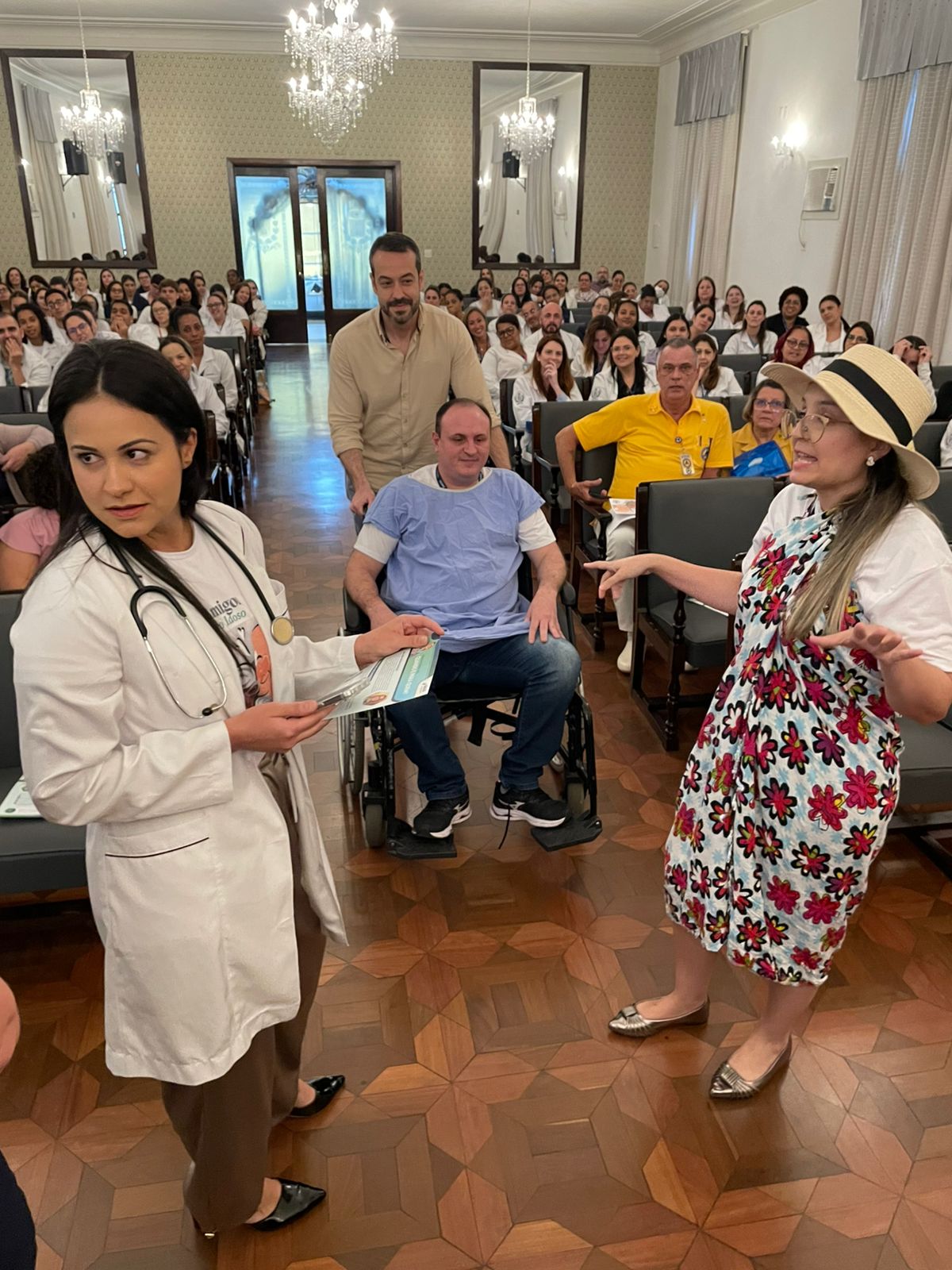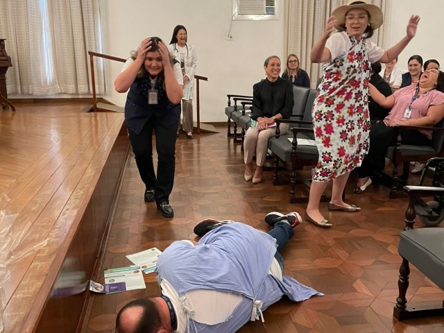No decorrer da programação, a equipe apresentou uma peça teatral que simulou a entrada de um paciente idoso no hospital. A encenação retratou a situação de uma queda sofrida pelo paciente, ilustrando de forma prática os desafios enfrentados no atendimento e reforçando a importância da atenção, da prevenção e da atuação rápida da equipe multiprofissional.