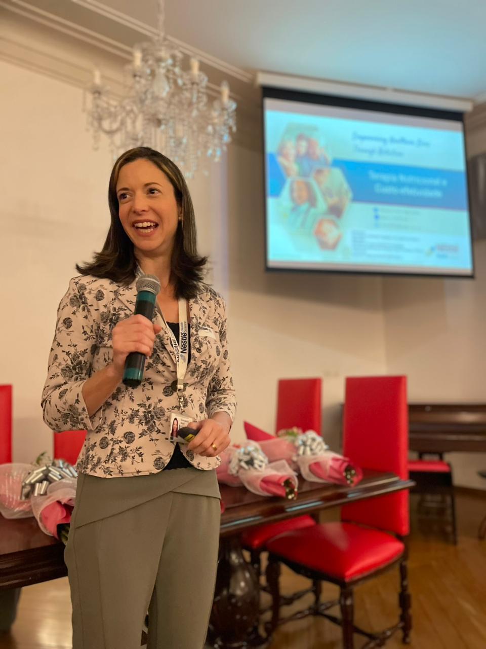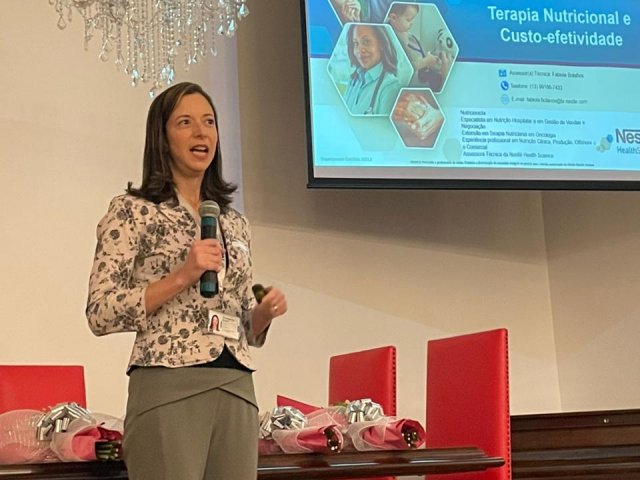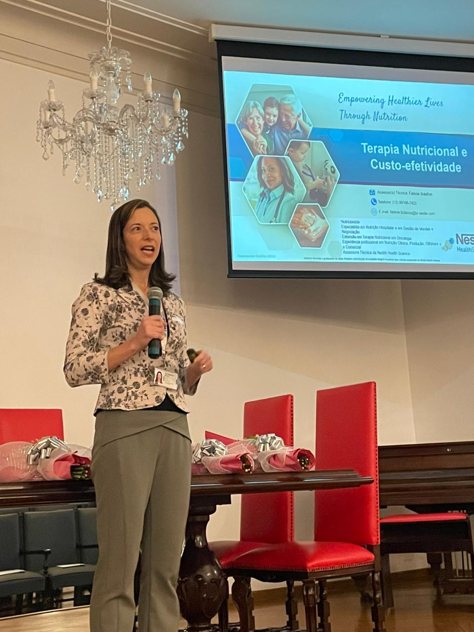 A primeira palestra do dia, ministrada por Fabíola Bolaños, representante da Nestlé, e pela nutricionista clínica hospitalar Isabella Robles Brasil Silveira, que abordaram “A importância da alimentação e suplementação no acompanhamento do paciente idoso”. As especialistas ressaltaram o impacto direto da nutrição adequada na prevenção de doenças e na recuperação hospitalar dos idosos, destacando a sarcopenia, desnutrição e lesão por pressão.