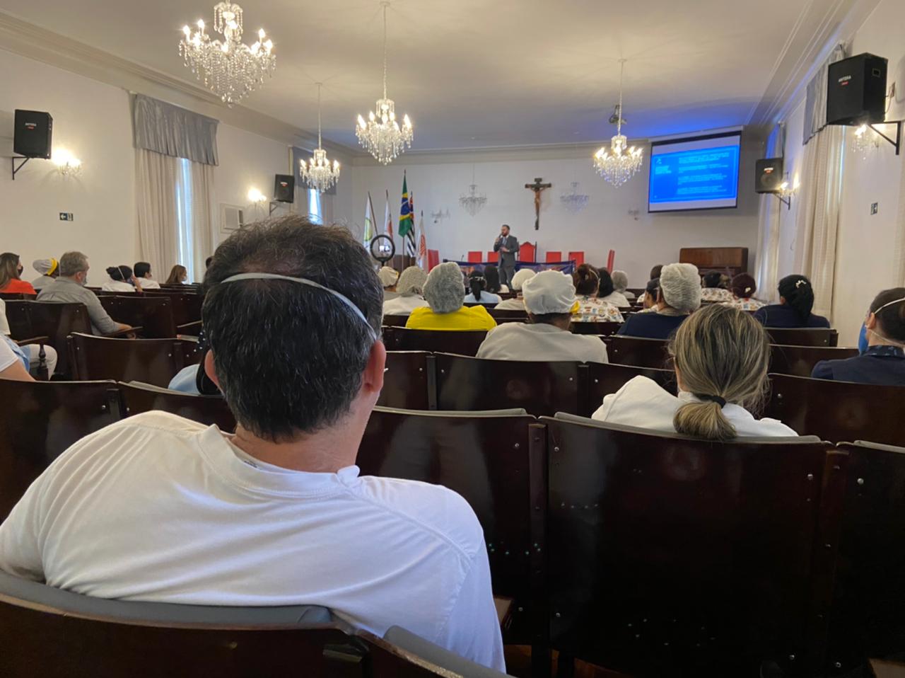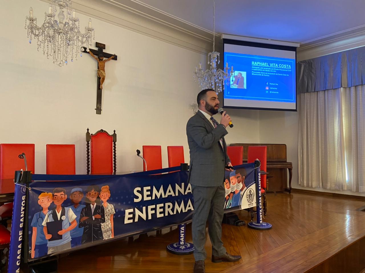 A Semana da Enfermagem 2021 da Santa Casa de Santos está sendo um sucesso de público e com participação interativa dos profissionais. Ontem, dia 17/5, o provedor Ariovaldo Feliciano fez a abertura do evento, no Consistório da Irmandade, e apresentou o palestrante do dia, o Procurador Geral, advogado e especialista em redes sociais, Dr. Raphael Vita Costa. O provedor explicou ainda sobre evolução da internet, os perigos da fakenews e agradeceu aos profissionais de saúde por participarem do evento.