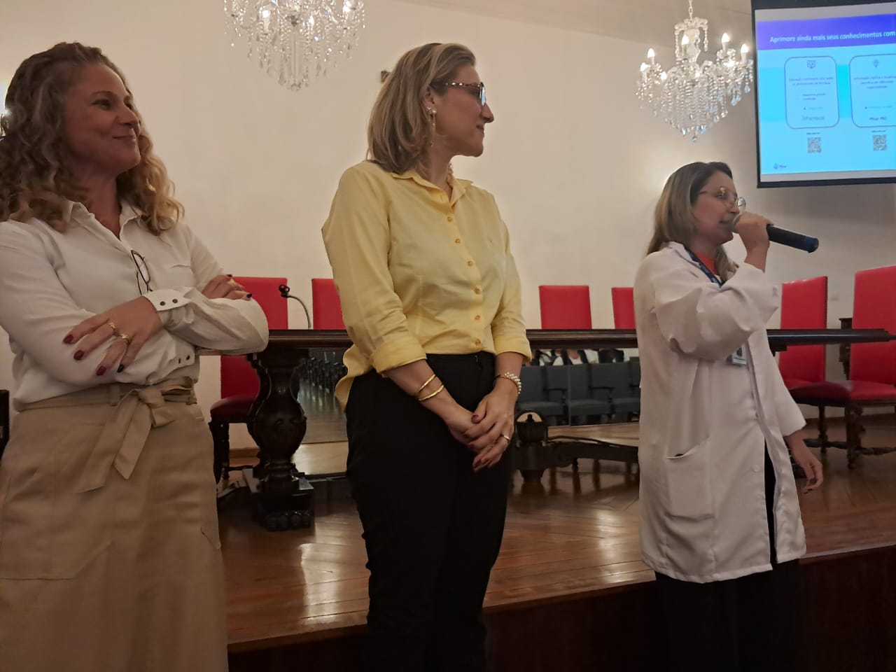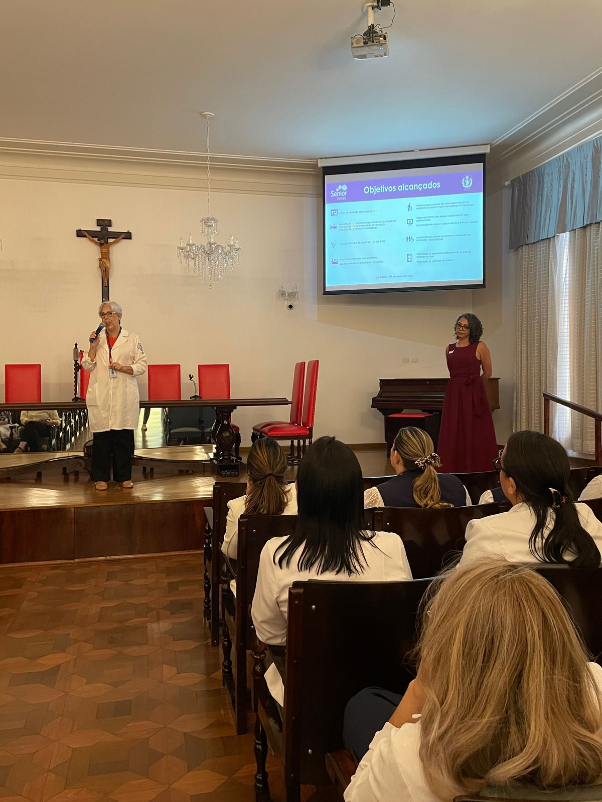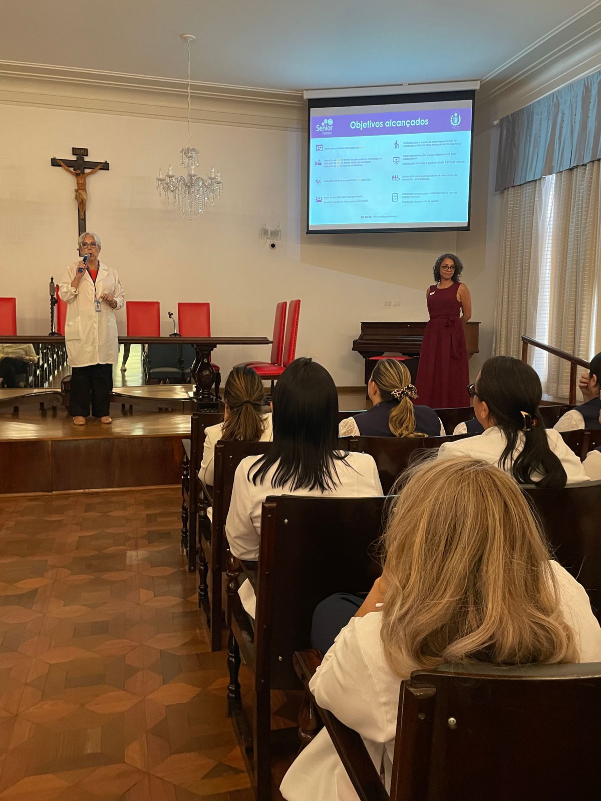 Em seguida, as enfermeiras do Núcleo Segurança do Paciente, Marcia Torelli, Amanda Antunes e a representante da Pfizer, Fernanda Espinoza, fizeram uma breve apresentação abordando os objetivos alcançados com o curso, incluindo a redução de tempo de internação e índice de queda. Além de destacar o lado humanizado, com as rodas de conversas com acompanhantes e reuniões mensais com os membros do Comitê Selo Amigo do Idoso.