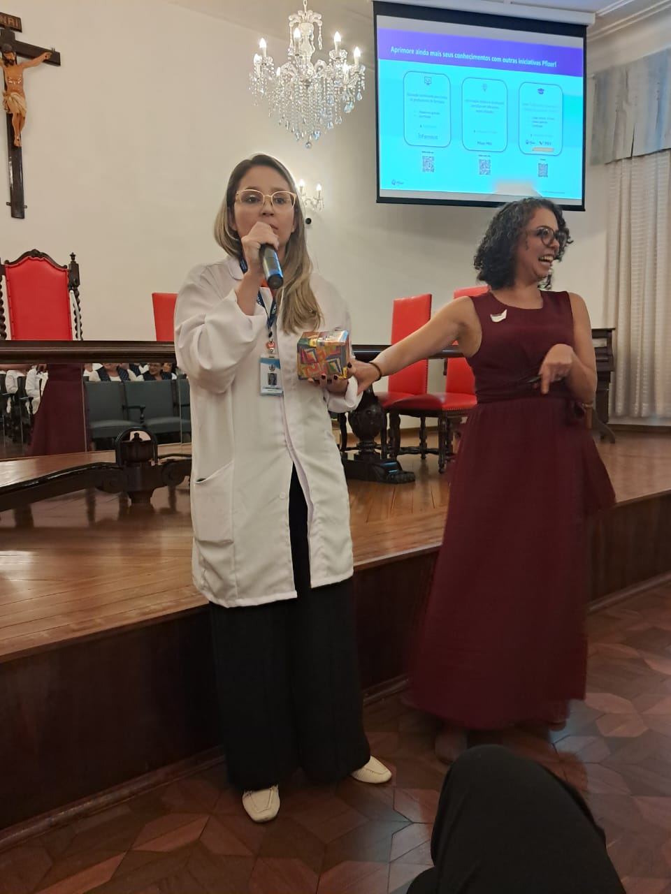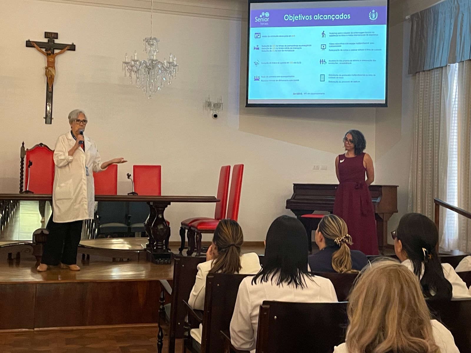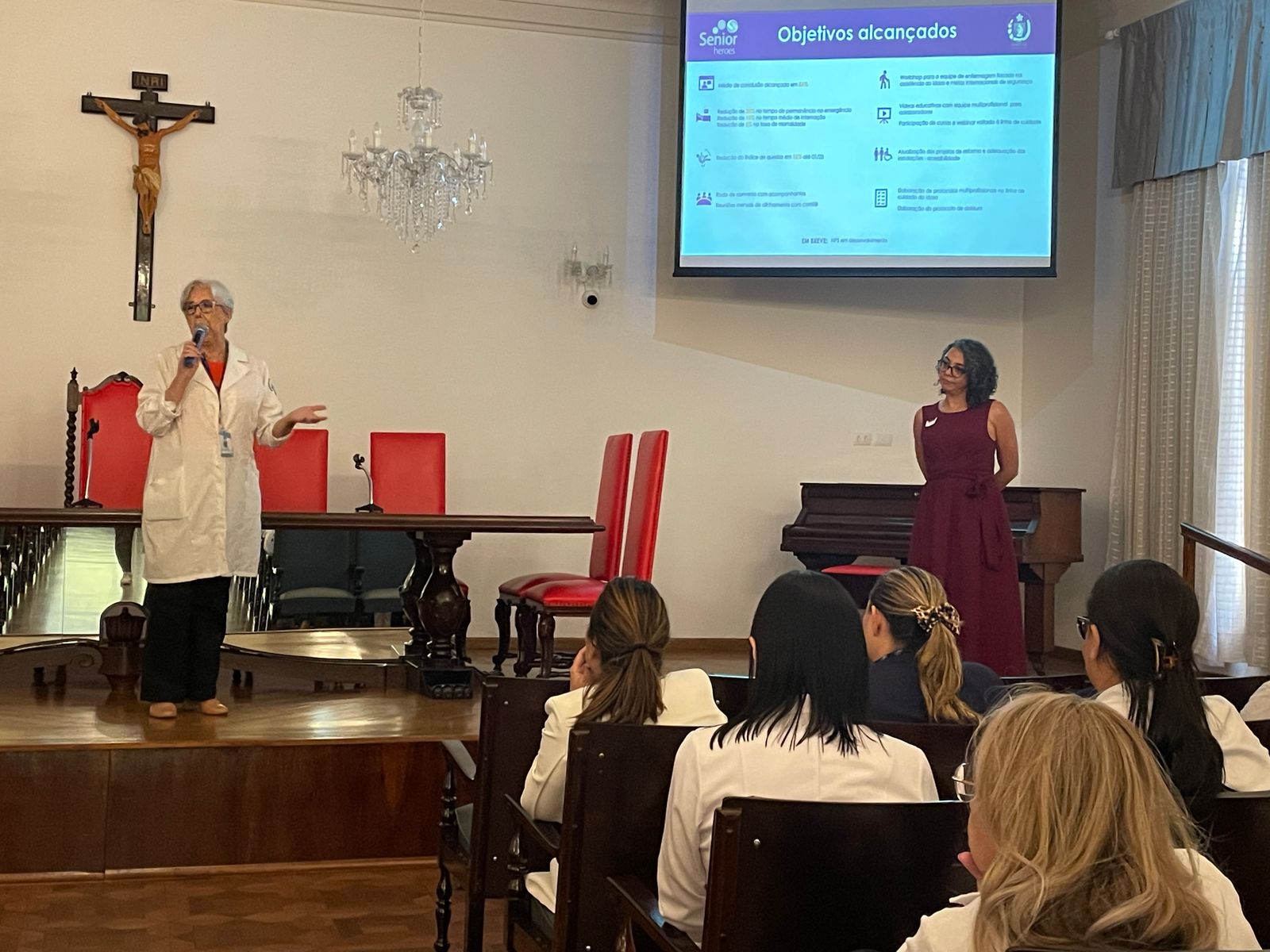 Em seguida, as enfermeiras do Núcleo Segurança do Paciente, Marcia Torelli, Amanda Antunes e a representante da Pfizer, Fernanda Espinoza, fizeram uma breve apresentação abordando os objetivos alcançados com o curso, incluindo a redução de tempo de internação e índice de queda. Além de destacar o lado humanizado, com as rodas de conversas com acompanhantes e reuniões mensais com os membros do Comitê Selo Amigo do Idoso.