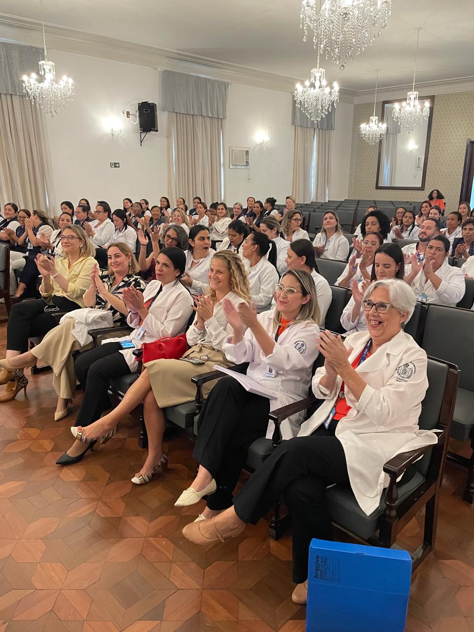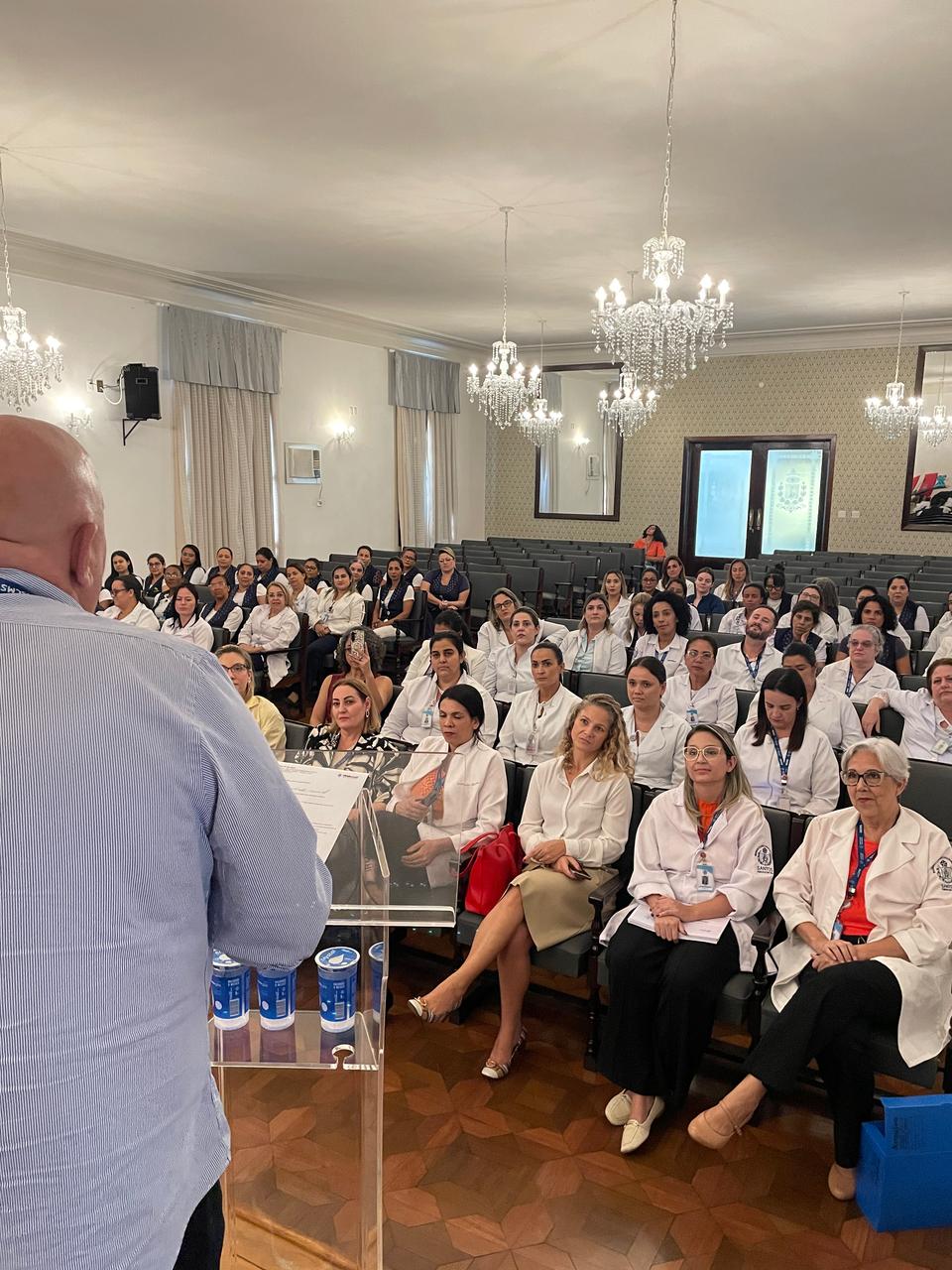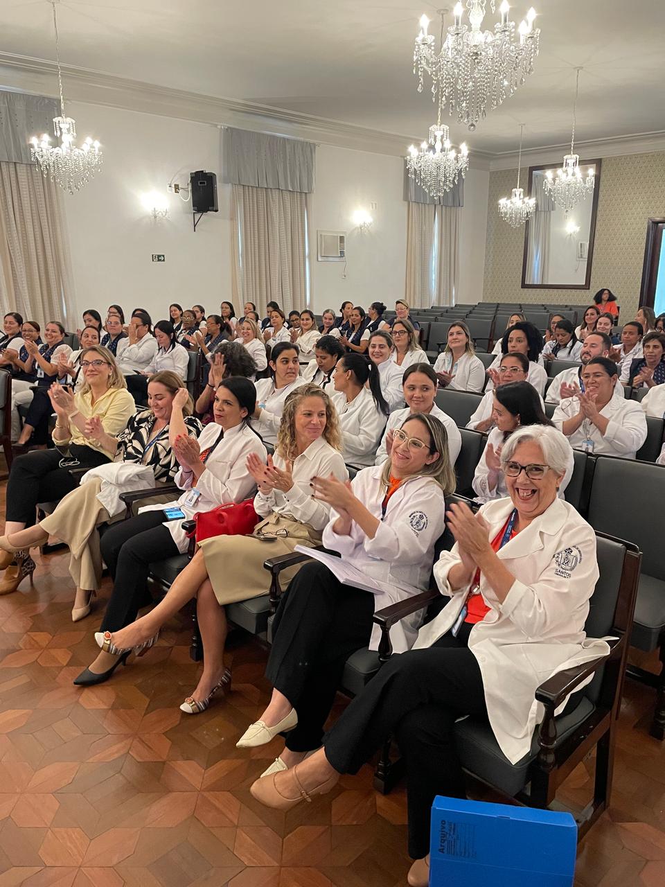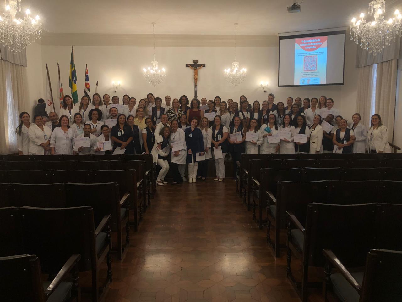 Na tarde de ontem, 16 de abril de 2025, no Consistório da Santa Casa de Santos, 87 profissionais receberam o certificado de conclusão do curso Amigo do Idoso. Este projeto, em parceria com a empresa Pfizer (Senior Heroes), iniciou há cerca de 9 meses, com 6 módulos, e capacitou equipes multiprofissionais para a linha de cuidados com os pacientes idosos.