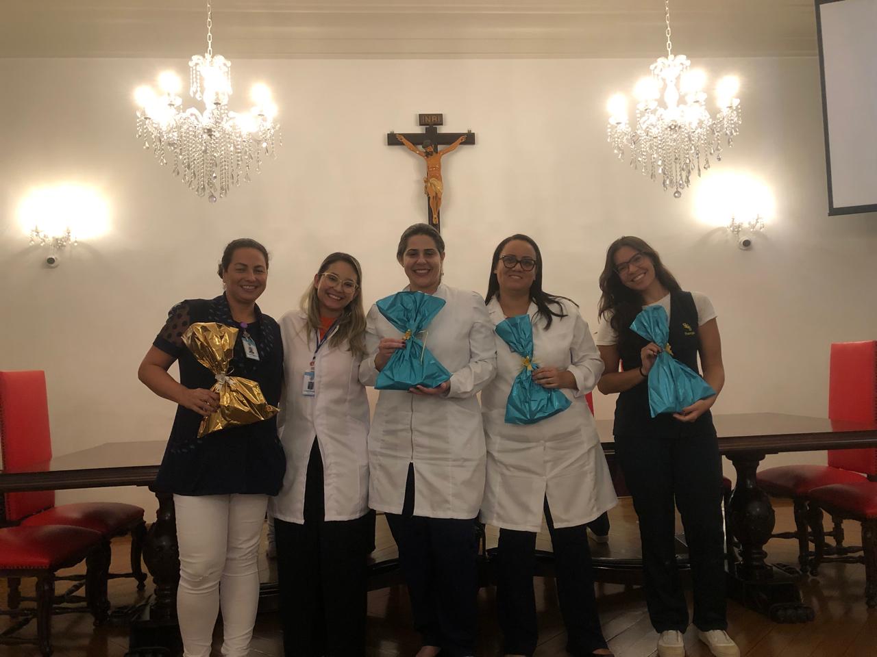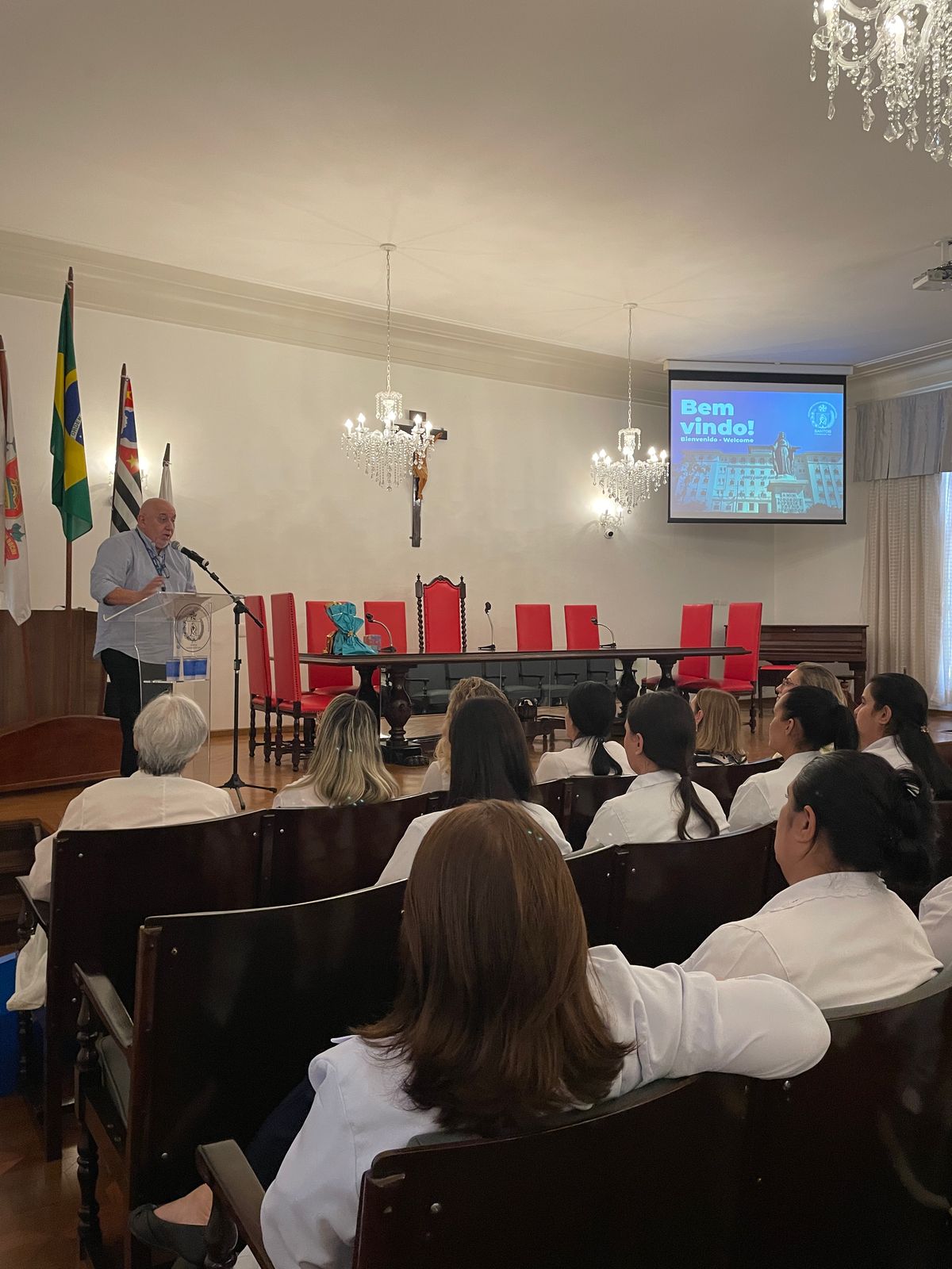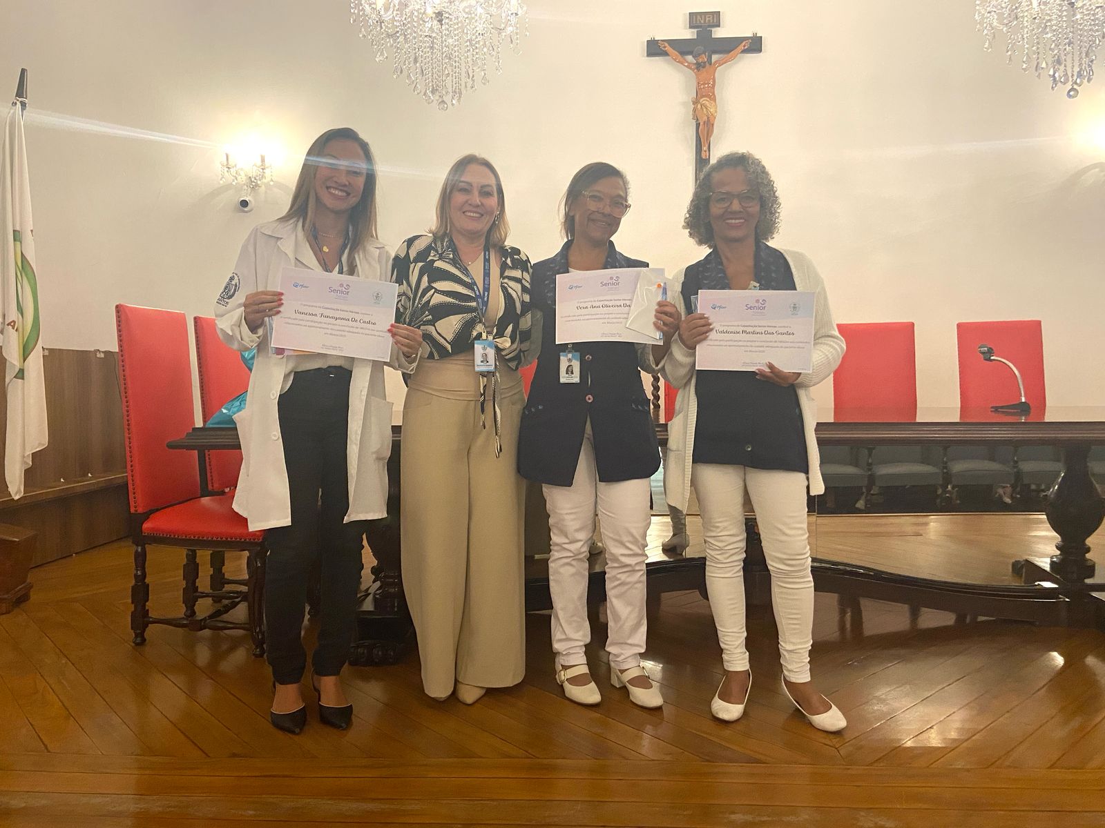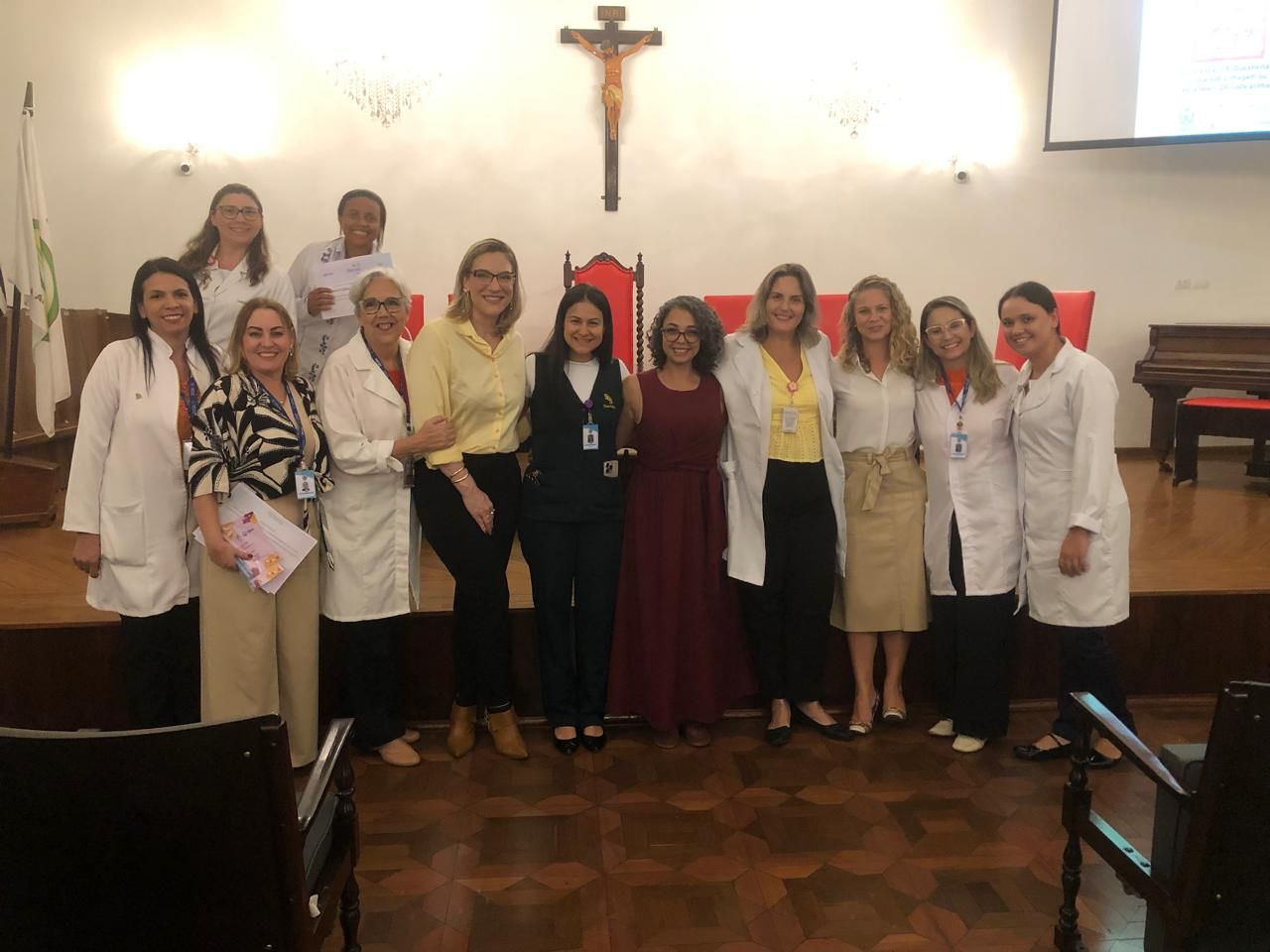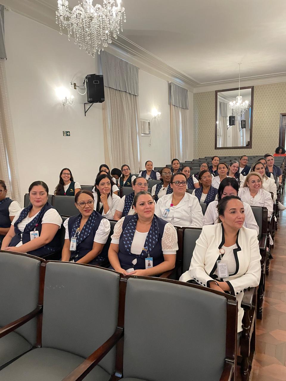 Na tarde de ontem, 16 de abril de 2025, no Consistório da Santa Casa de Santos, 87 profissionais receberam o certificado de conclusão do curso Amigo do Idoso. Este projeto, em parceria com a empresa Pfizer (Senior Heroes), iniciou há cerca de 9 meses, com 6 módulos, e capacitou equipes multiprofissionais para a linha de cuidados com os pacientes idosos.