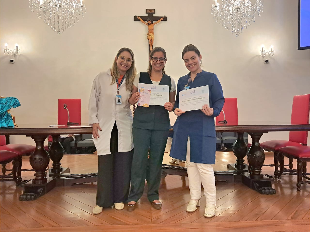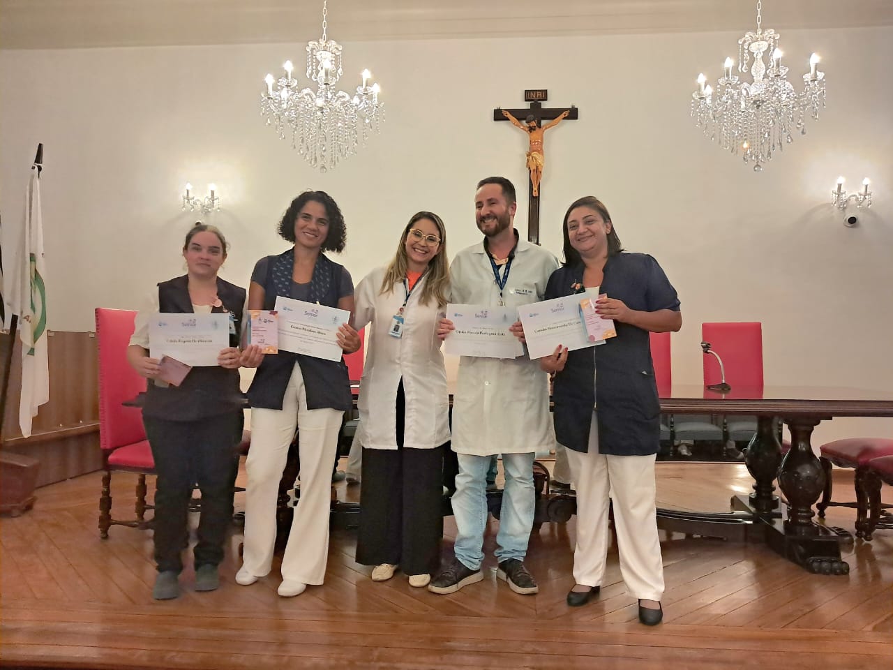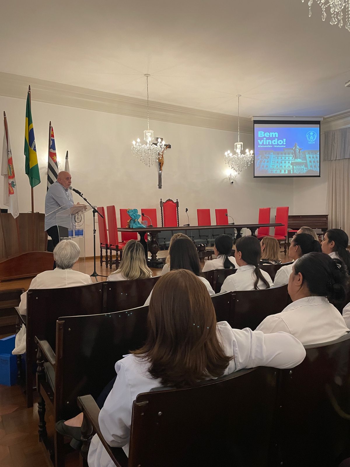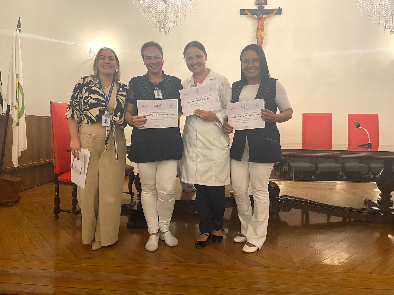 Na tarde de ontem, 16 de abril de 2025, no Consistório da Santa Casa de Santos, 87 profissionais receberam o certificado de conclusão do curso Amigo do Idoso. Este projeto, em parceria com a empresa Pfizer (Senior Heroes), iniciou há cerca de 9 meses, com 6 módulos, e capacitou equipes multiprofissionais para a linha de cuidados com os pacientes idosos.