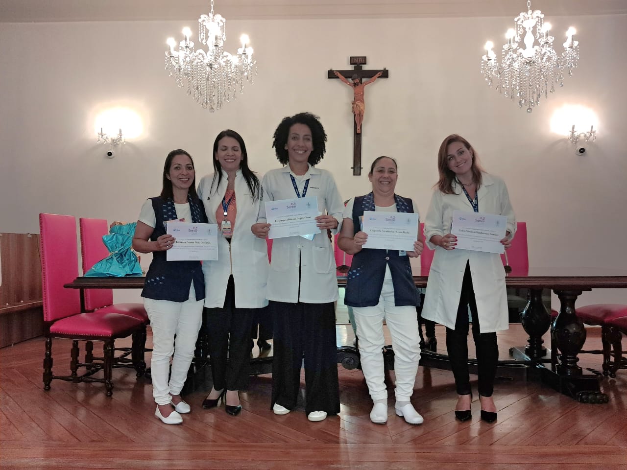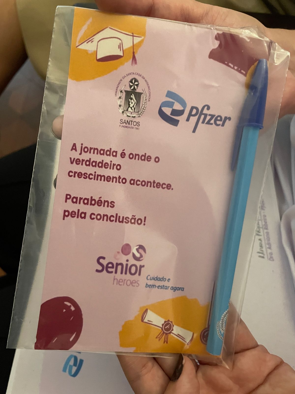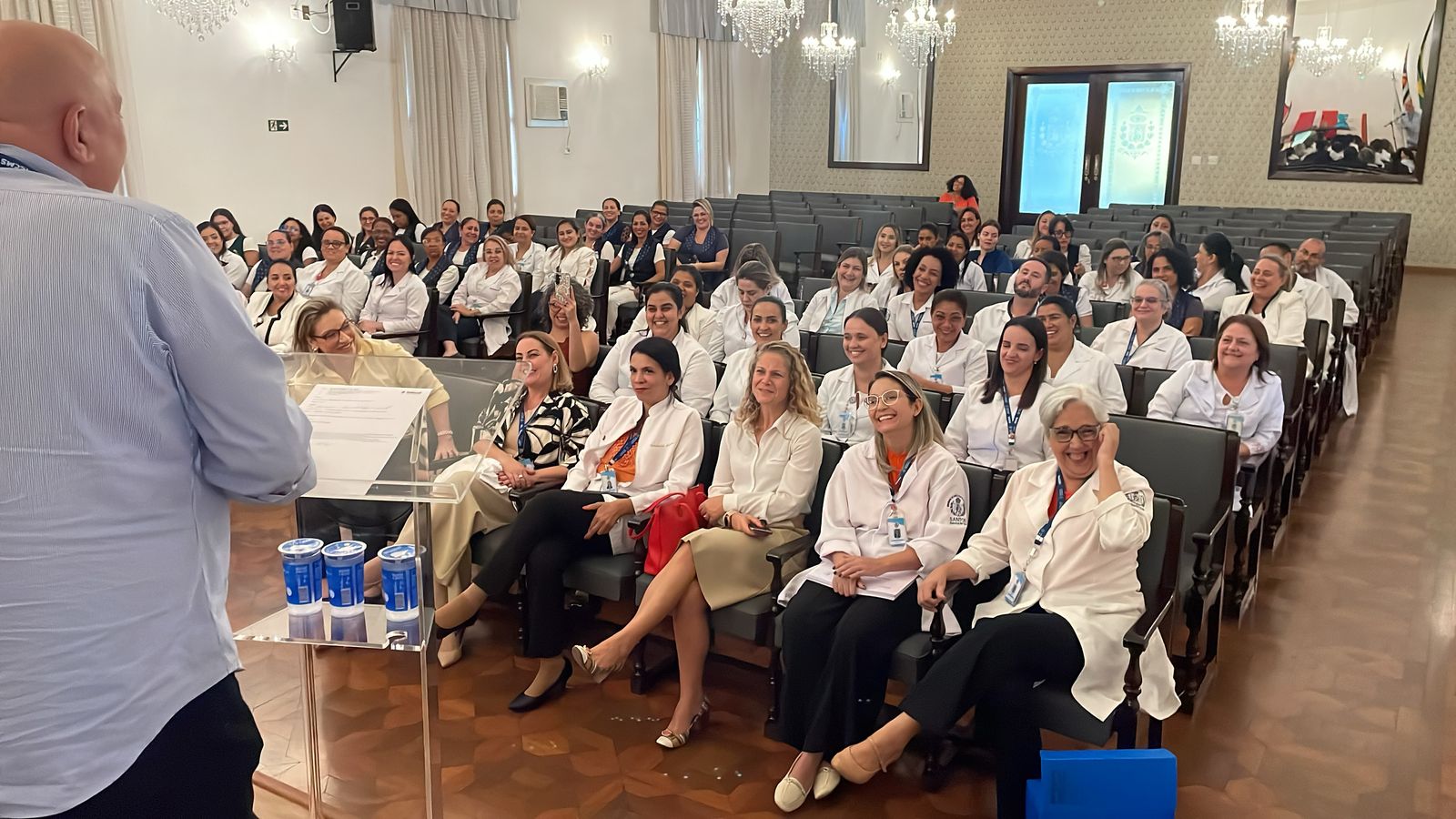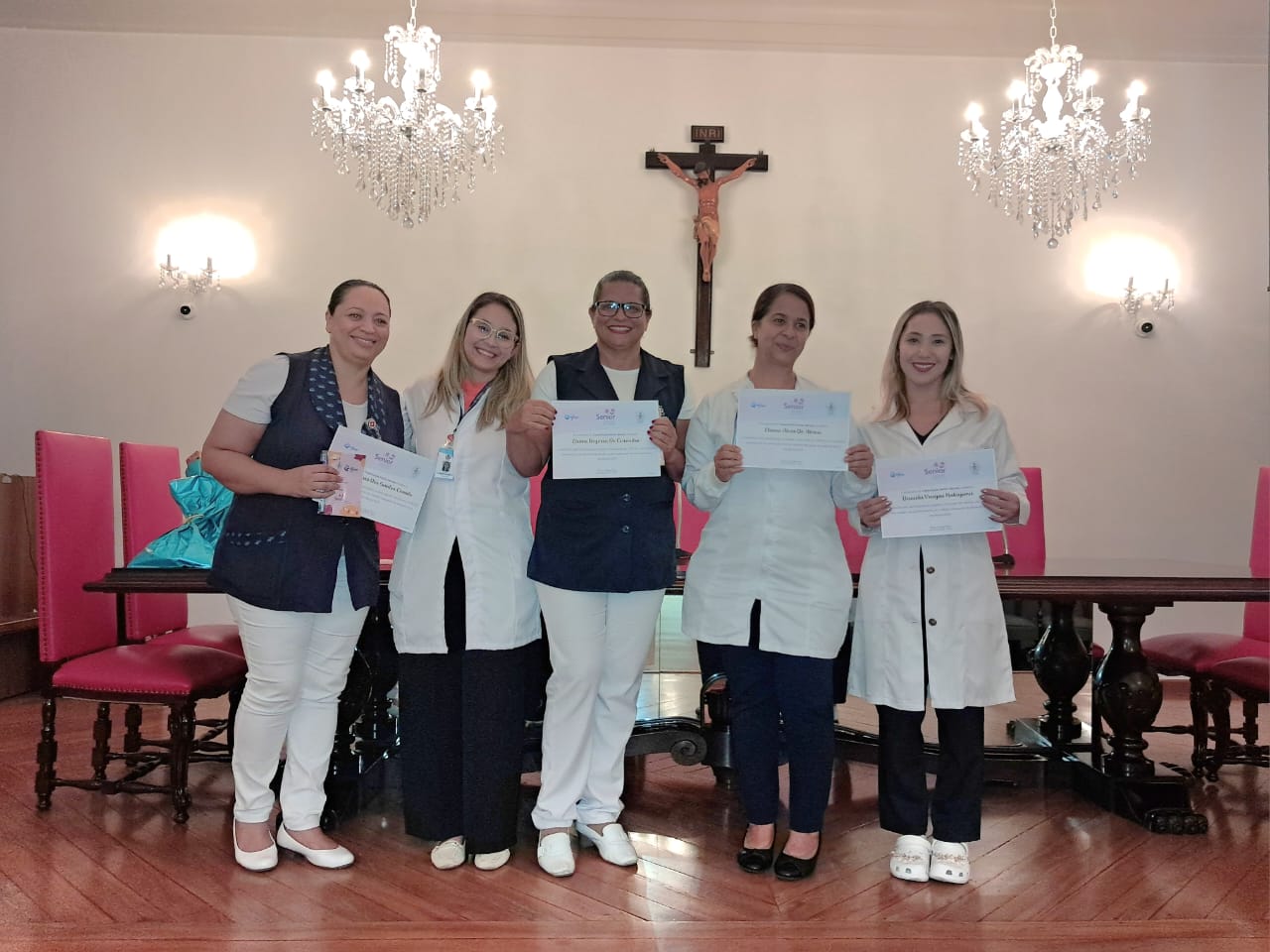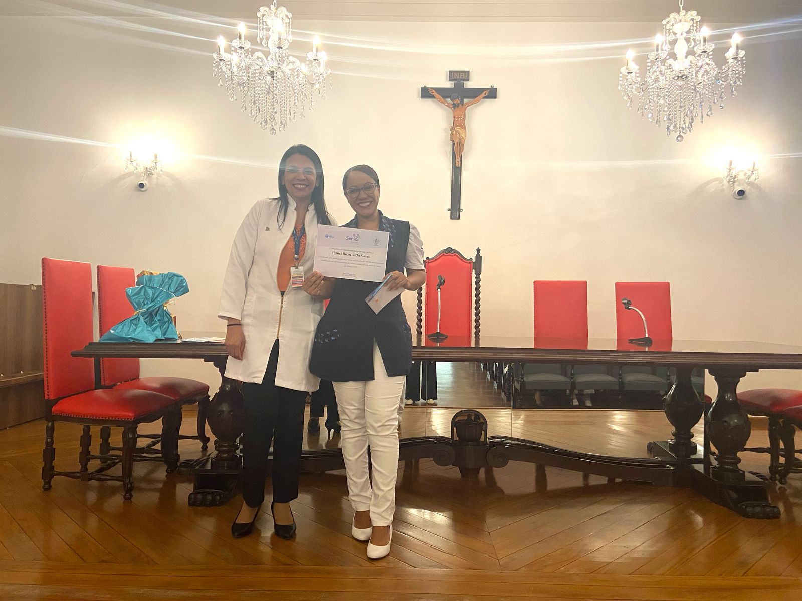Na tarde de ontem, 16 de abril de 2025, no Consistório da Santa Casa de Santos, 87 profissionais receberam o certificado de conclusão do curso Amigo do Idoso. Este projeto, em parceria com a empresa Pfizer (Senior Heroes), iniciou há cerca de 9 meses, com 6 módulos, e capacitou equipes multiprofissionais para a linha de cuidados com os pacientes idosos.