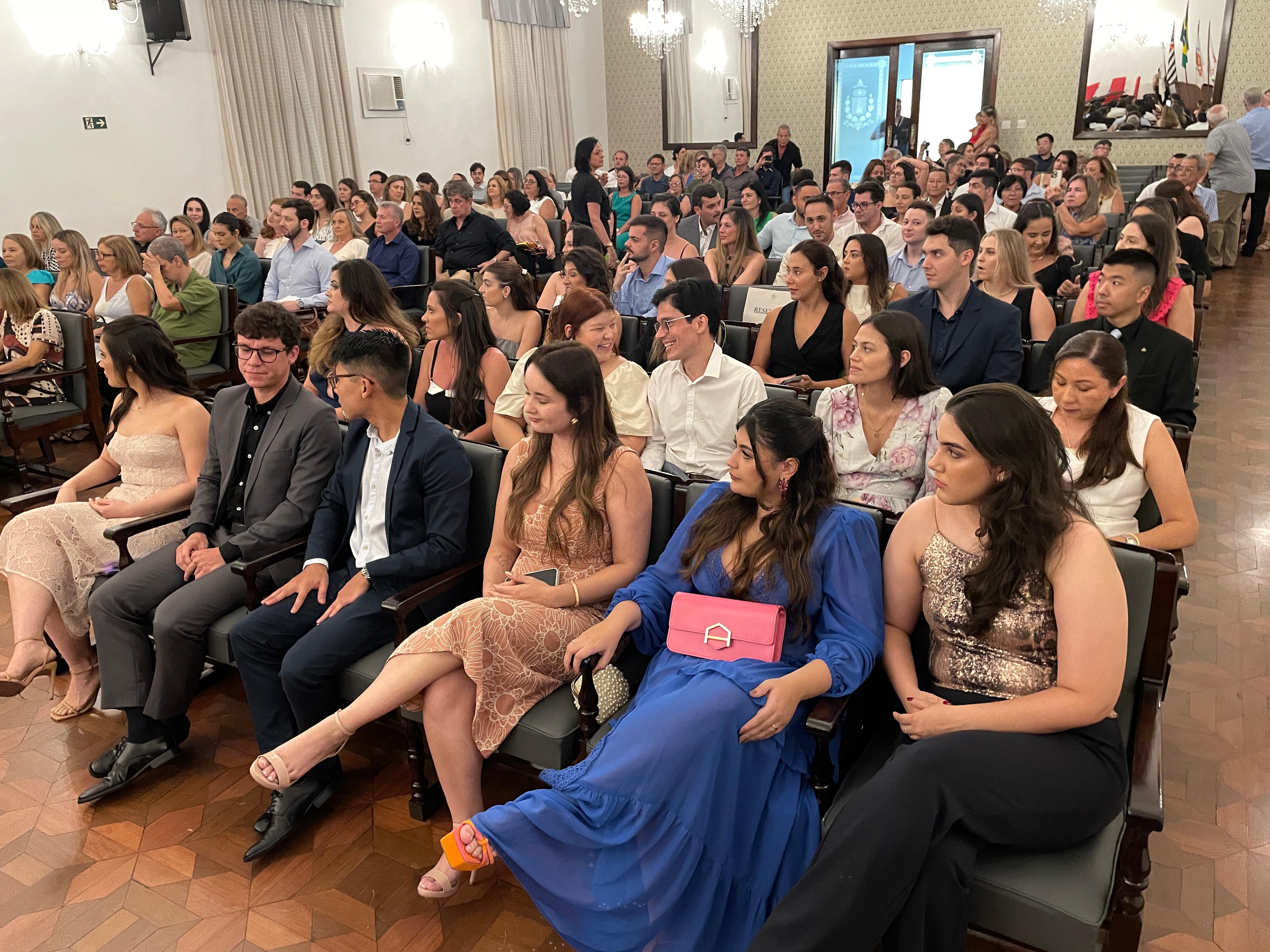 O Preletor, Dr. Gabriel Trindade, parabenizou os formandos e destacou que “Esse momento é muito especial, pois é o resultado de anos de estudo, dedicação e muitos plantões. Vocês serão recompensados por todo o trabalho exercido e que ainda exercerão na carreira. Hoje é um dia de muita alegria para vocês, para os familiares e amigos”.