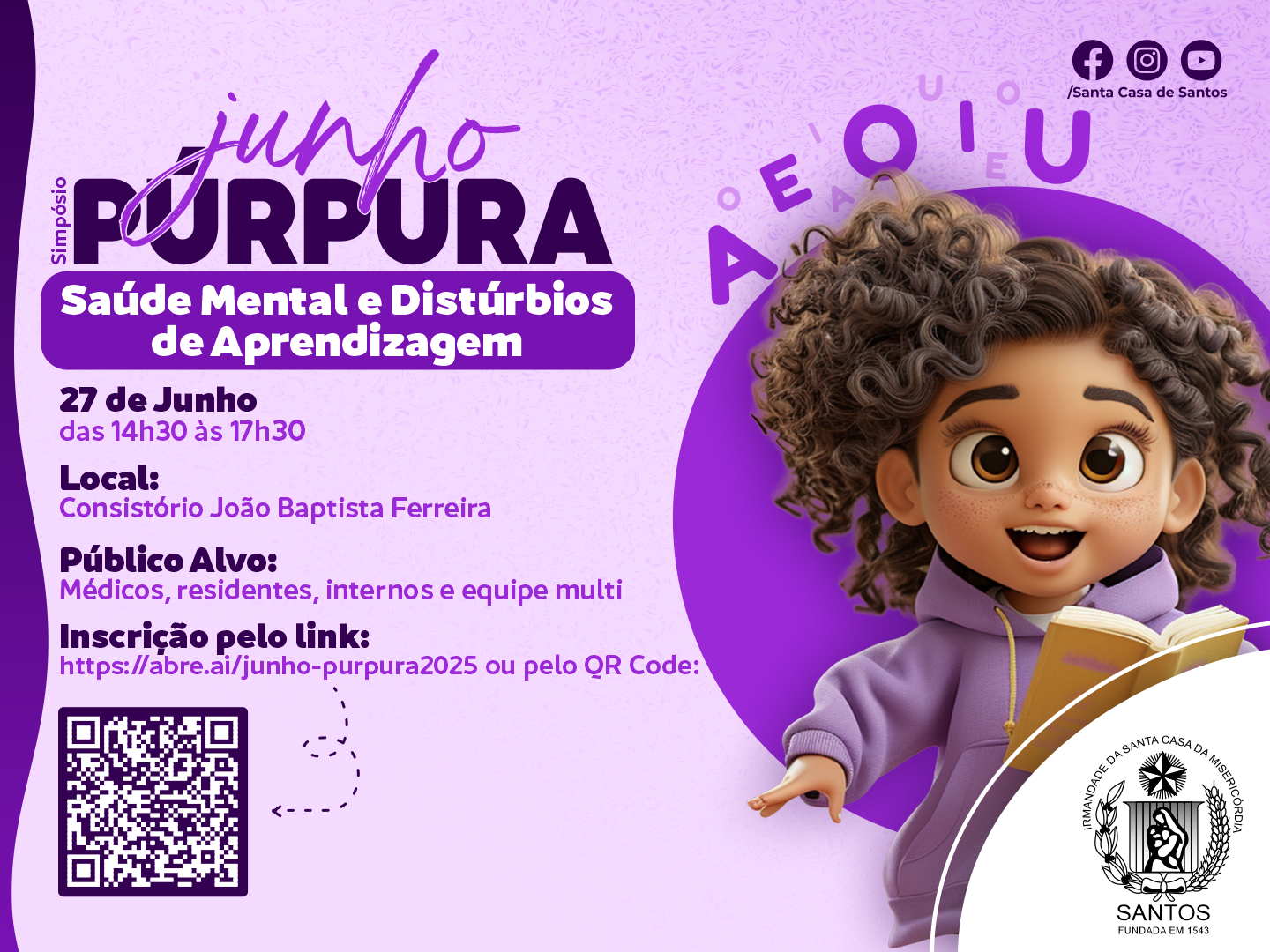Na Santa Casa de Santos, acontecerá o Simpósio do Junho Púrpura no dia 27 de junho, às 14h30, no Consistório da Instituição, organizado pelas Coodenadoras da Pediatria, Dra. Bruna Giaccomelli e Dra. Ana Luiza Dib.