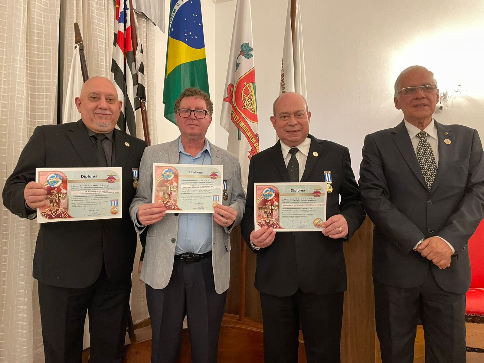 Em solenidade realizada no Consistório da Santa Casa de Santos, dia 27/5, o Provedor Ariovaldo Feliciano, o Diretor Clínico Constantino Kader Conde, o Diretor Técnico Alex Macedo Gonçalves e o próprio hospital, foram homenageados pelo Supremo Conselho do Grau 33º da Maçonaria para República Federativa do Brasil pelos serviços prestados, em especial durante a pandemia.