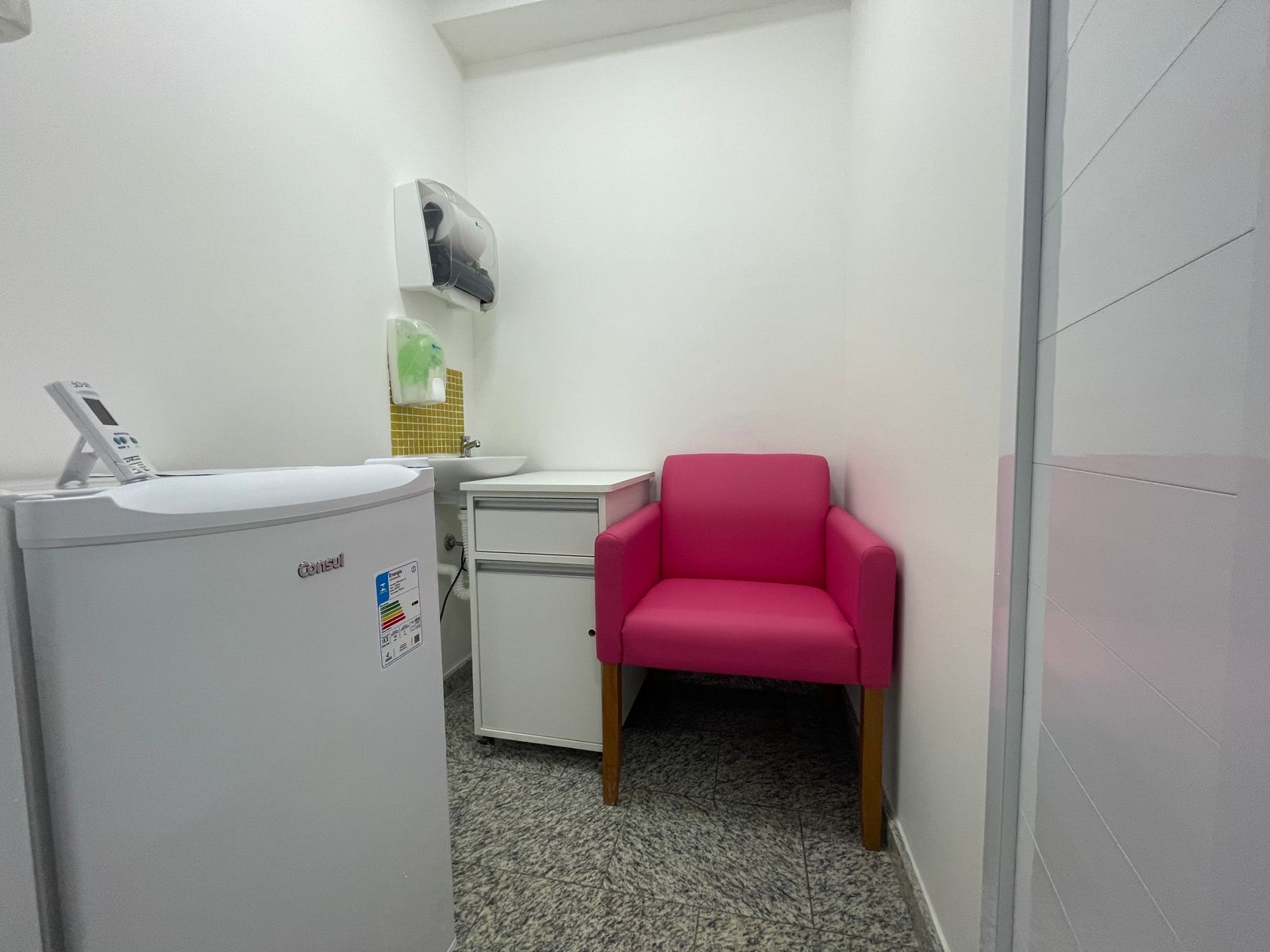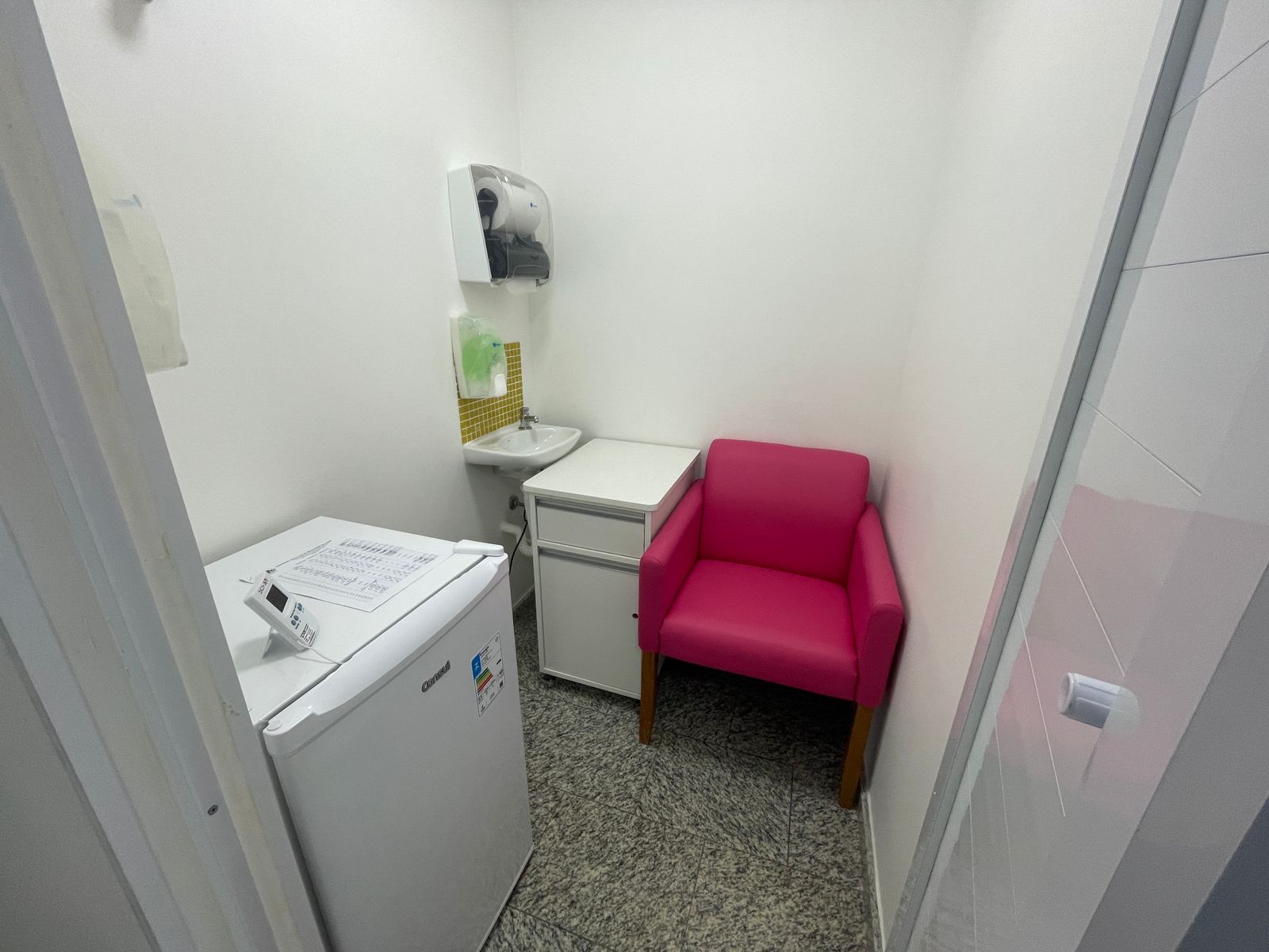 O local privativo possui poltrona e geladeira para armazenamento de leite materno para colaboradoras lactantes